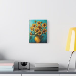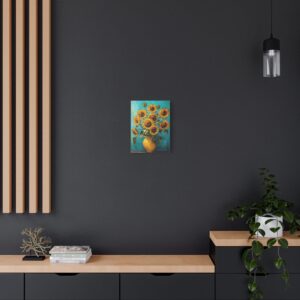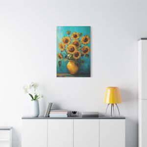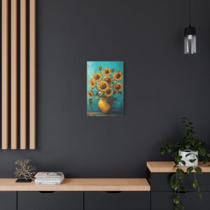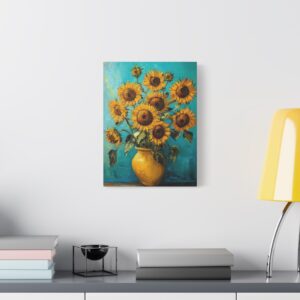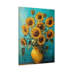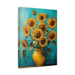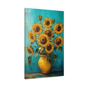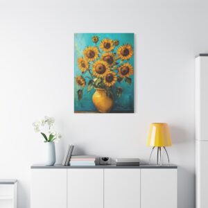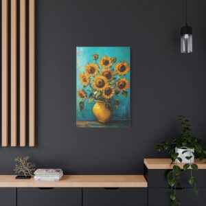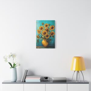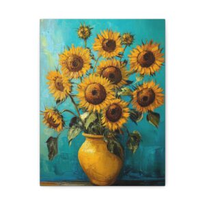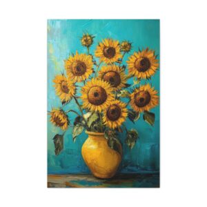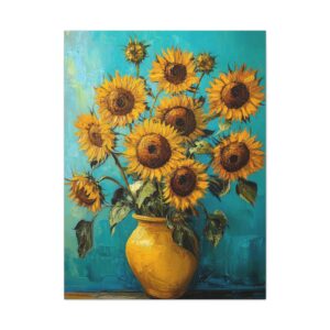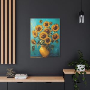 Accueillez la lumière et la chaleur des Tournesols de Van Gogh dans votre intérieur avec cette reproduction muséale d’exception. Les quinze tournesols, capturés dans leur vase en terre cuite, s’épanouissent avec une intensité saisissante sur un fond turquoise caractéristique du maître impressionniste.