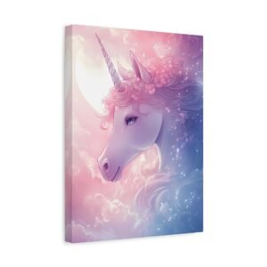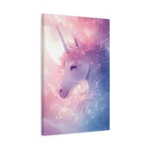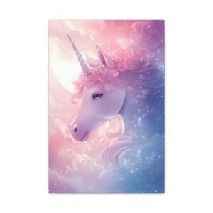 Transportez votre petite princesse dans un univers magique avec ce tableau Licorne Chambre Fille féerique. L’illustration enchantée dévoile une licorne majestueuse dans une ambiance nocturne apaisante, sa crinière fleurie flottant délicatement parmi les nuages roses et lilas. Les étoiles scintillantes et l’atmosphère onirique créent un monde merveilleux parfait pour une chambre d’enfant.