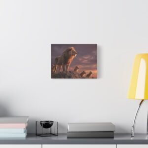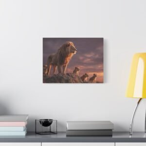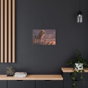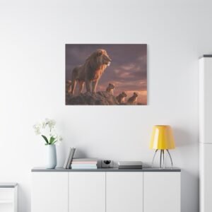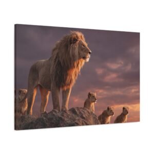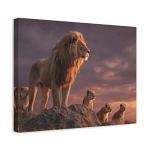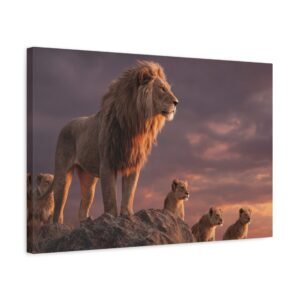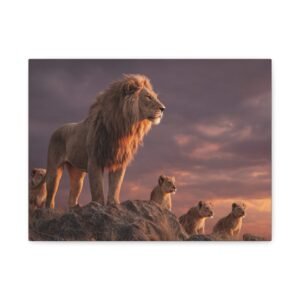 Imaginez un lion majestueux debout fièrement sur un promontoire rocheux, ses lionnes et ses petits rassemblés en dessous. Le mâle puissant, avec sa crinière fluide, surveille sa fierté, dans un paysage de savane doré, éclairé par une lumière chaude de coucher de soleil. La dynamique de groupe familial montre la protection et le leadership, avec les petits jouant près de leurs mères protectrices. Cette composition cinématographique de la vie sauvage, aux tons terreux, s’intégrera parfaitement dans un intérieur au style safari ou naturel.