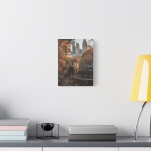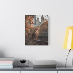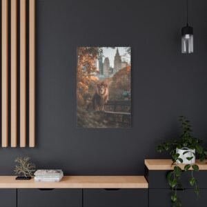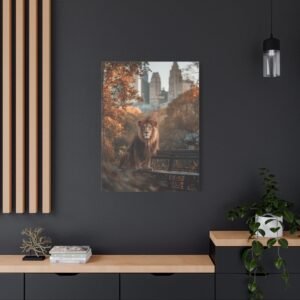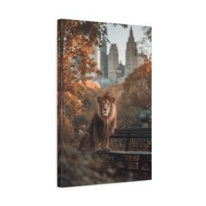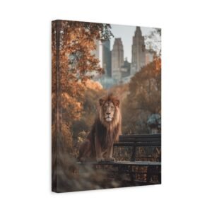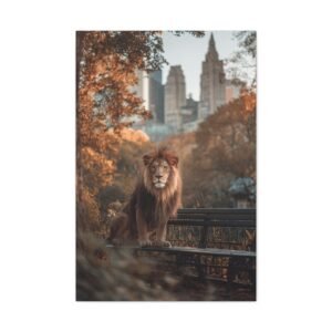Découvrez le tableau d’un lion majestueux trônant sur un banc public du Central Park. Cette oeuvre d’art offre une juxtaposition surréaliste de la royauté sauvage dans un cadre urbain. Le paysage automnal de New York City se dévoile à travers les arbres, tandis que la lumière dorée de l’après-midi filtre à travers les feuilles. Les passants flous en arrière-plan ajoutent une touche cinématographique à cette photographie de rue. Ce tableau ajoutera une touche d’exotisme et de royauté à votre décoration intérieure.