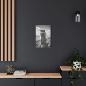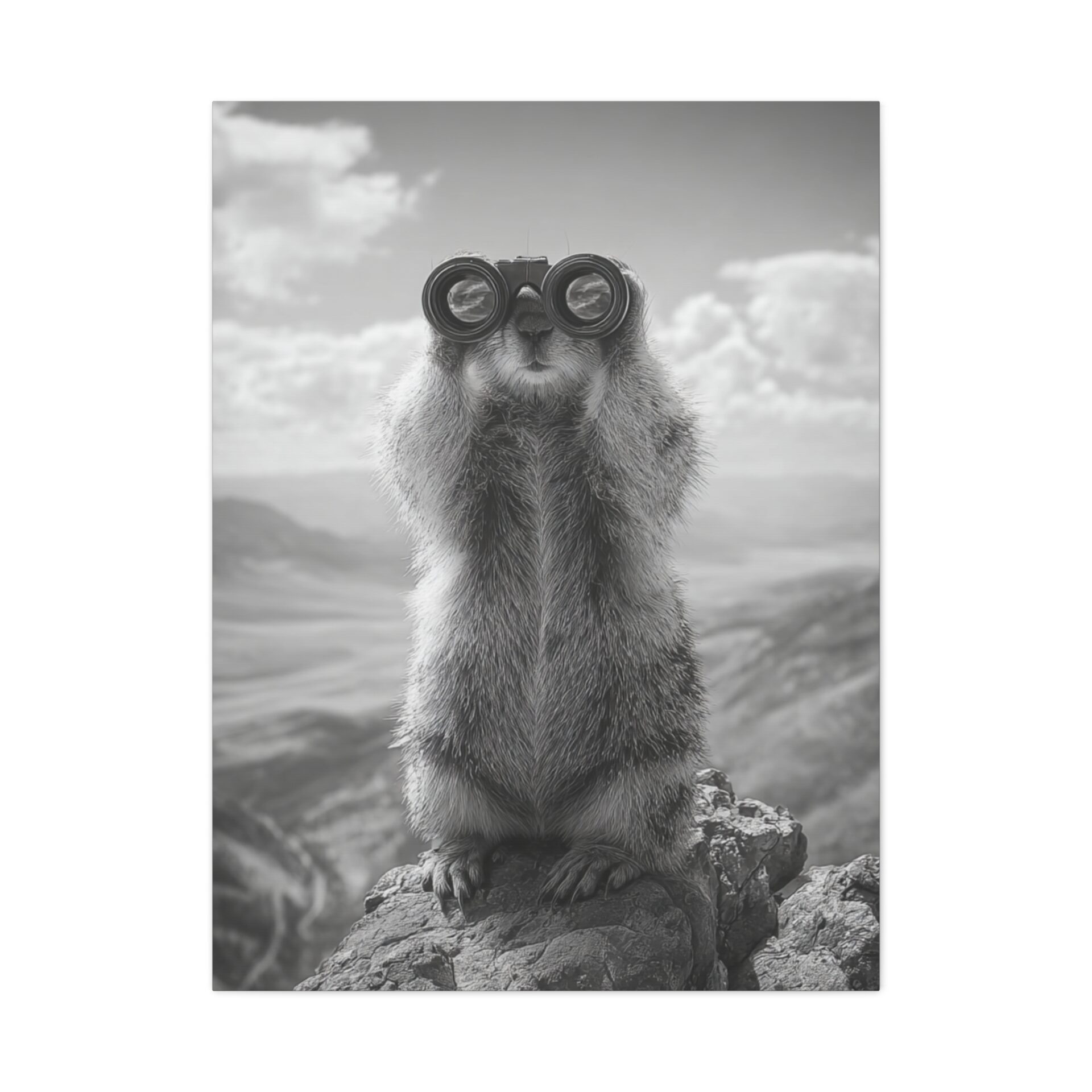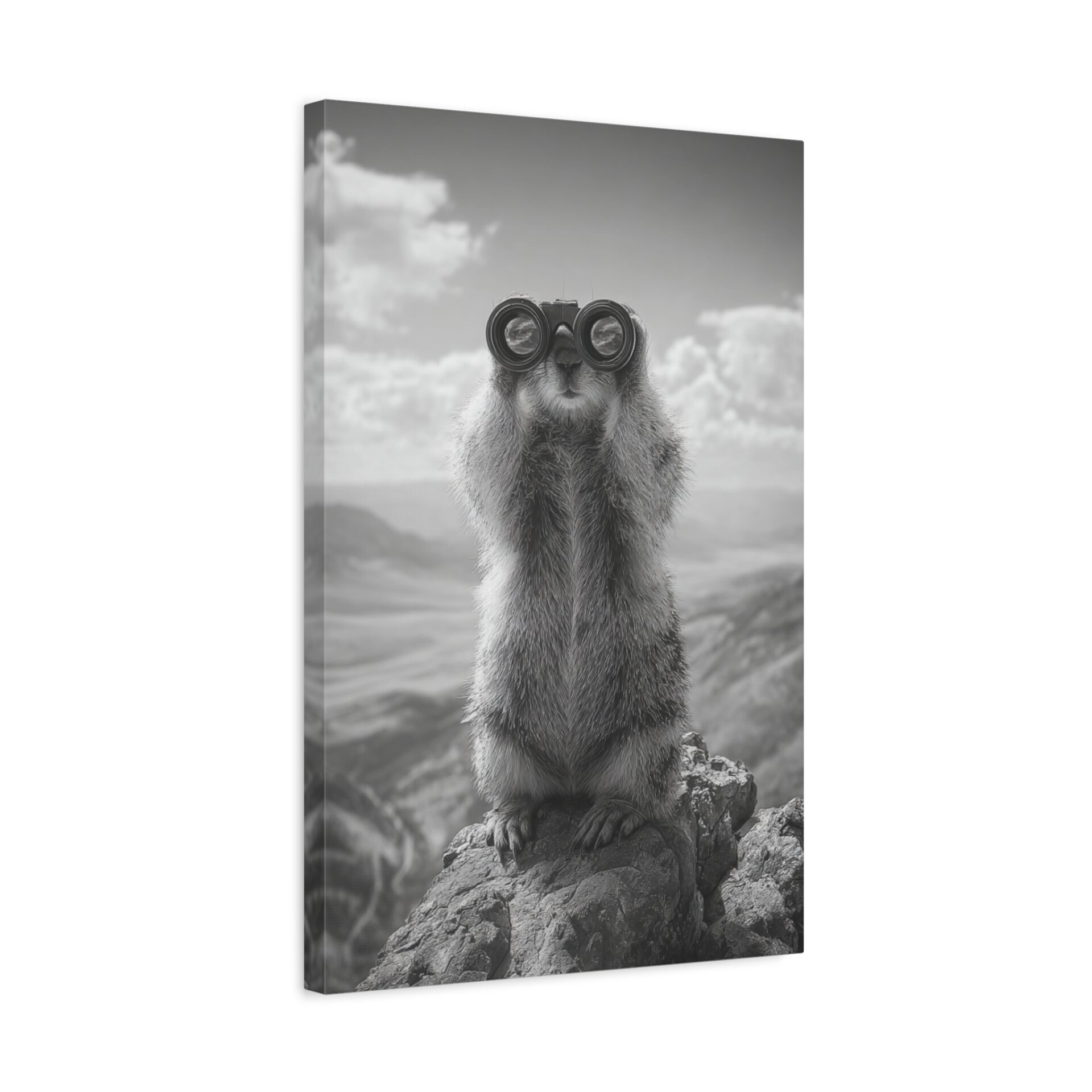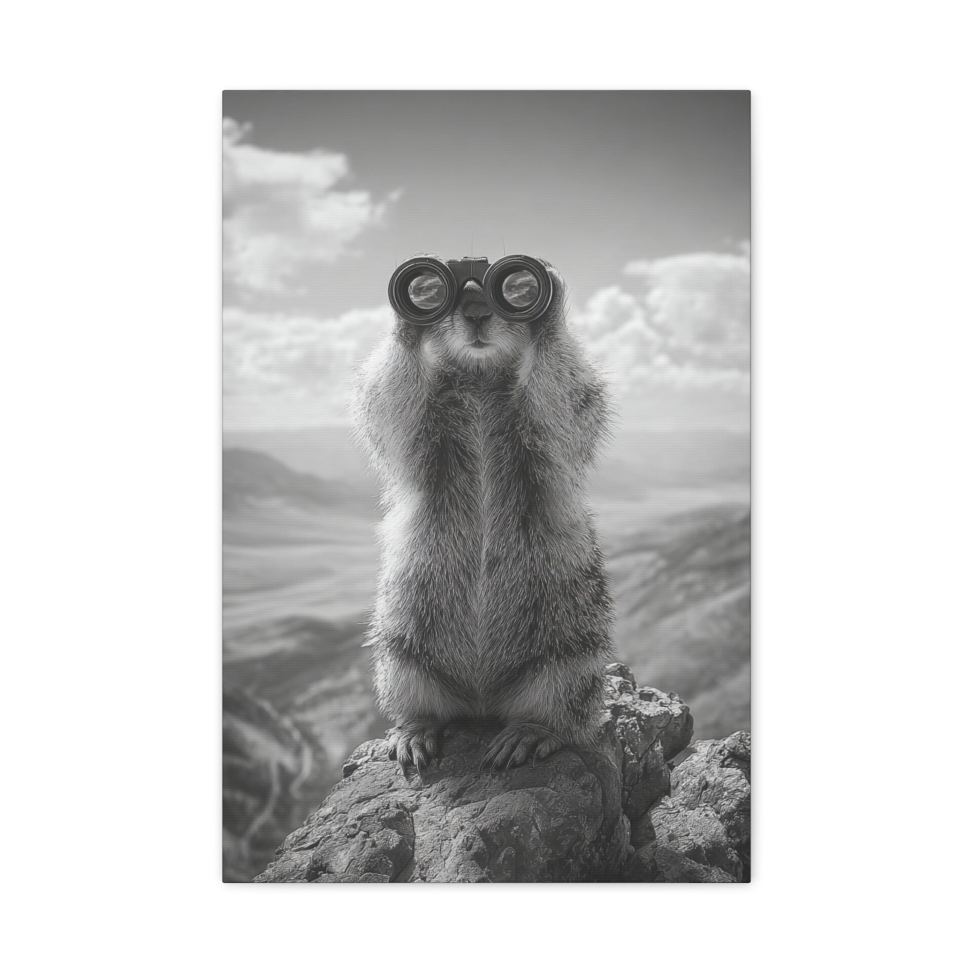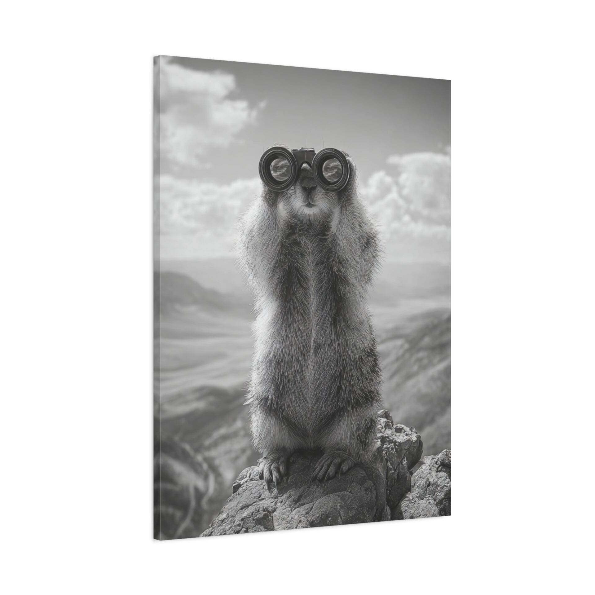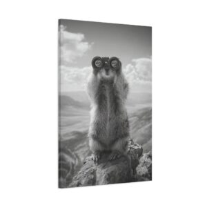 Admirez cette adorable marmotte alpine assise en position verticale, portant une paire de jumelles vintage surdimensionnées. Cette photographie en noir et blanc, à la fois dramatique et comique, capture parfaitement la texture duveteuse de la fourrure de la marmotte et son expression comique en regardant à travers les jumelles. Le tableau présente un paysage de vallée s’étendant loin en arrière-plan, avec le bord d’une falaise montagneuse rocheuse. Cette photographie d’art nature en monochrome à contraste élevé offre une touche d’humour à votre décoration.