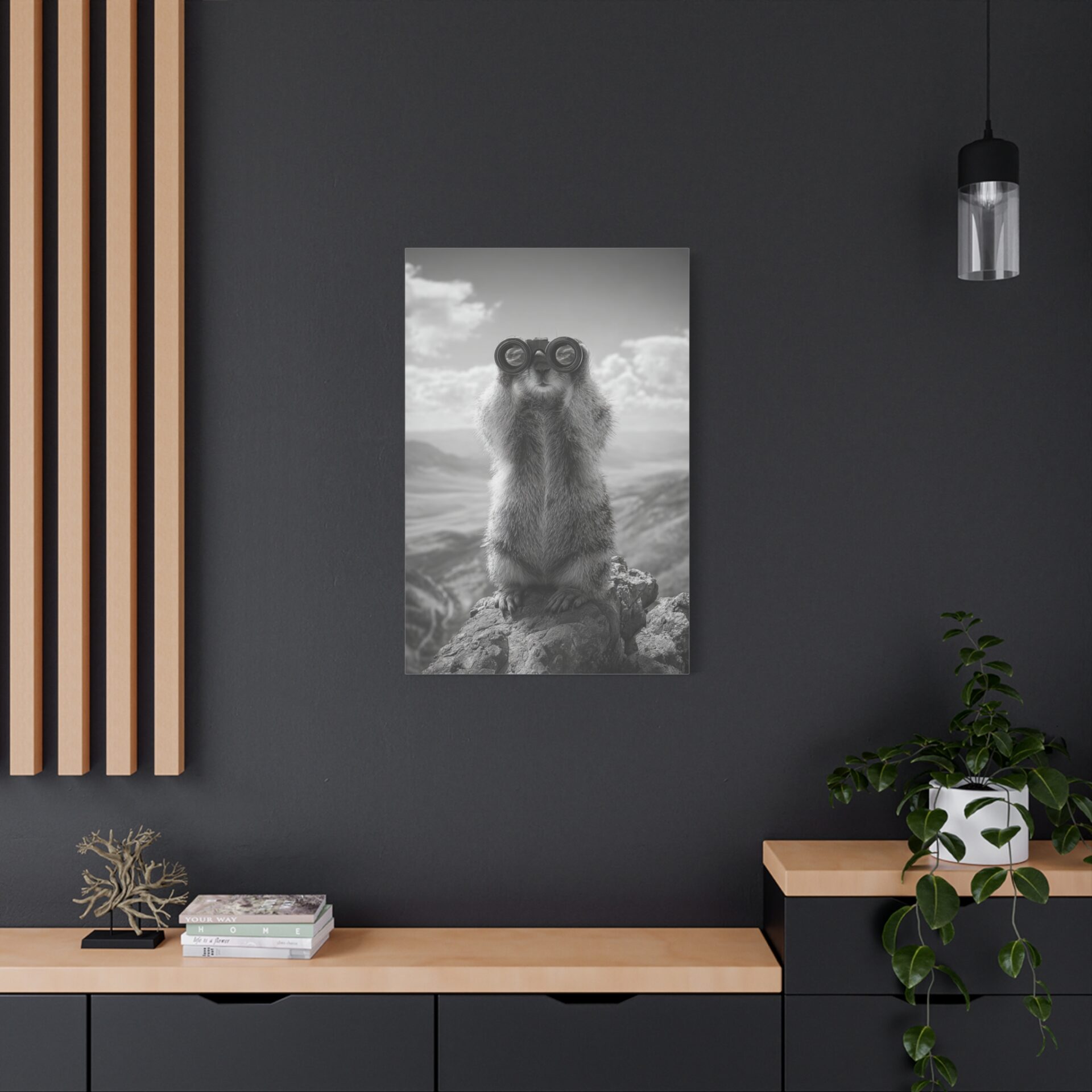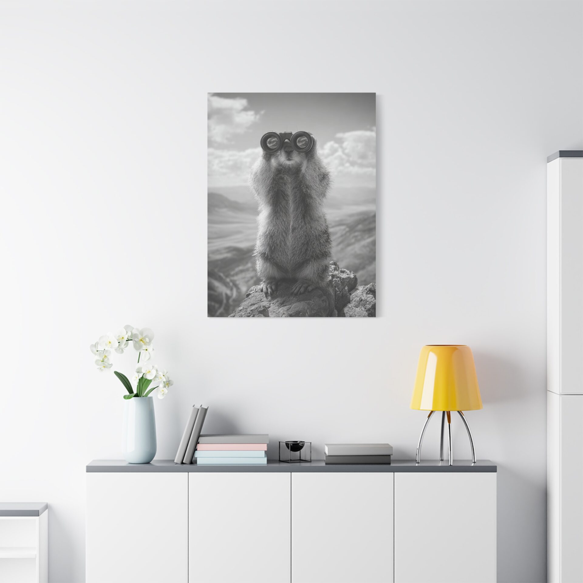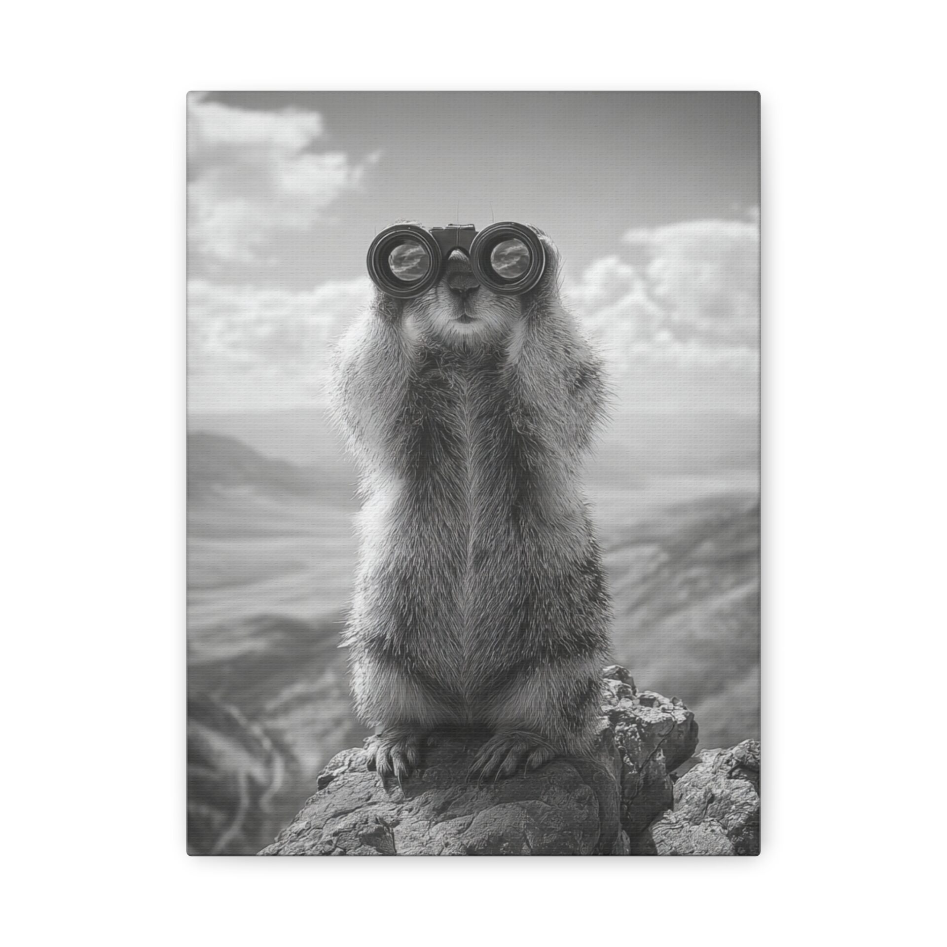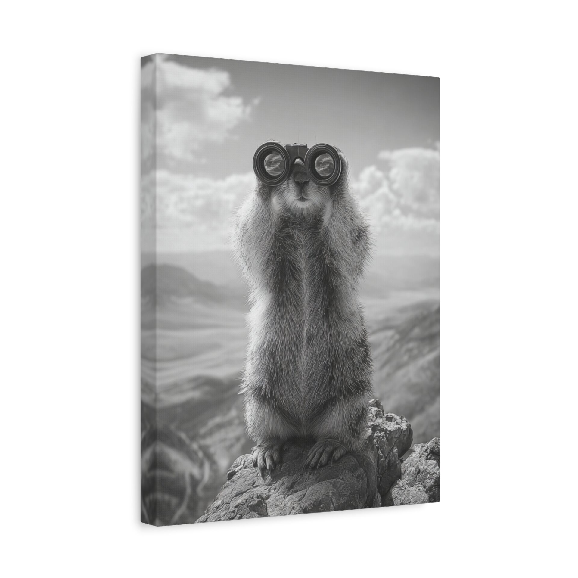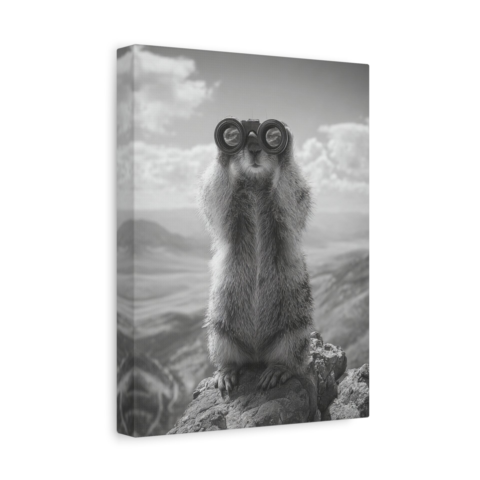 Admirez cette adorable marmotte alpine assise en position verticale, portant une paire de jumelles vintage surdimensionnées. Cette photographie en noir et blanc, à la fois dramatique et comique, capture parfaitement la texture duveteuse de la fourrure de la marmotte et son expression comique en regardant à travers les jumelles. Le tableau présente un paysage de vallée s’étendant loin en arrière-plan, avec le bord d’une falaise montagneuse rocheuse. Cette photographie d’art nature en monochrome à contraste élevé offre une touche d’humour à votre décoration.
