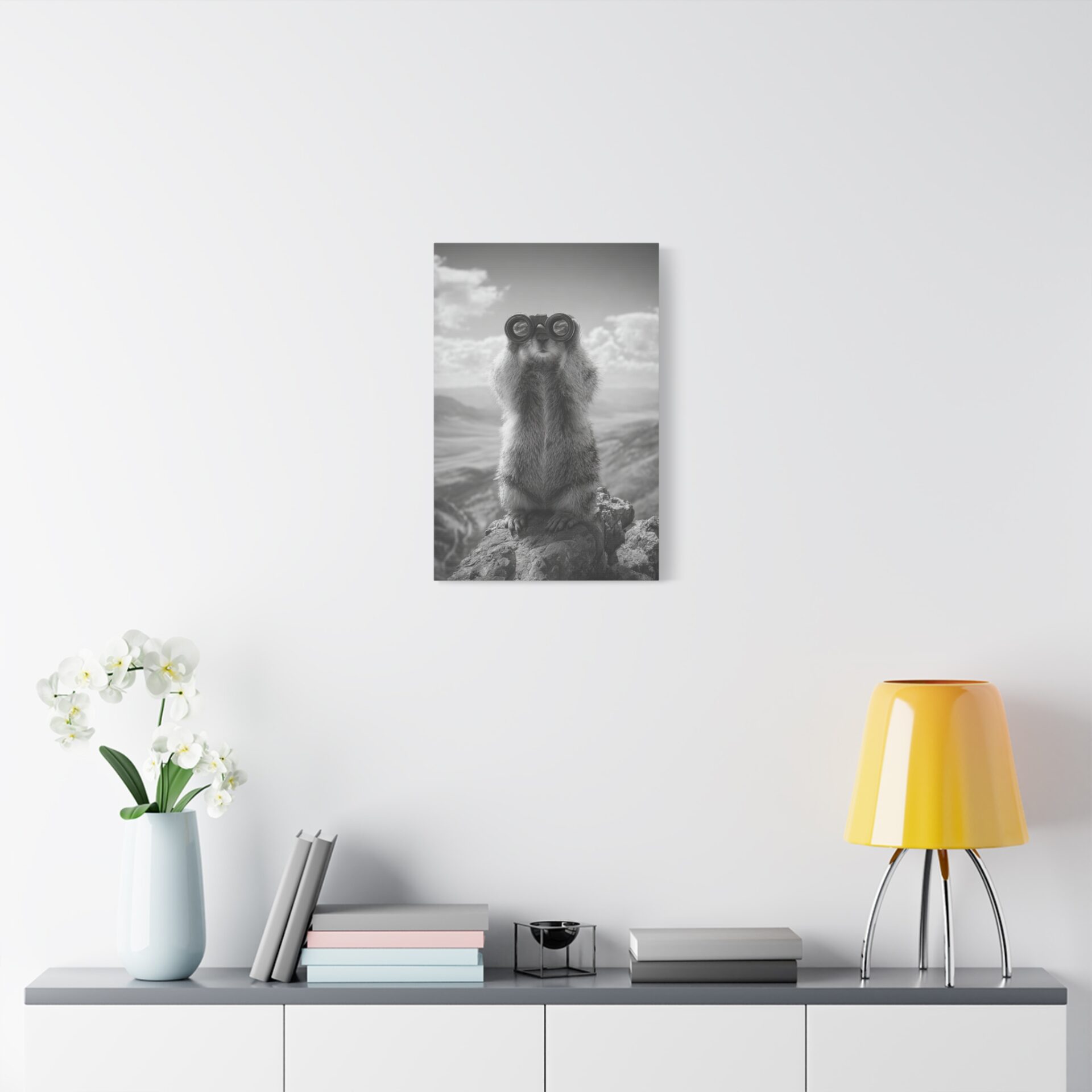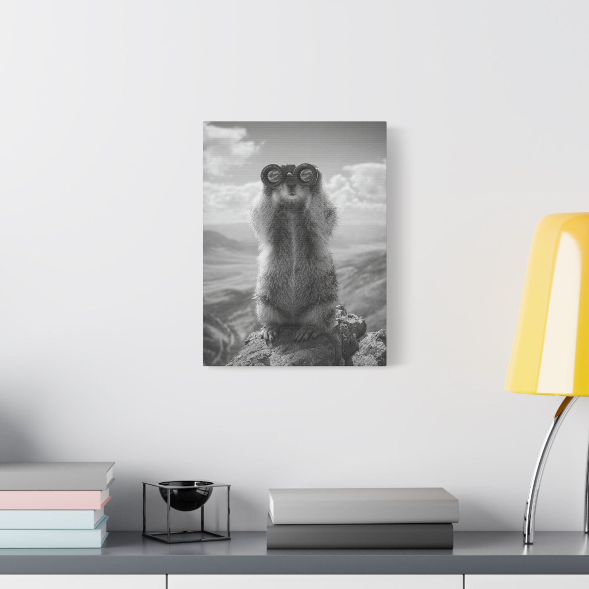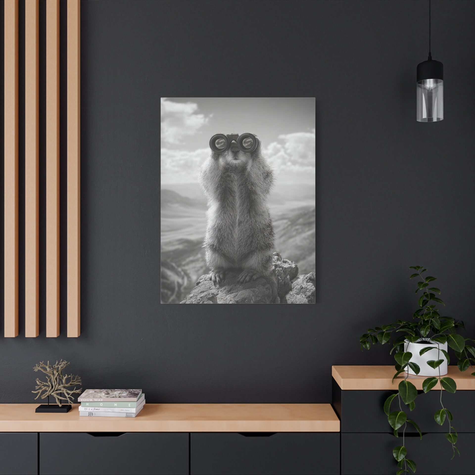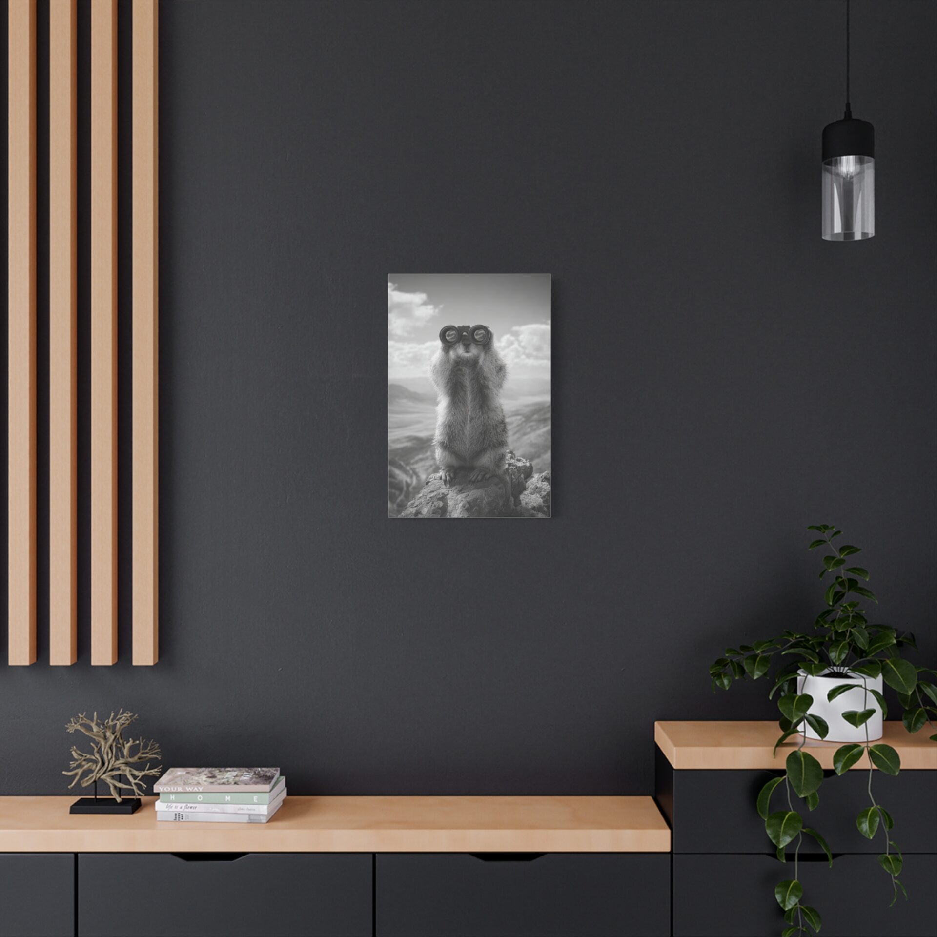 Admirez cette adorable marmotte alpine assise en position verticale, portant une paire de jumelles vintage surdimensionnées. Cette photographie en noir et blanc, à la fois dramatique et comique, capture parfaitement la texture duveteuse de la fourrure de la marmotte et son expression comique en regardant à travers les jumelles. Le tableau présente un paysage de vallée s’étendant loin en arrière-plan, avec le bord d’une falaise montagneuse rocheuse. Cette photographie d’art nature en monochrome à contraste élevé offre une touche d’humour à votre décoration.