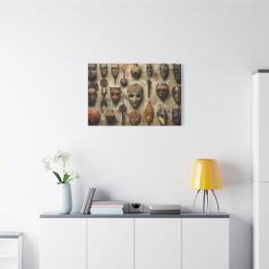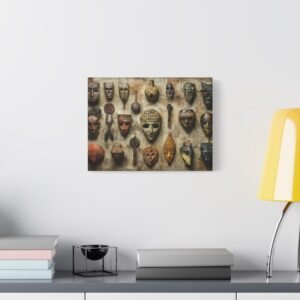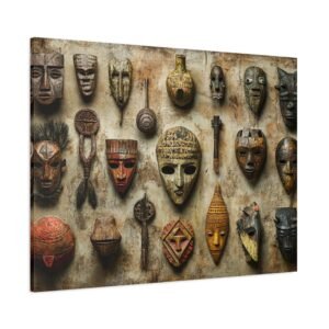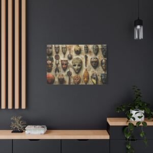 Pour sublimer cette œuvre, associez-la à des accessoires en fibres naturelles comme le raphia ou le jute. Un éclairage directionnel mettra en valeur les reliefs sculptés des masques. L’impression haute qualité sur notre toile premium garantit une reproduction fidèle des textures et des nuances subtiles de chaque masque.