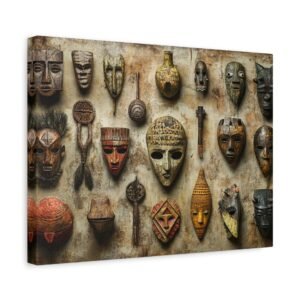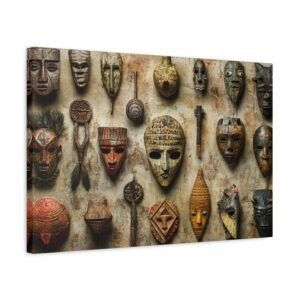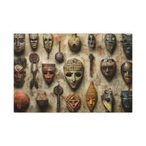 Plongez dans l’univers fascinant de l’art tribal avec cette composition artistique de masques africains qui insufflera une âme authentique à votre décoration. Les tons terreux chaleureux et les ombres dramatiques créent une atmosphère envoûtante, tandis que les motifs ethniques complexes racontent des histoires ancestrales.