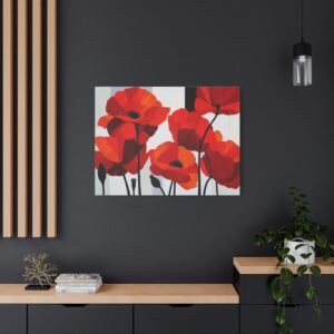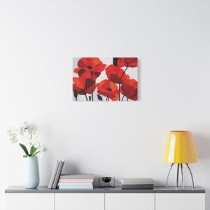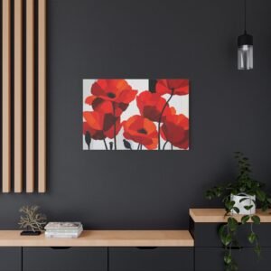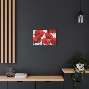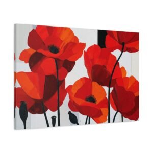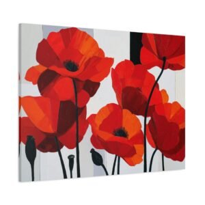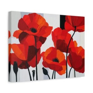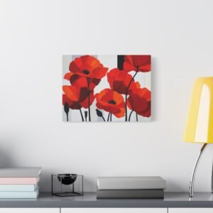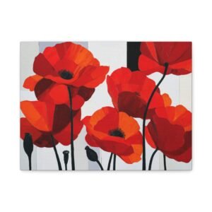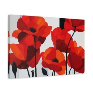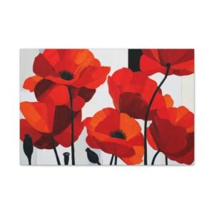 Découvrez ce Tableau Moderne Coquelicot, une peinture contemporaine de coquelicots rouges vibrants avec des éléments abstraits audacieux. Les pétales géométriques en écarlate et cramoisi vif, la composition minimaliste avec des lignes épurées et des formes simplifiées, contrastent avec les tiges noires sur un fond blanc pur. Inspiré du pop art, ce tableau présente une esthétique de design graphique avec une saturation élevée. La technique de peinture acrylique avec des blocs de couleurs plats et des bords nets donne à cette œuvre une vitalité unique.