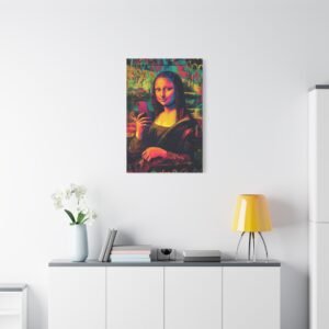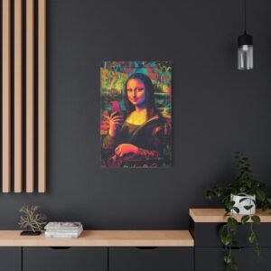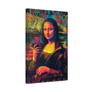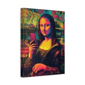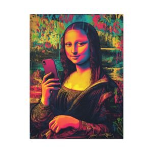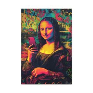 Découvrez une Joconde résolument contemporaine, où l’art classique rencontre l’ère digitale. Dans cette version audacieuse, l’énigmatique Mona Lisa prend un selfie avec son iPhone, conservant son légendaire sourire mystérieux. Le style street art vibrant et les couleurs néon transforment ce chef-d’œuvre de la Renaissance en une déclaration artistique moderne percutante.