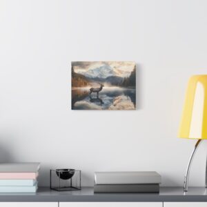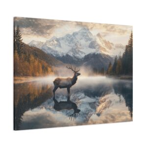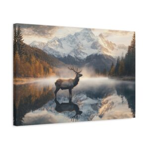 Immergez-vous dans un paysage alpin majestueux où la nature dévoile toute sa splendeur. Cette œuvre captivante réunit harmonieusement les sommets enneigés, un lac cristallin et un cerf noble dans son habitat naturel. Les reflets parfaits sur l’eau créent une symétrie hypnotique, tandis que la brume matinale ajoute une dimension mystique à la scène.