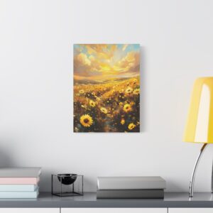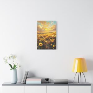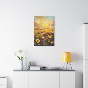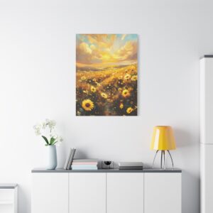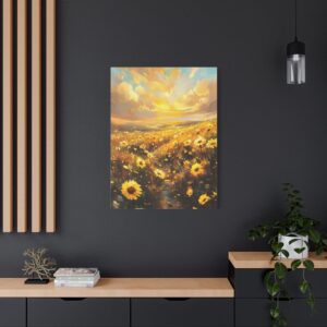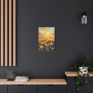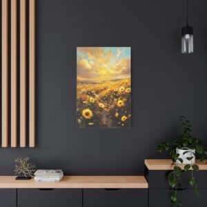 Pour sublimer cette œuvre, optez pour un mur aux tons neutres qui fera ressortir l’éclat des tournesols. Son format portrait 2:3 s’intégrera parfaitement dans votre salon ou votre salle à manger, créant une ambiance chaleureuse et accueillante.