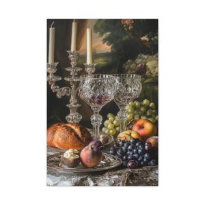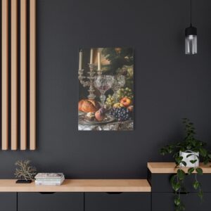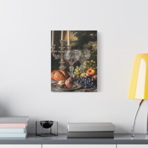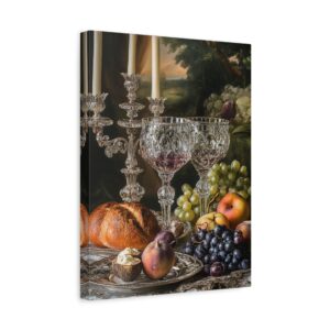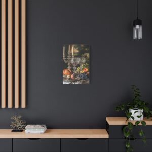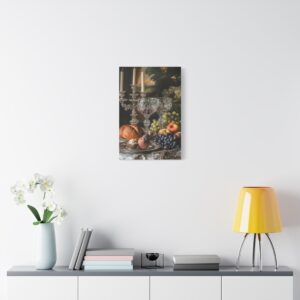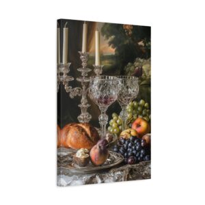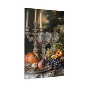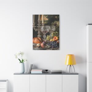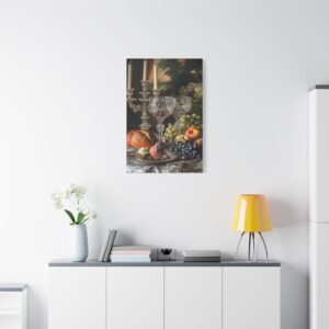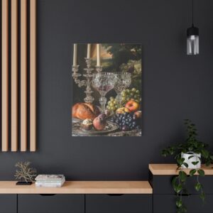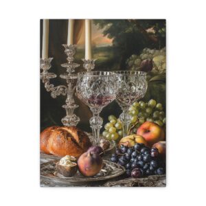 Ajoutez une touche de raffinement classique à votre espace repas avec cette nature morte somptueuse. Les verres en cristal et les bougeoirs en argent ancien se marient élégamment aux fruits frais et au pain artisanal, créant une atmosphère de luxe intemporel.