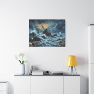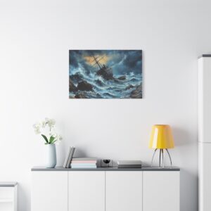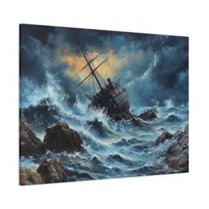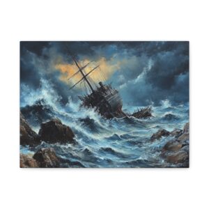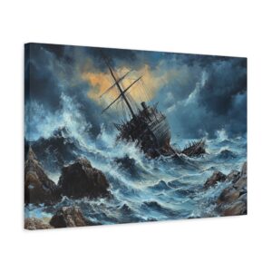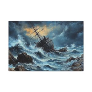 L’image saisissante d’un voilier en bois se brisant contre des rochers acérés, au cœur d’une tempête féroce, crée un point focal saisissant dans n’importe quelle pièce. Les vagues tumultueuses et le ciel orageux ajoutent une dimension de profondeur et d’émotion, invitant le spectateur à se perdre dans la scène.