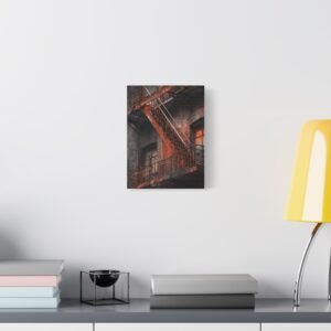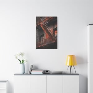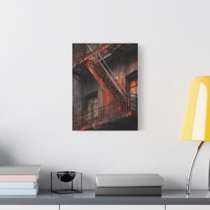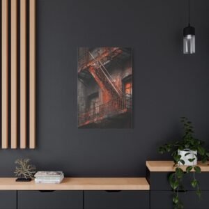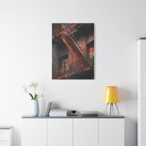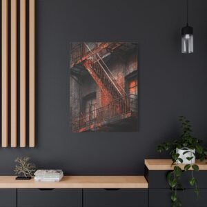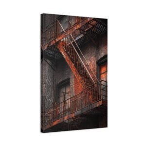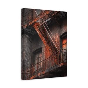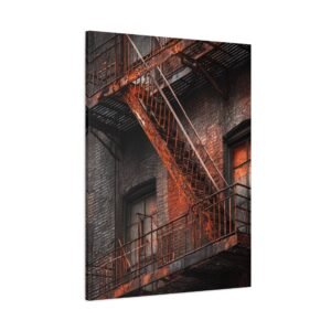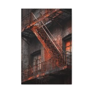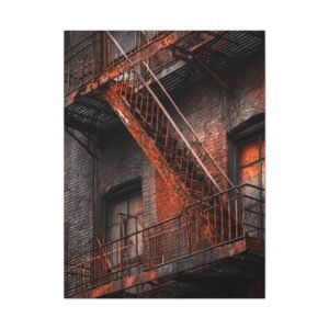 Découvrez notre Tableau New York & Escaliers Rouillés, une représentation artistique de l’esthétique urbaine décadente. Les escaliers de secours new-yorkais avec leurs rampes en fer rouillé, les marches en métal patinées par le temps, et la façade en briques du bâtiment créent une composition d’art mural industriel. Le motif géométrique en zigzag de l’escalier et les ombres dramatiques ajoutent à l’atmosphère granuleuse de la ville. Le tableau est monochromatique avec des accents de rouille orange, ajoutant une patine rouge vintage.