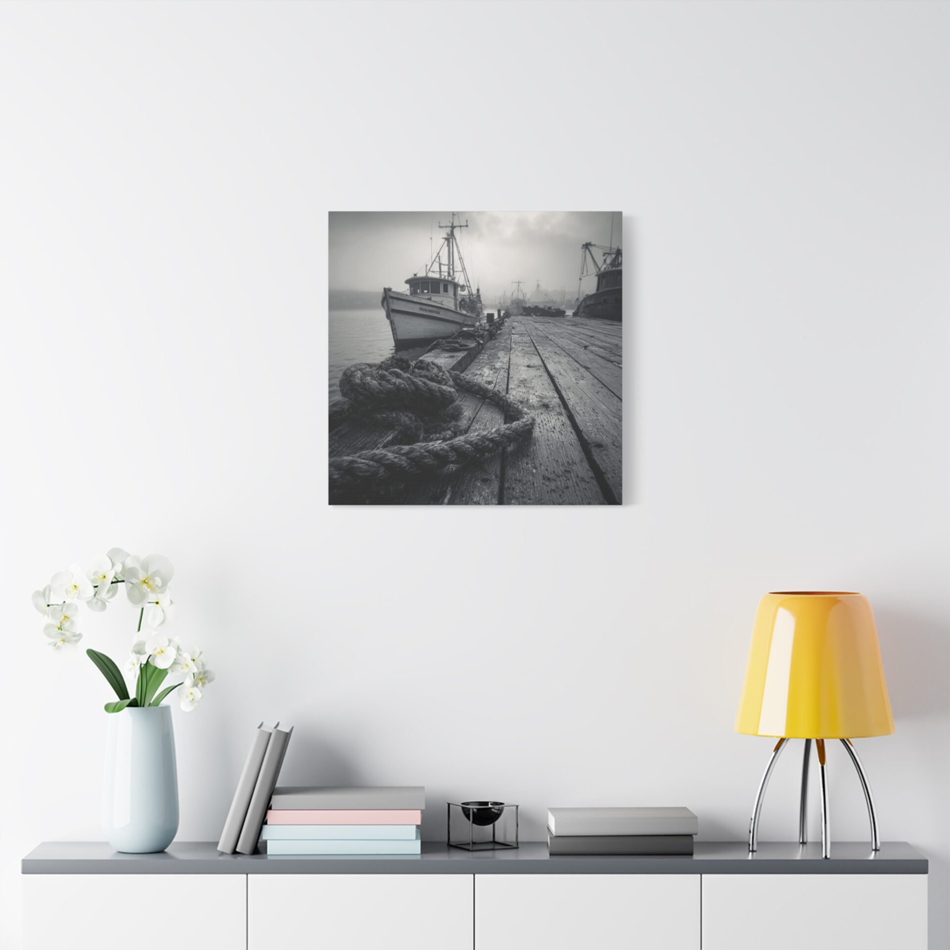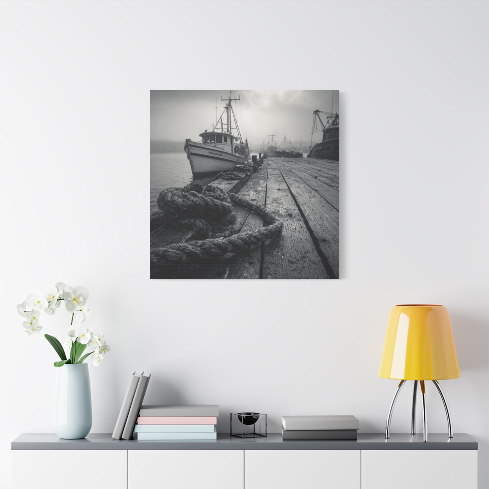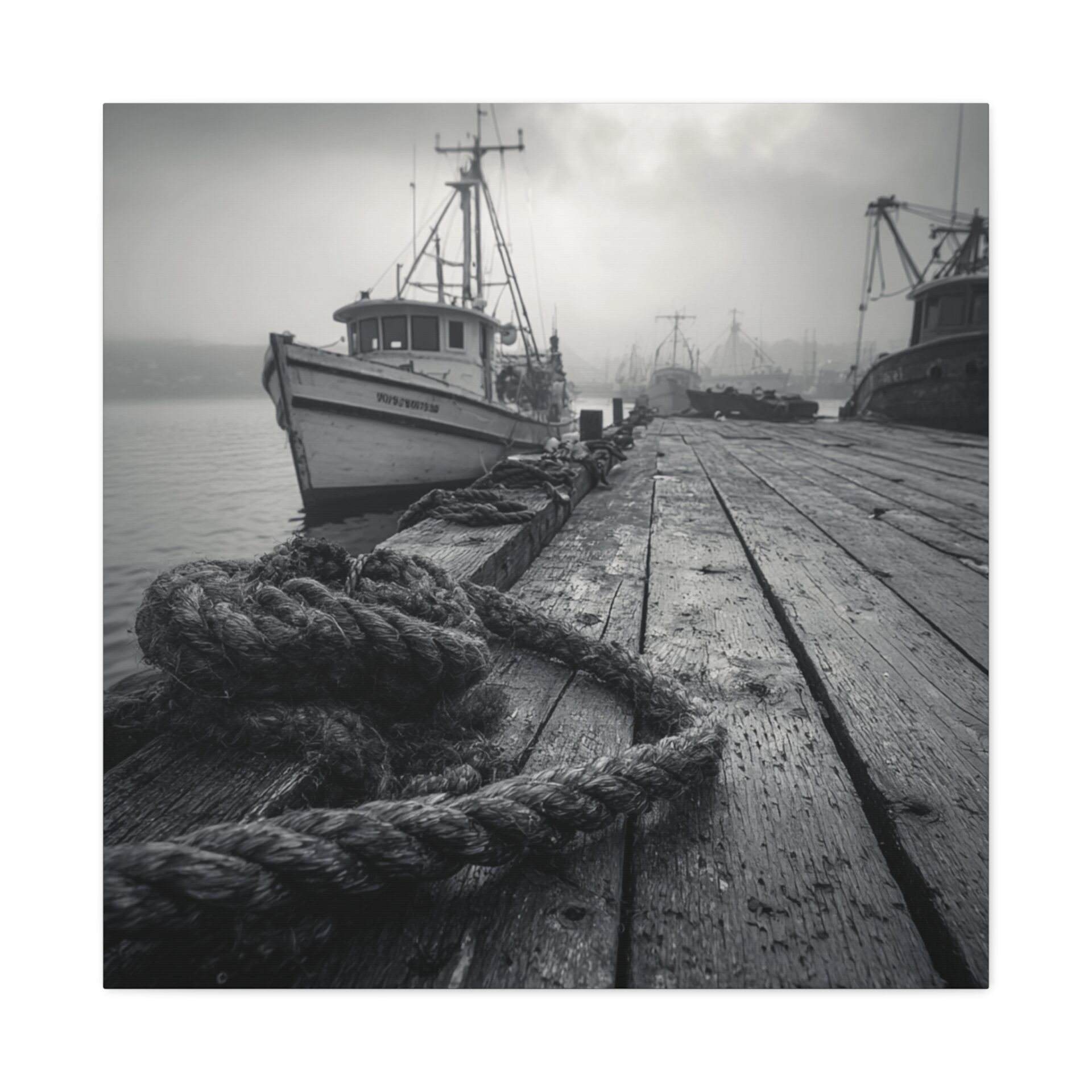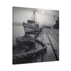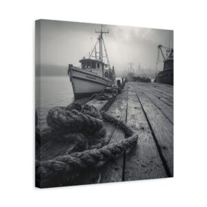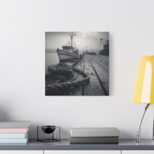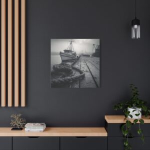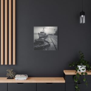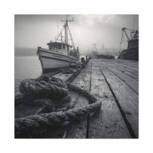 Offrez-vous une escapade maritime avec ce Tableau Noir & Blanc – Accostage. Cette œuvre en noir et blanc présente une scène maritime d’un petit bateau de pêche accostant à un quai en bois usé. La composition monochromatique dramatique avec de forts contrastes, des détails de cordage et des éléments nautiques, crée une atmosphère de port brumeux. Le style de photographie classique avec des ombres profondes et des points forts lumineux, capturé dans des tons de niveaux de gris artistiques, apportera une touche de caractère à votre décoration intérieure.