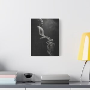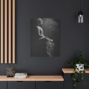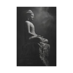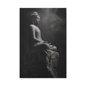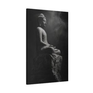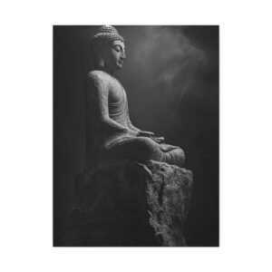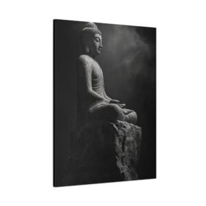 Découvrez la puissance apaisante de ce portrait spirituel en noir et blanc. La statue de Bouddha, capturée dans une pose méditative, se révèle à travers une atmosphère éthérée où ombres profondes et lumières délicates créent une présence mystique.