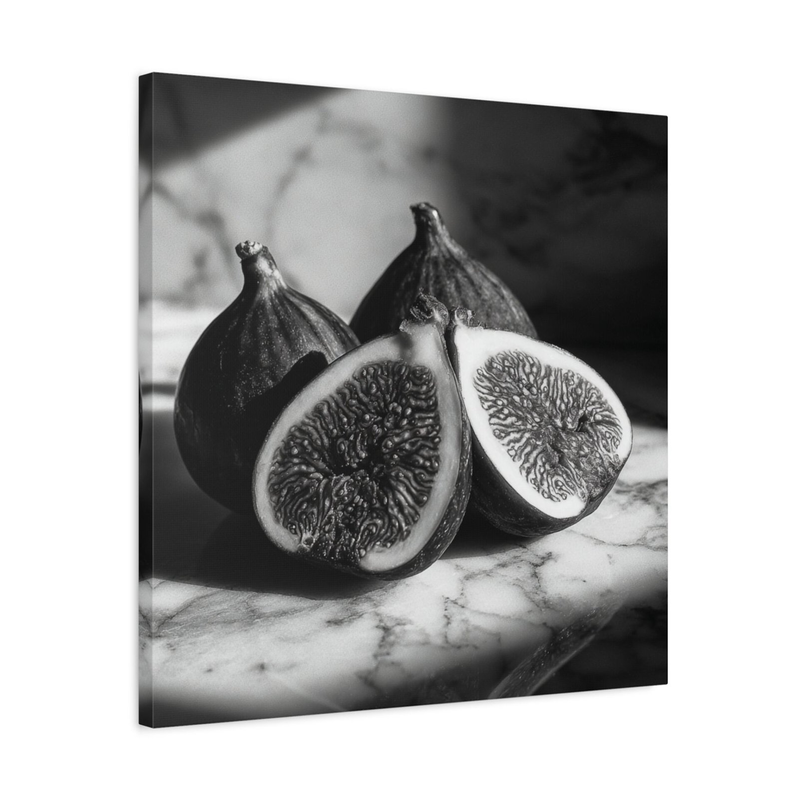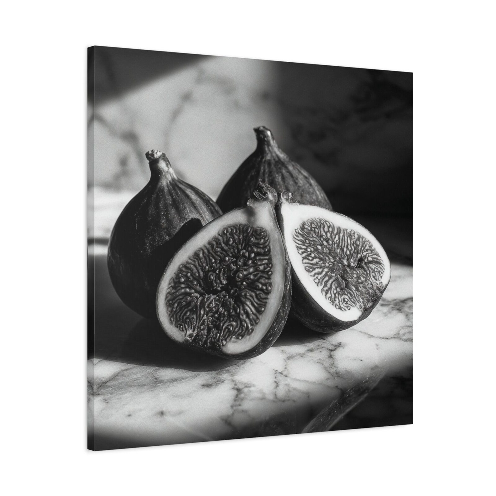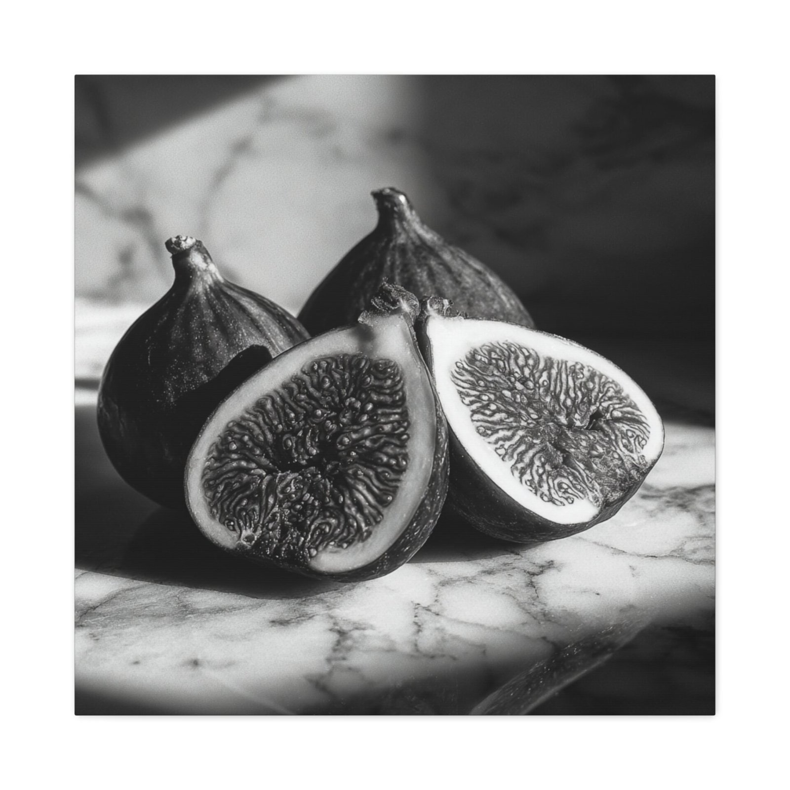 Découvrez notre Tableau Noir & Blanc Figues, une œuvre d’art photographique en noir et blanc qui met en scène des figues fraîchement coupées. Les motifs intérieurs délicats de ces fruits sont révélés par un éclairage dramatique créant de profondes ombres, le tout dans une composition monochromatique sur une surface en marbre. Le style esthétique de la nature morte classique est combiné à une qualité de chambre noire vintage pour produire un tableau d’une élégance rare, parfait pour votre cuisine ou toute autre pièce de votre maison.