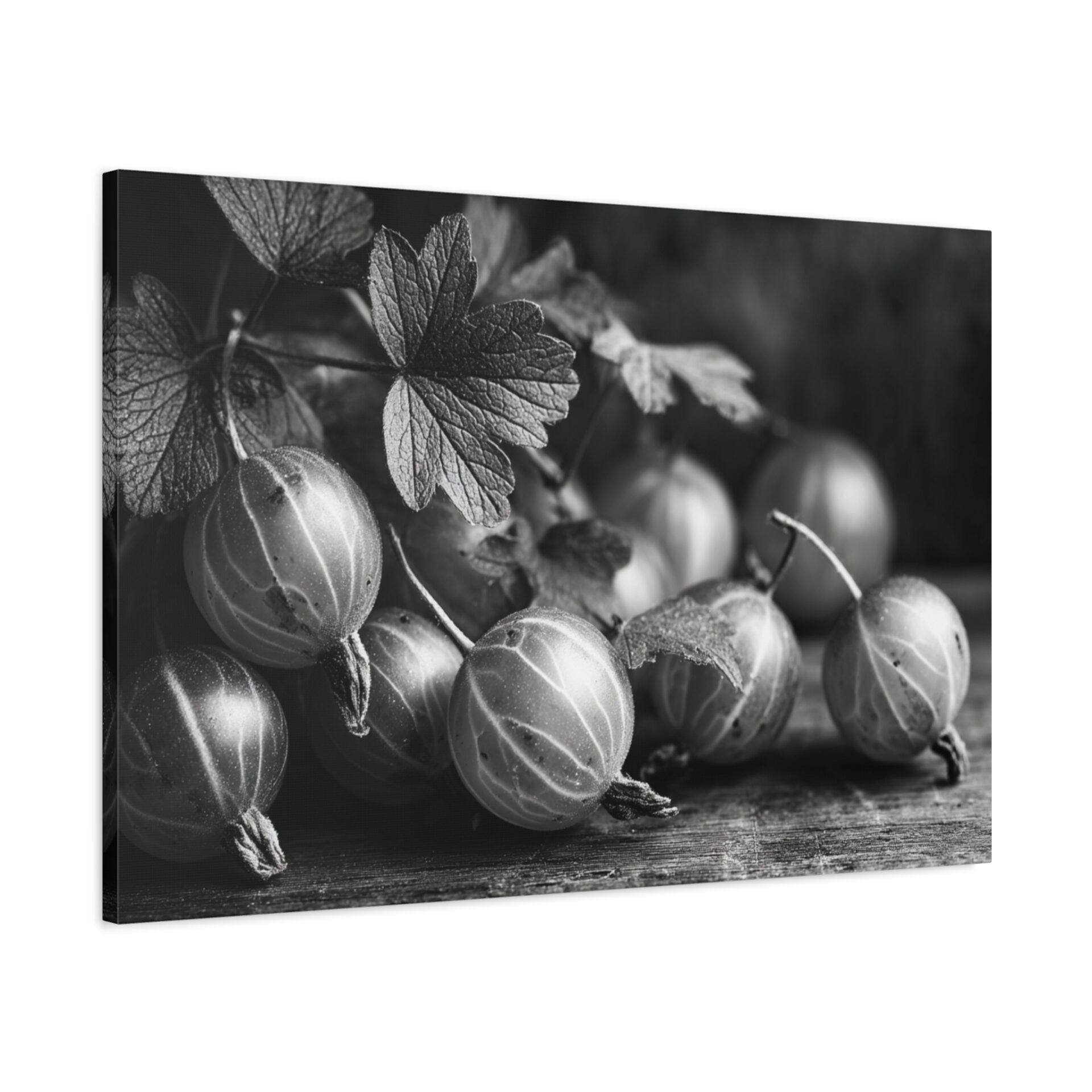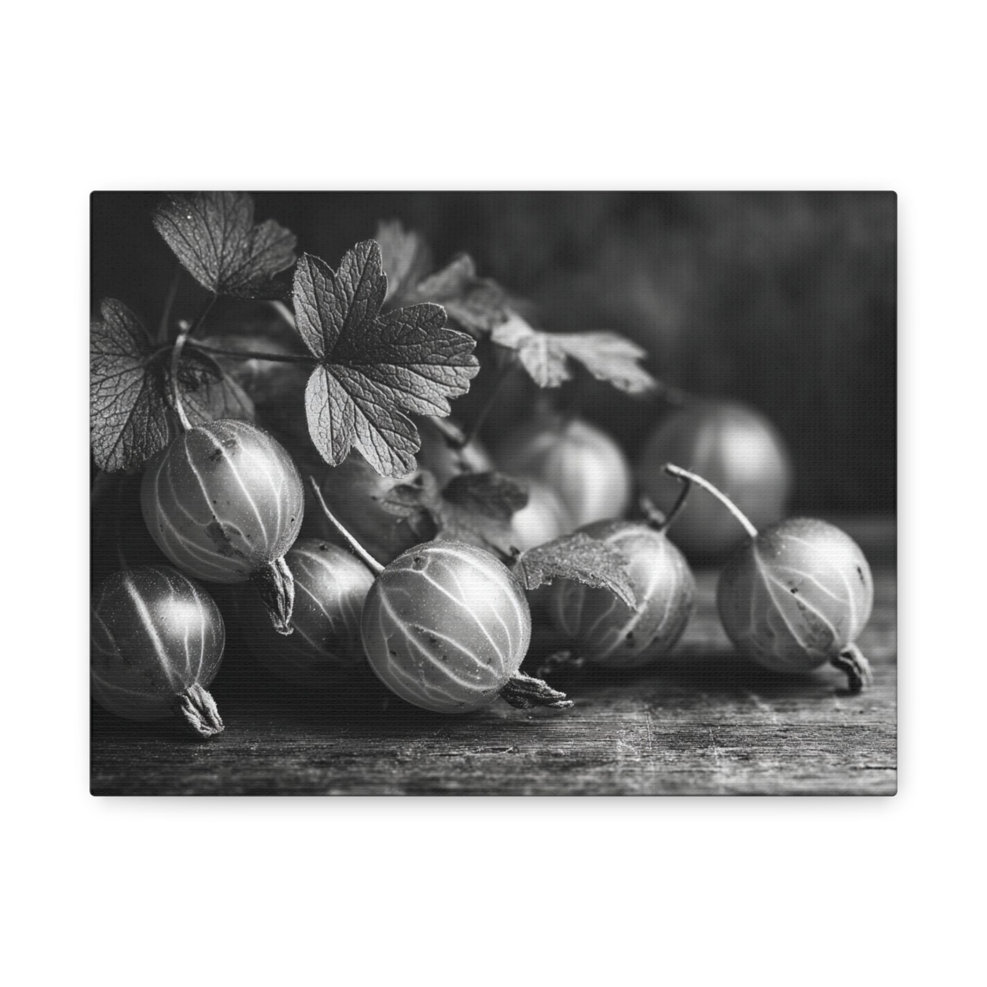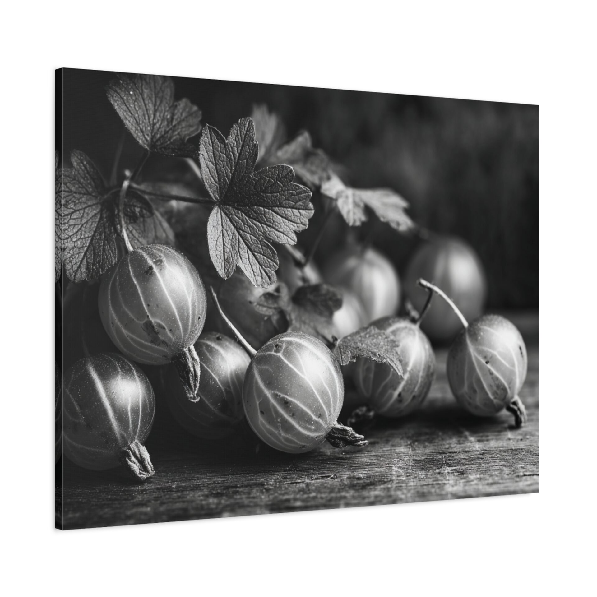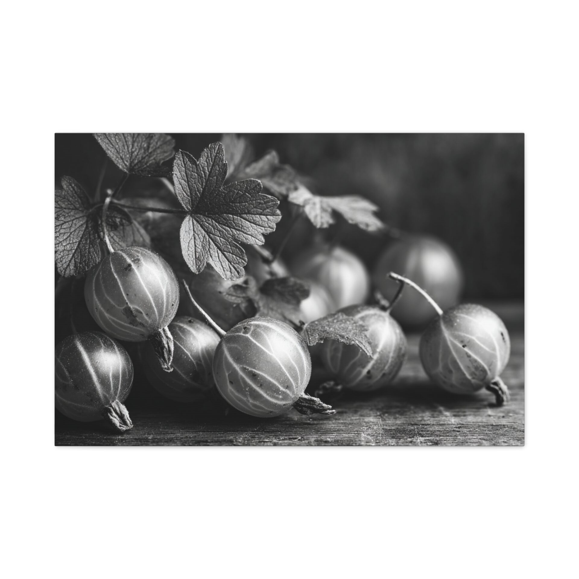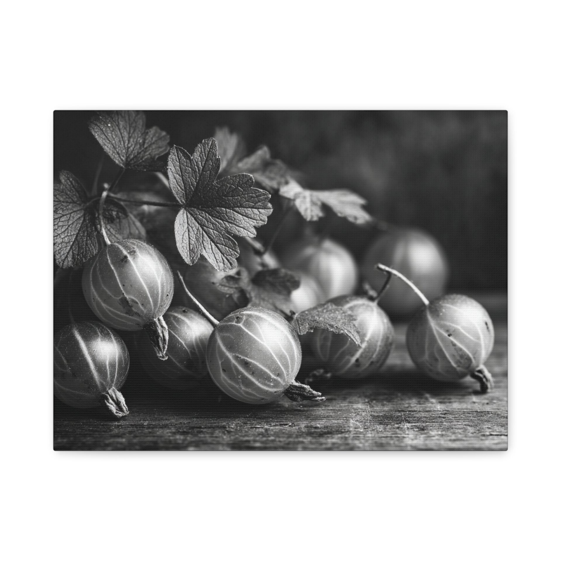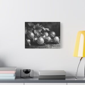 Découvrez le Tableau Noir & Blanc Groseille, une photographie artistique en noir et blanc de groseilles fraîches à la peau translucide et aux veines délicates. Cette composition de nature morte monochromatique, éclairée d’une lumière douce et dramatique, évoque une esthétique vintage avec un grain de film classique. Les ombres élégantes sur la surface en bois ajoutent une touche de sophistication, faisant de ce tableau un élément de décoration murale idéal pour votre cuisine.