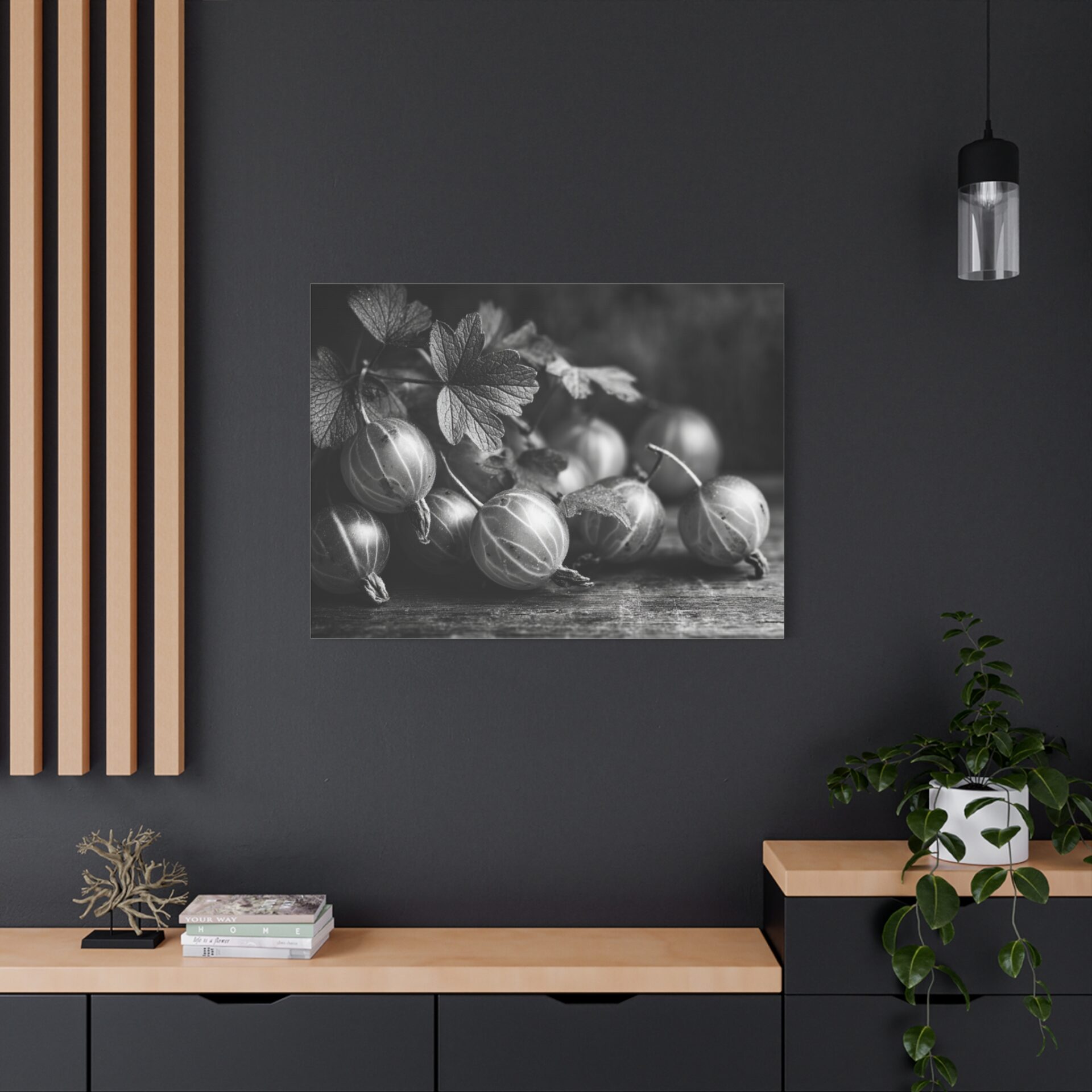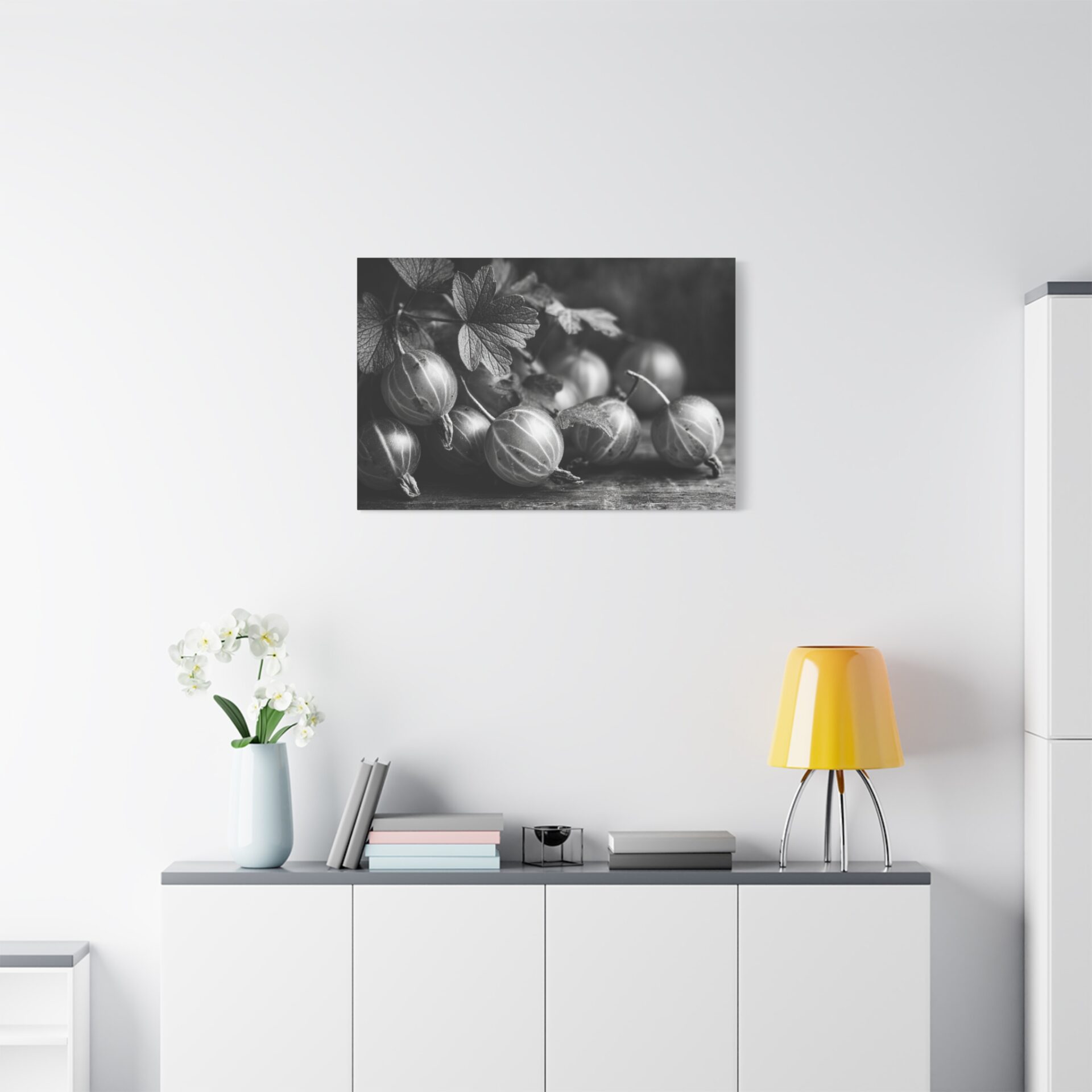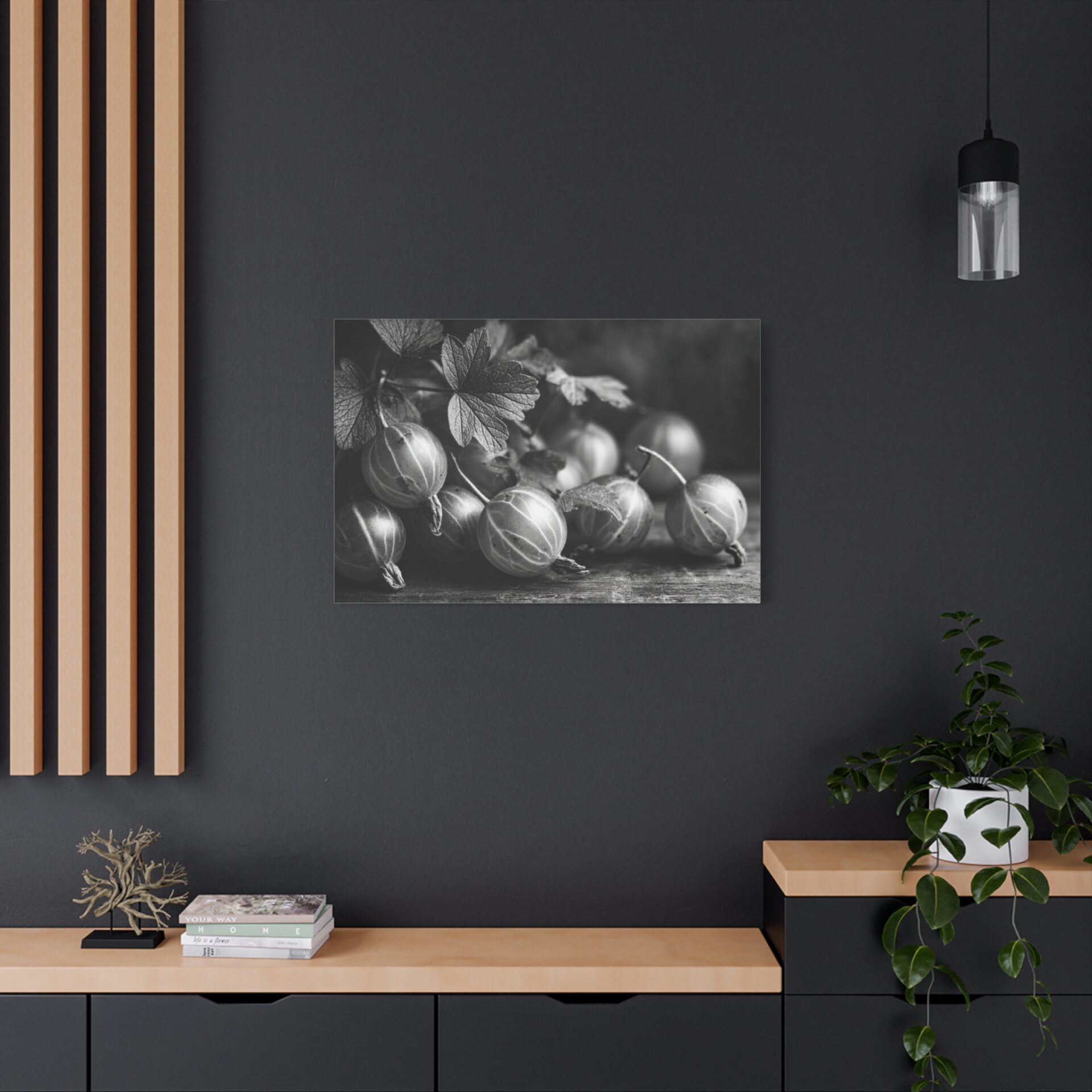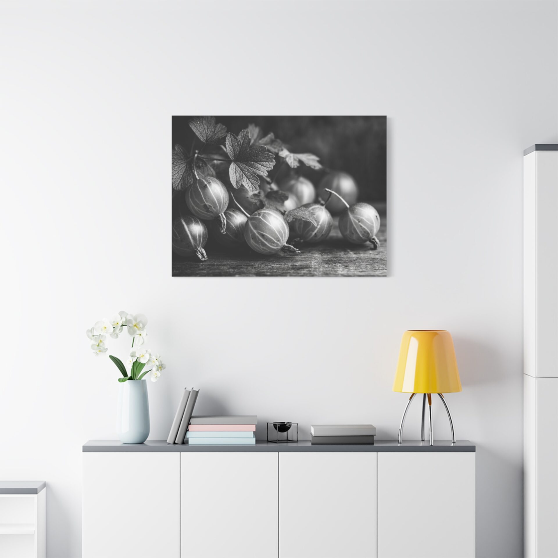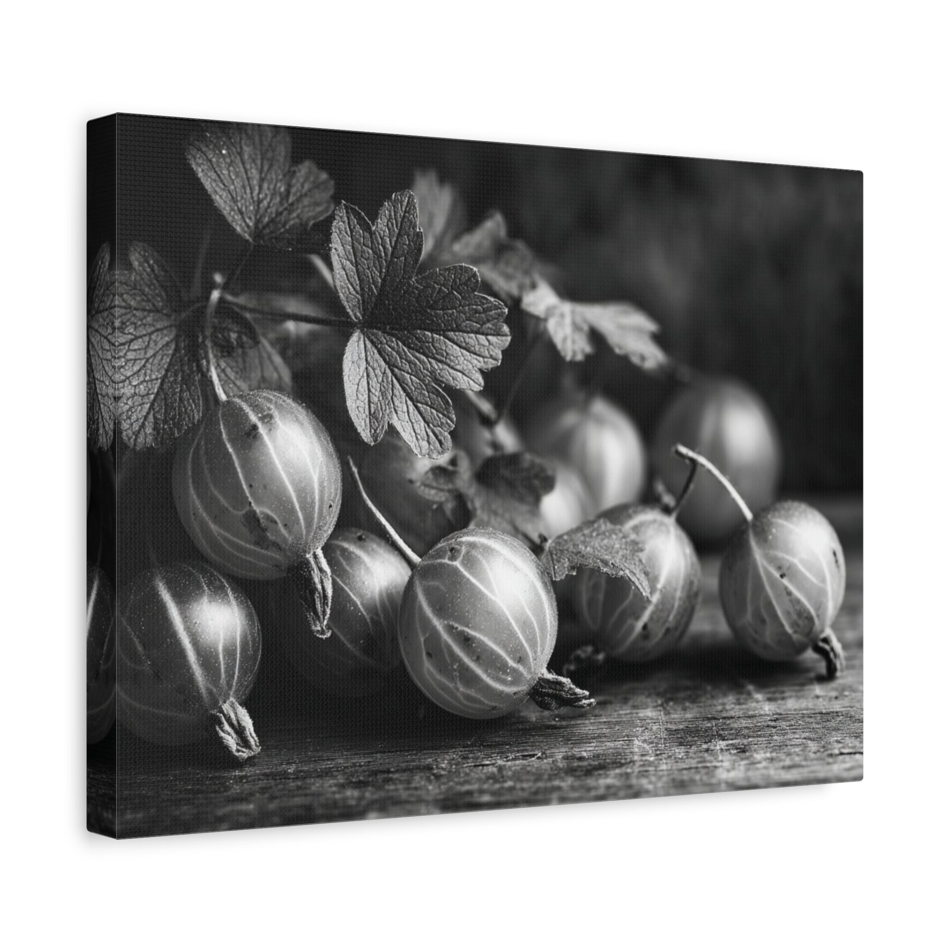 Découvrez le Tableau Noir & Blanc Groseille, une photographie artistique en noir et blanc de groseilles fraîches à la peau translucide et aux veines délicates. Cette composition de nature morte monochromatique, éclairée d’une lumière douce et dramatique, évoque une esthétique vintage avec un grain de film classique. Les ombres élégantes sur la surface en bois ajoutent une touche de sophistication, faisant de ce tableau un élément de décoration murale idéal pour votre cuisine.