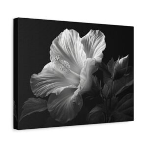 Découvrez la splendeur d’une magnifique fleur d’hibiscus en pleine floraison, représentée dans une élégante illustration botanique en noir et blanc. Ce tableau révèle un contraste monochromatique dramatique, mettant en valeur les grandes feuilles tropicales et les détails texturés et veinés des pétales délicats. Le style d’art botanique classique et l’éclairage sophistiqué du clair-obscur apportent une touche de sophistication à votre intérieur.