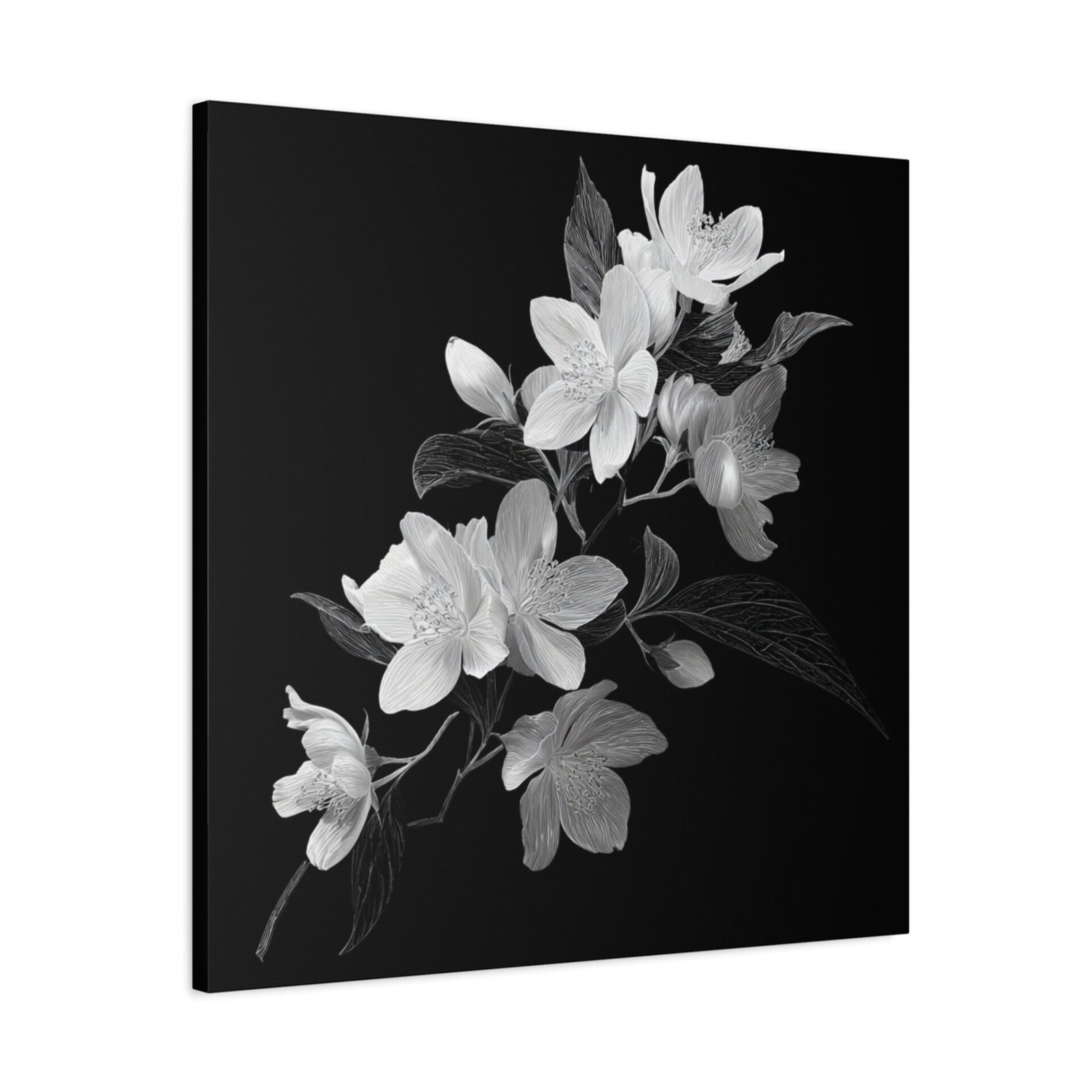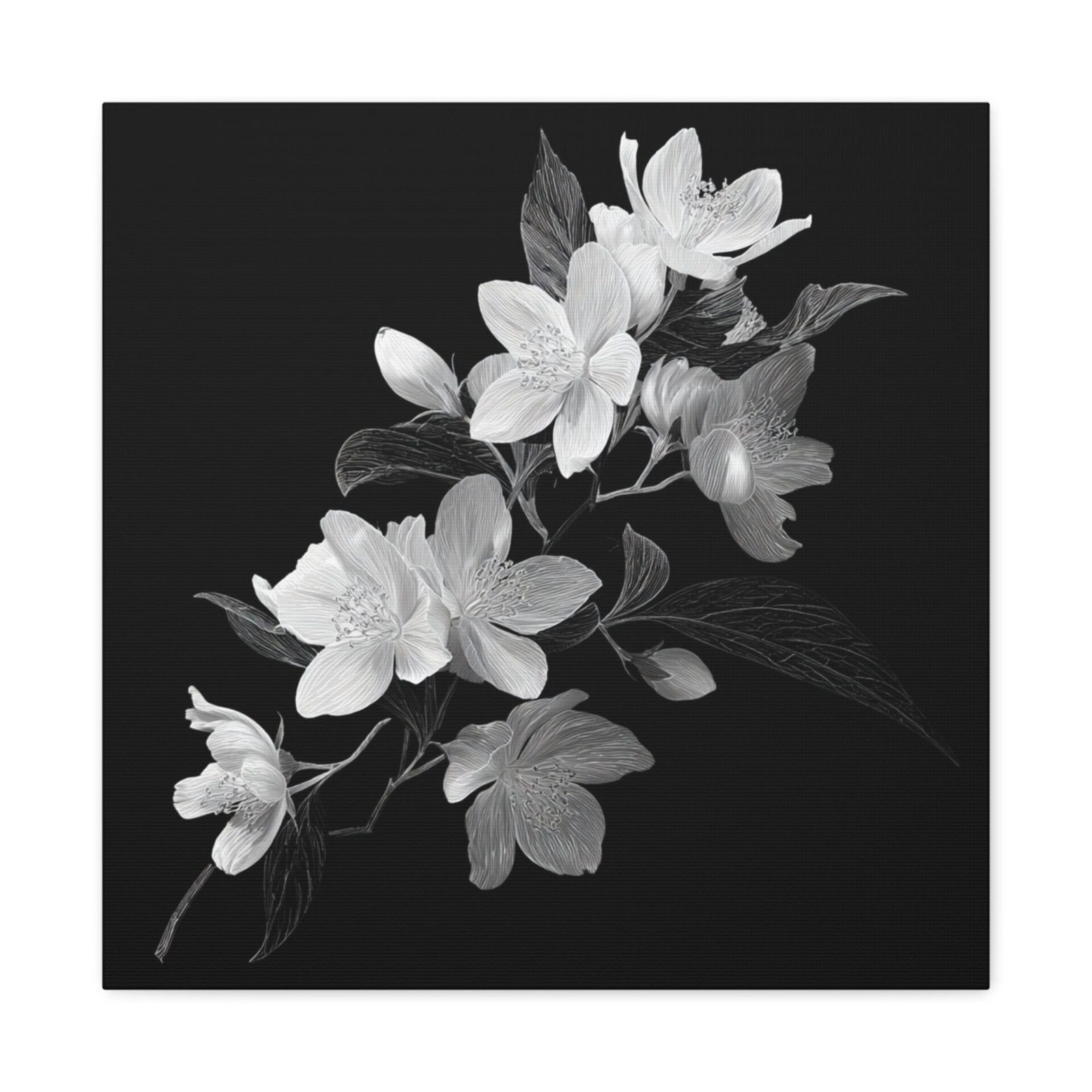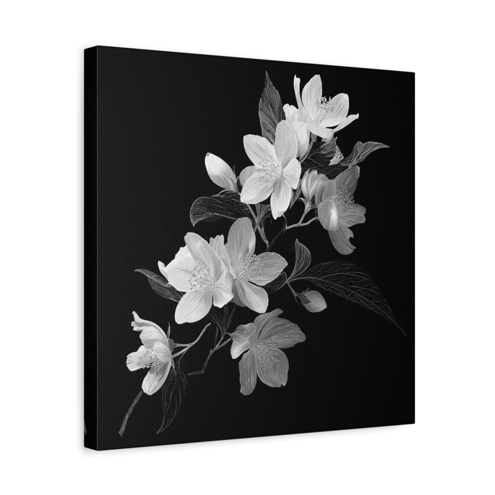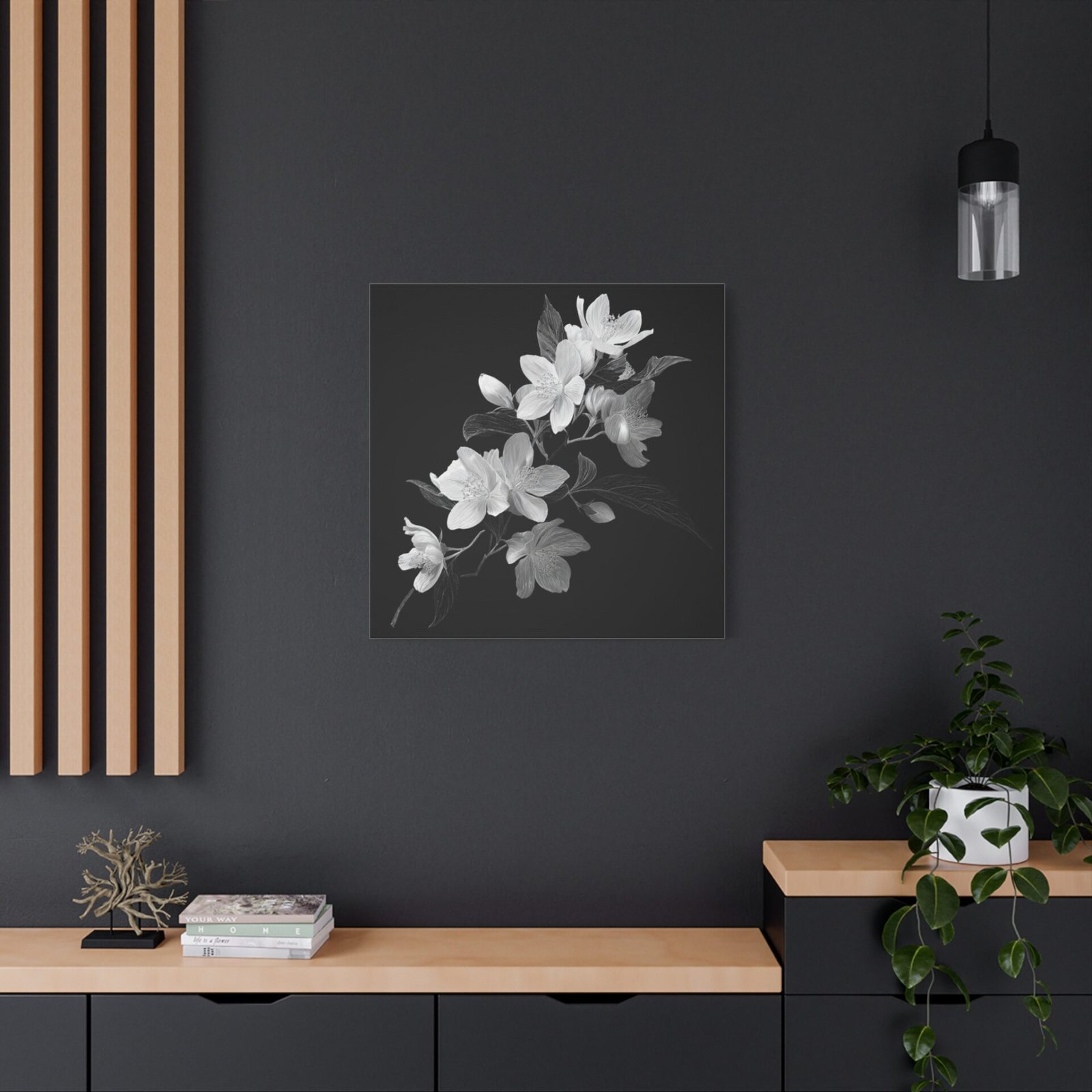 Découvrez notre Tableau Noir & Blanc Jasmin, une représentation délicate d’une branche de jasmin aux fleurs blanches détaillées, tombant en cascade sur un fond noir profond. Cette oeuvre de style illustration botanique offre une composition monochromatique à contraste élevé, avec des pétales et des feuilles qui coulent avec élégance, le tout enrichi par un travail de ligne détaillé. L’éclairage artistique du clair-obscur ajoute une touche dramatique, tout en conservant une esthétique minimaliste.