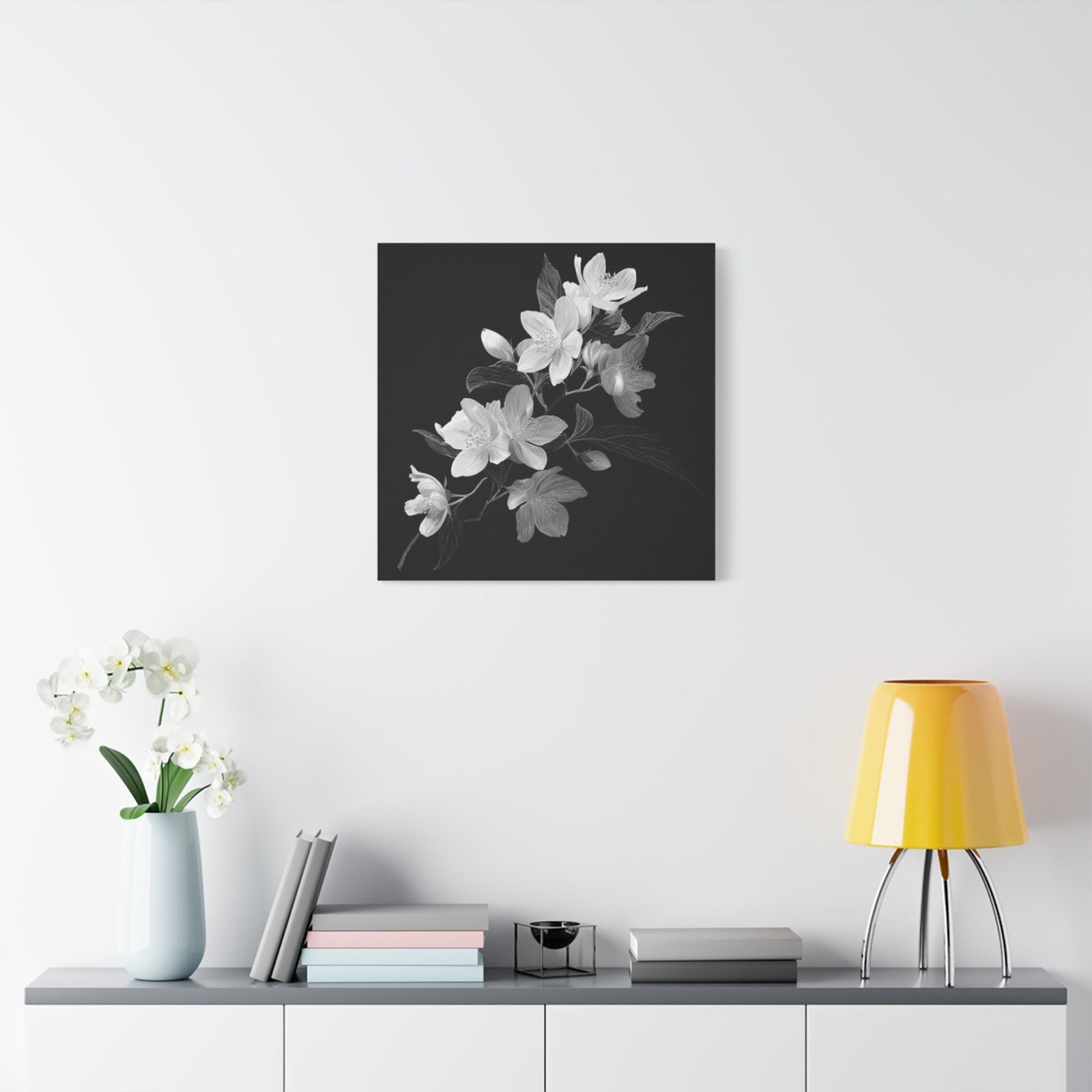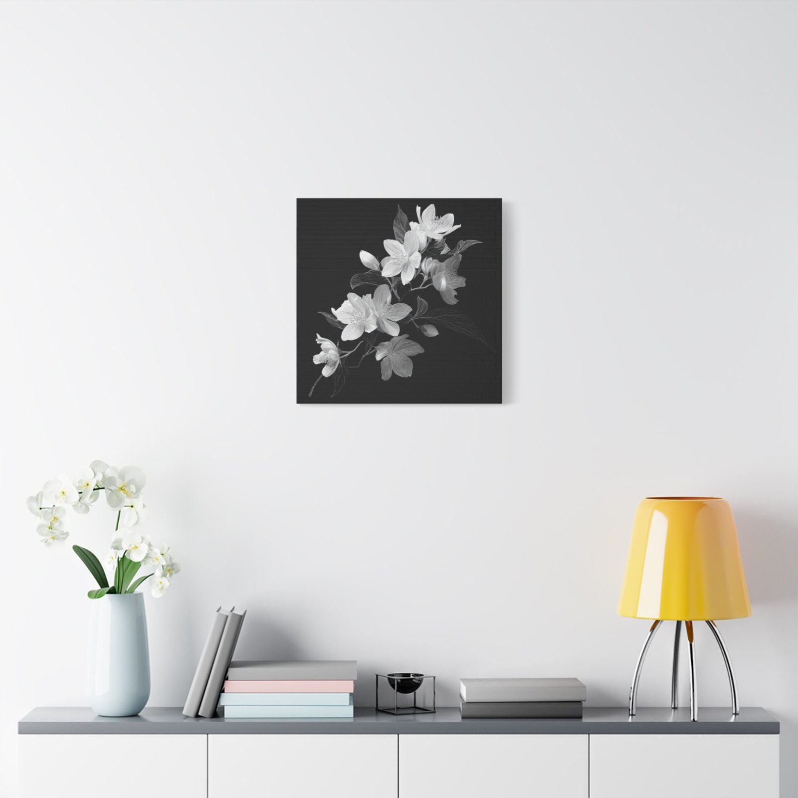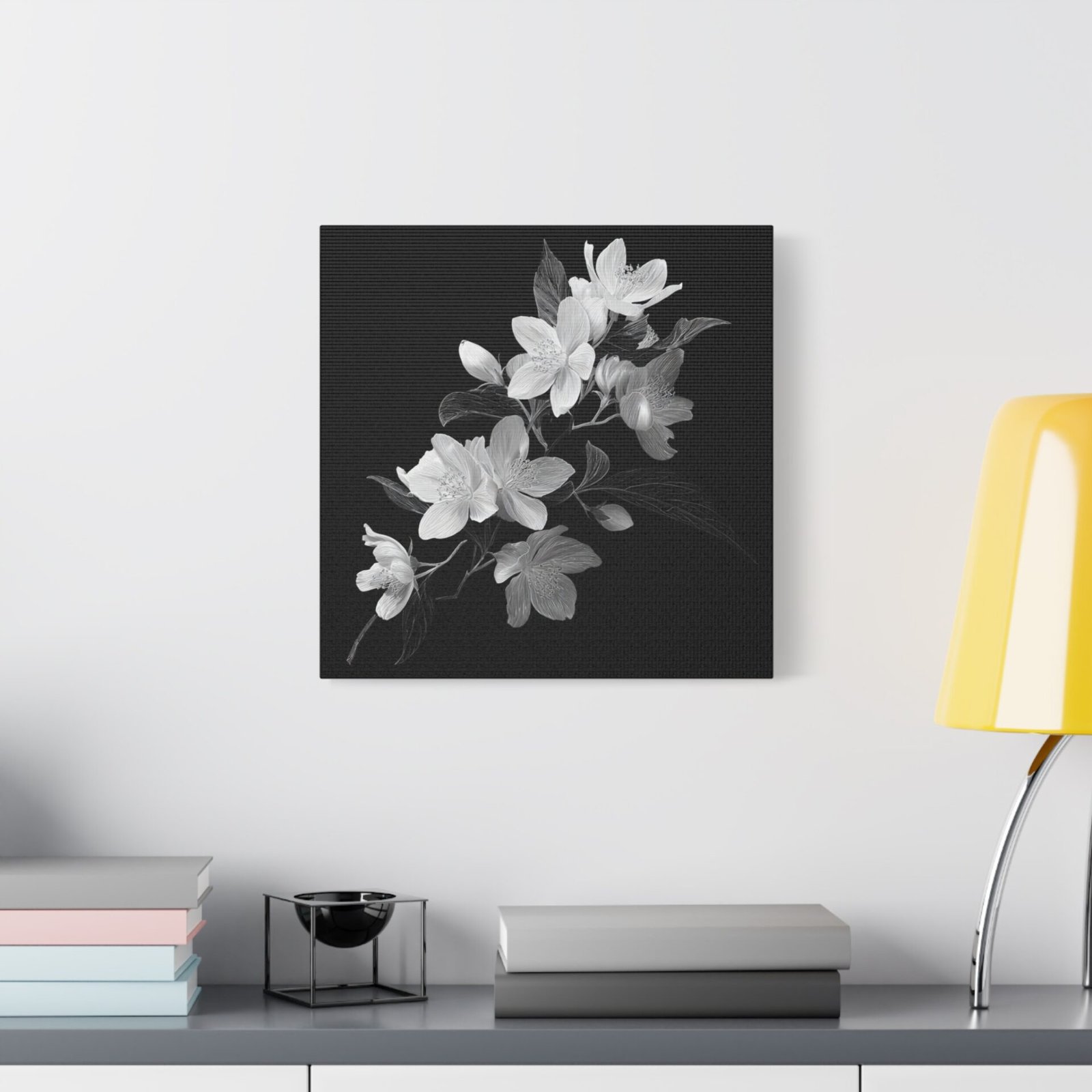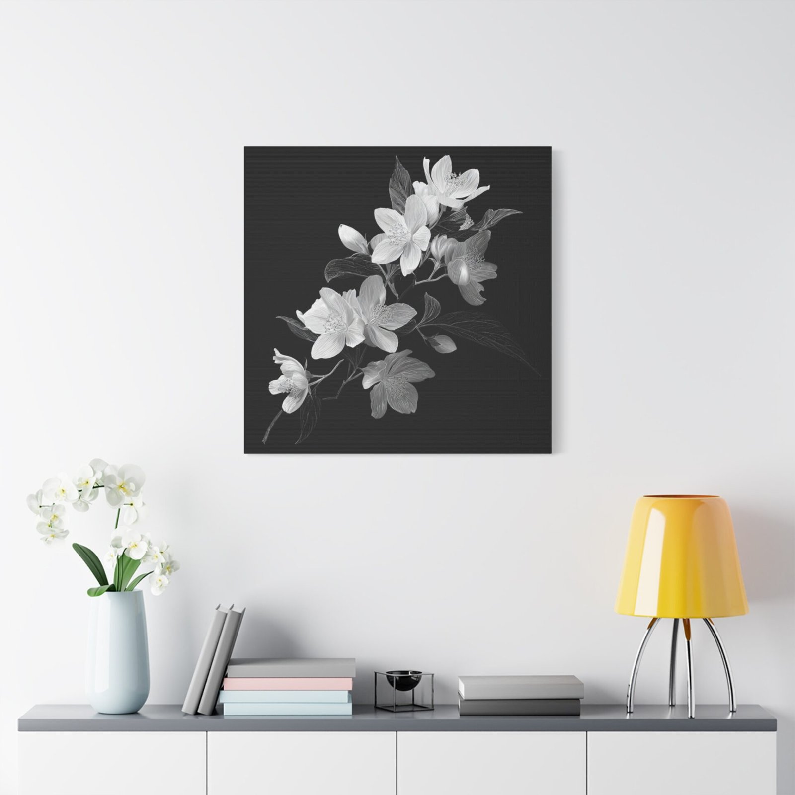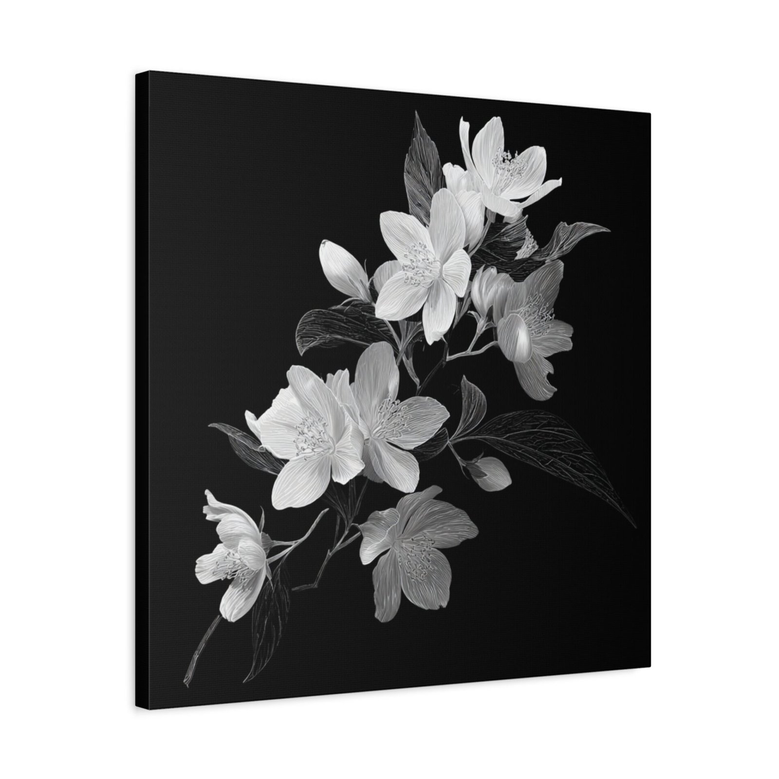 Découvrez notre Tableau Noir & Blanc Jasmin, une représentation délicate d’une branche de jasmin aux fleurs blanches détaillées, tombant en cascade sur un fond noir profond. Cette oeuvre de style illustration botanique offre une composition monochromatique à contraste élevé, avec des pétales et des feuilles qui coulent avec élégance, le tout enrichi par un travail de ligne détaillé. L’éclairage artistique du clair-obscur ajoute une touche dramatique, tout en conservant une esthétique minimaliste.