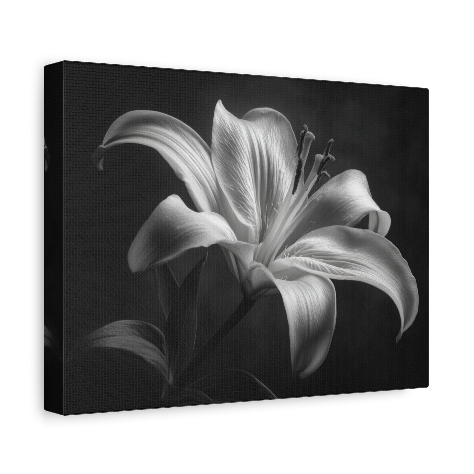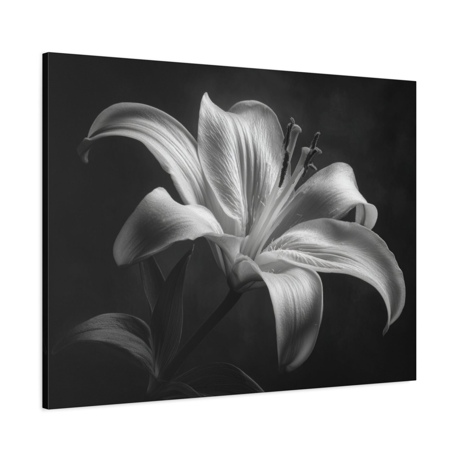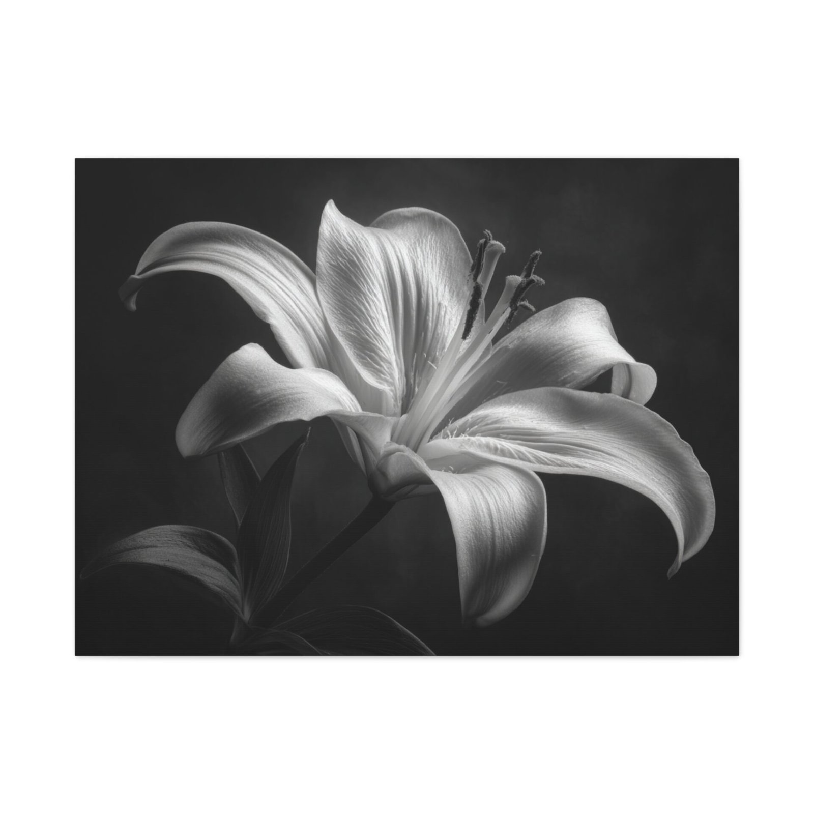 Découvrez le Tableau Noir & Blanc Lys, une étude botanique artistique qui capture la grâce et l’élégance d’une fleur de lys en pleine floraison. La photographie en noir et blanc classique met en valeur les pétales courbés élégants, les étamines visibles et le pollen. L’éclairage doux et dramatique crée une profondeur et une dimension, transformant cette image en une véritable œuvre d’art. La composition minimaliste contre un fond sombre met en valeur la texture détaillée des pétales lisses et les ombres artistiques qui soulignent l’élégance naturelle de la fleur.