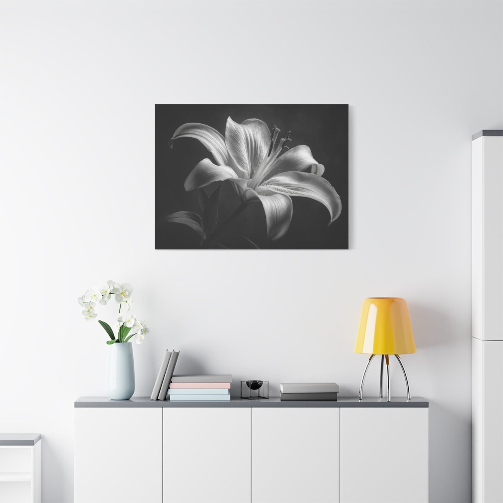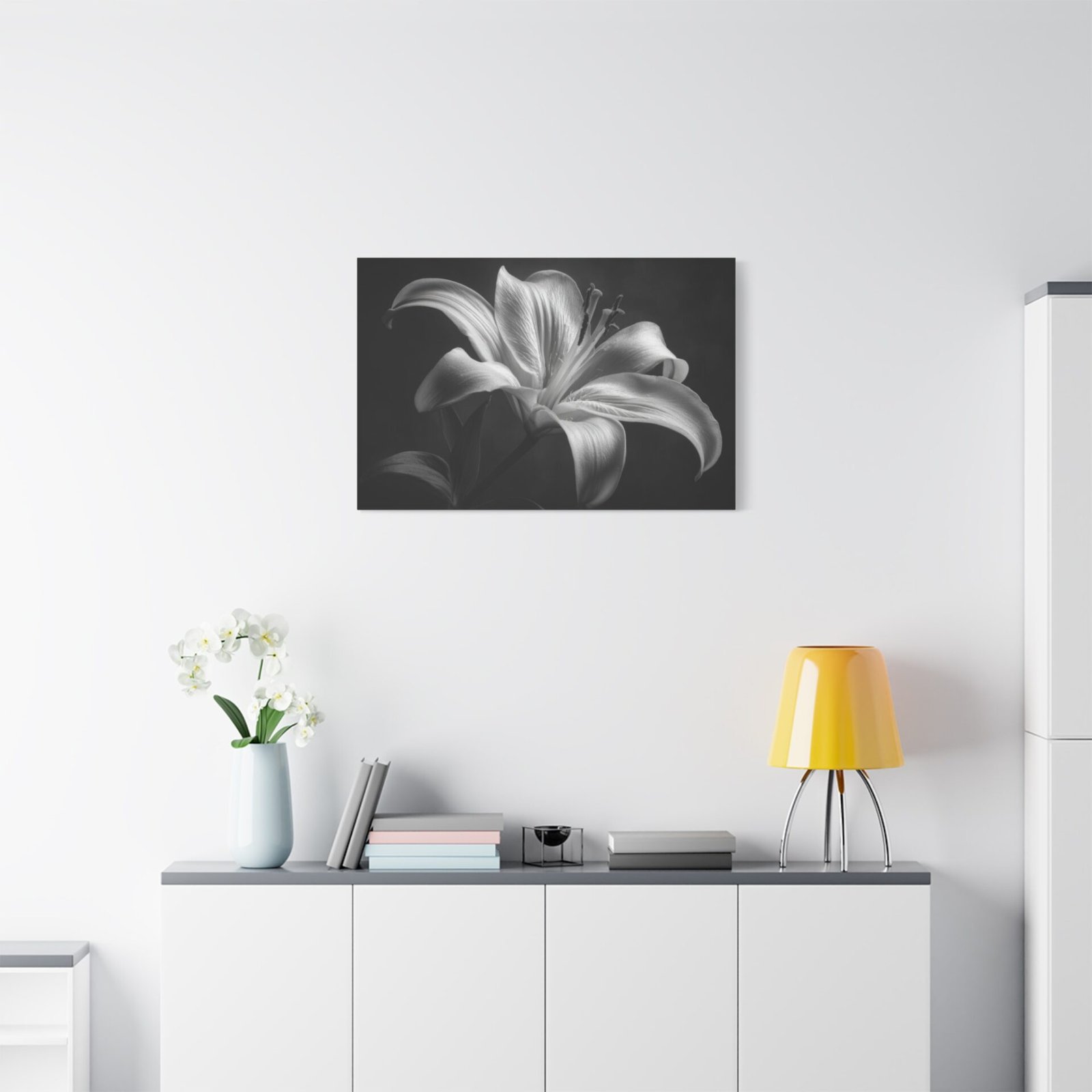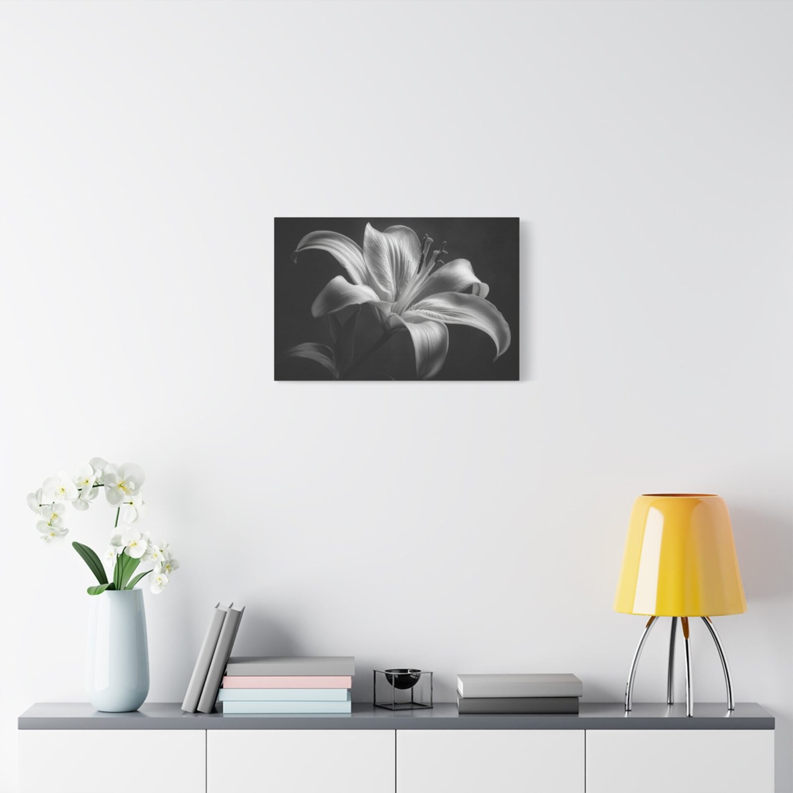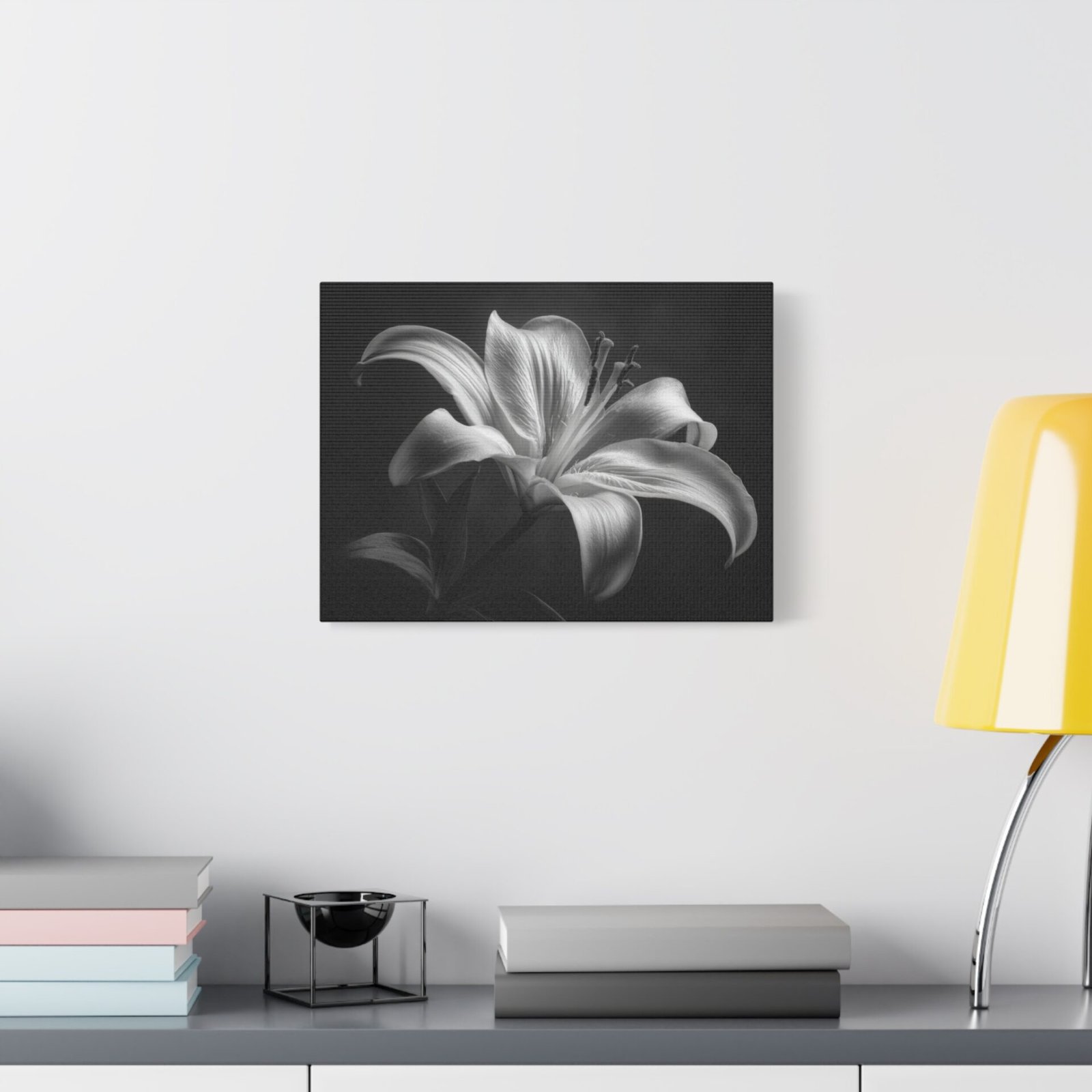 Découvrez le Tableau Noir & Blanc Lys, une étude botanique artistique qui capture la grâce et l’élégance d’une fleur de lys en pleine floraison. La photographie en noir et blanc classique met en valeur les pétales courbés élégants, les étamines visibles et le pollen. L’éclairage doux et dramatique crée une profondeur et une dimension, transformant cette image en une véritable œuvre d’art. La composition minimaliste contre un fond sombre met en valeur la texture détaillée des pétales lisses et les ombres artistiques qui soulignent l’élégance naturelle de la fleur.