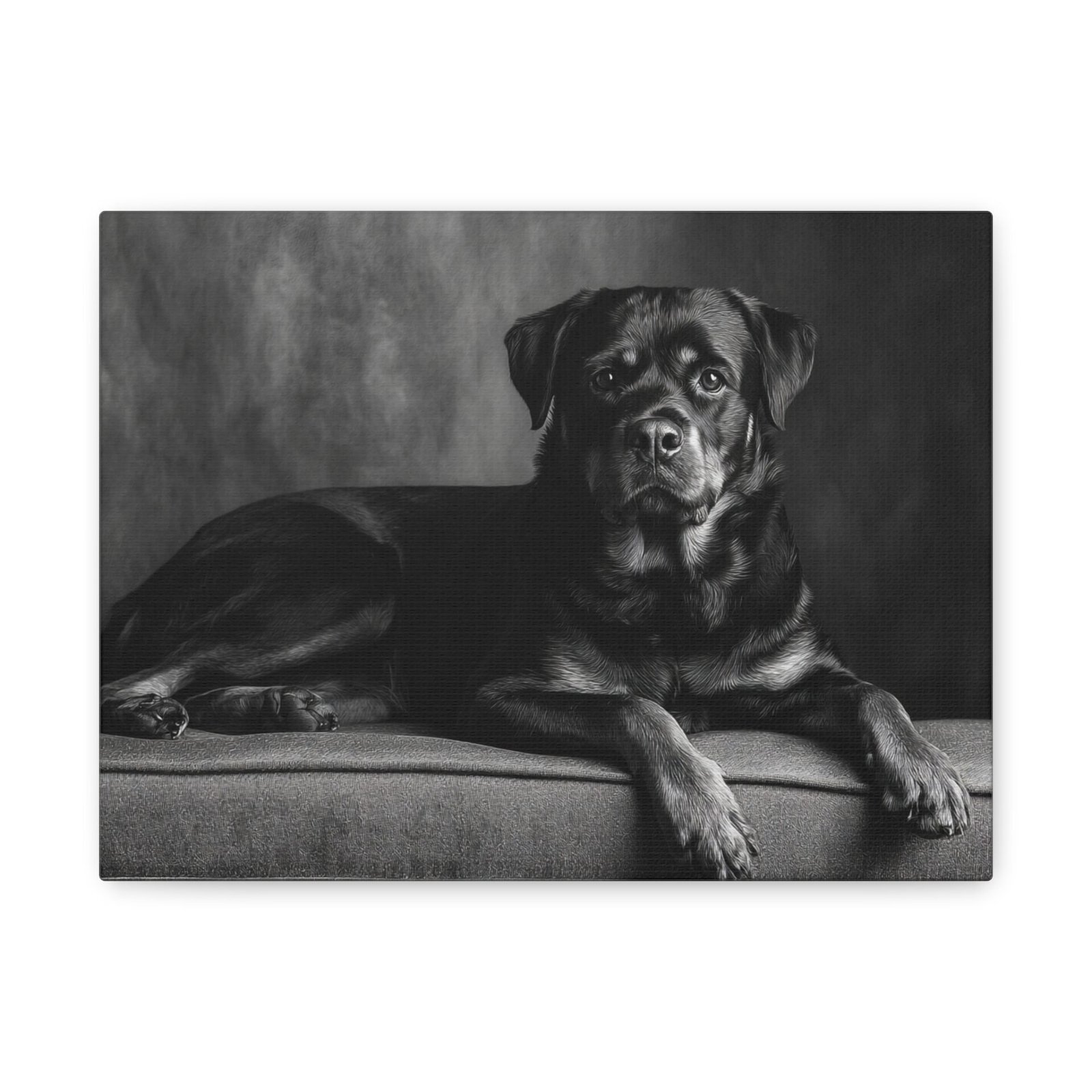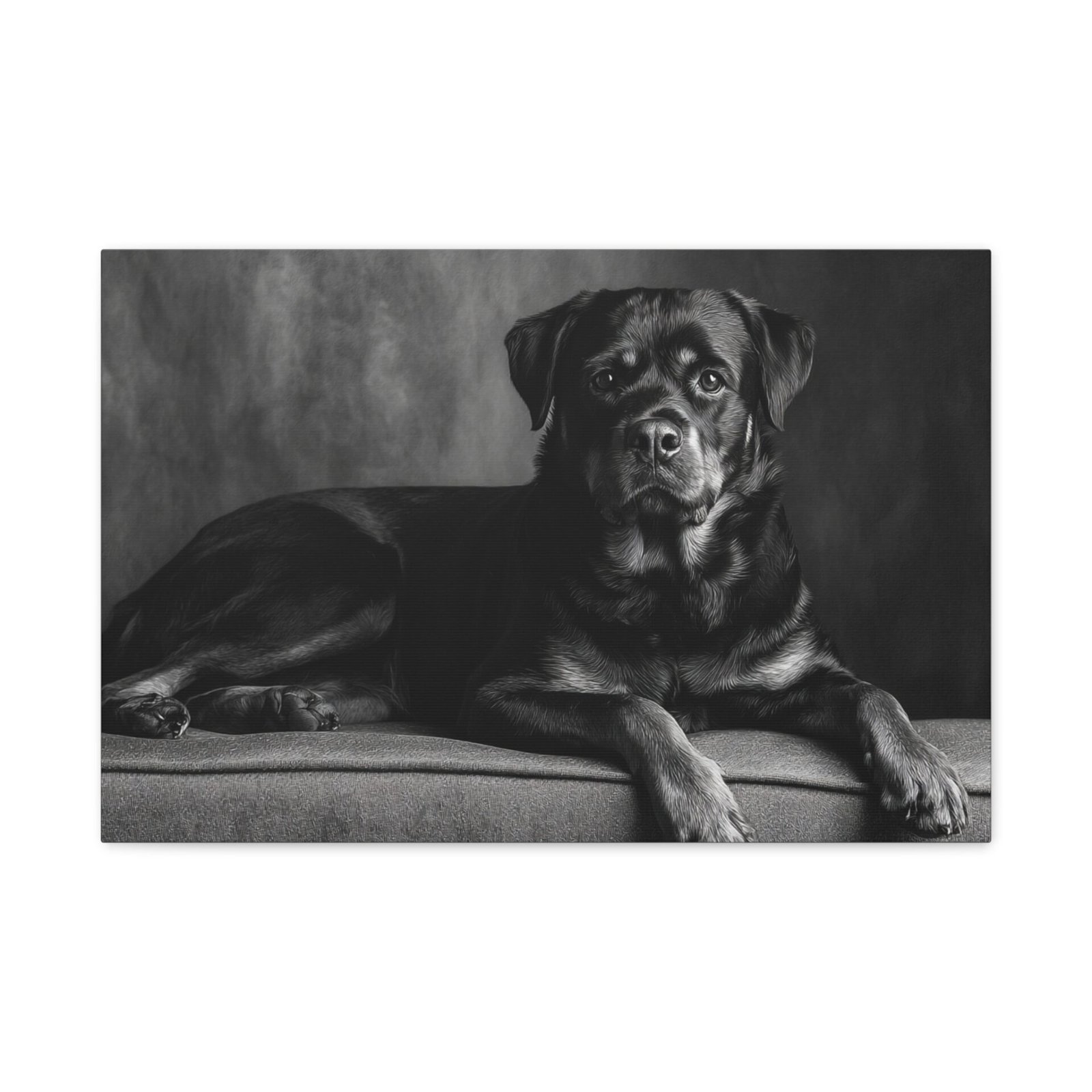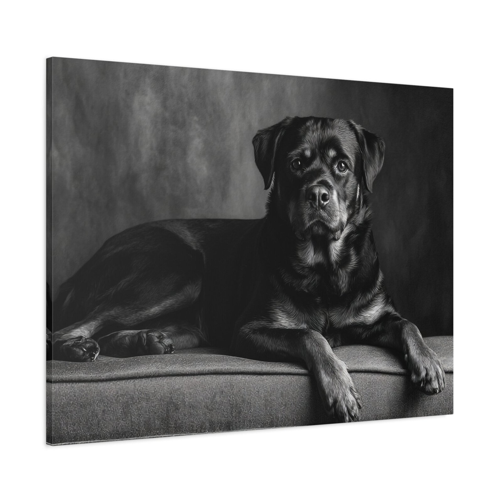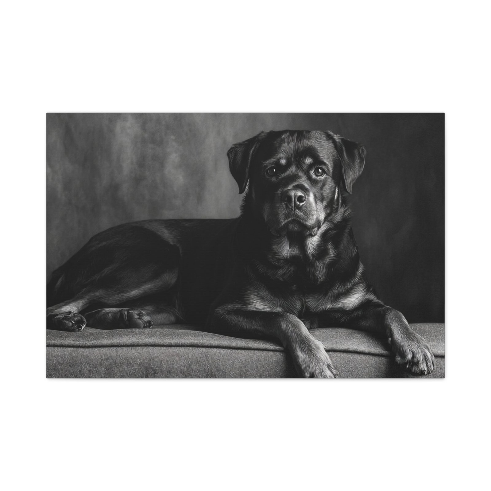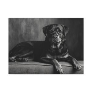 Offrez-vous un morceau de fine art avec ce tableau noir et blanc représentant un Rottweiler. Capturé dans une photographie de studio élégante, ce tableau met en valeur la puissance musculaire et l’expression confiante de cette race de chien. Les yeux alertes et intelligents du Rottweiler sont magnifiquement rendus, ajoutant une touche de sophistication à votre décoration. Sa pose assise digne est parfaitement encadrée dans une composition intemporelle, idéale pour être mise en valeur au-dessus de la cheminée. Ce tableau apportera une esthétique de luxe à votre décoration intérieure.