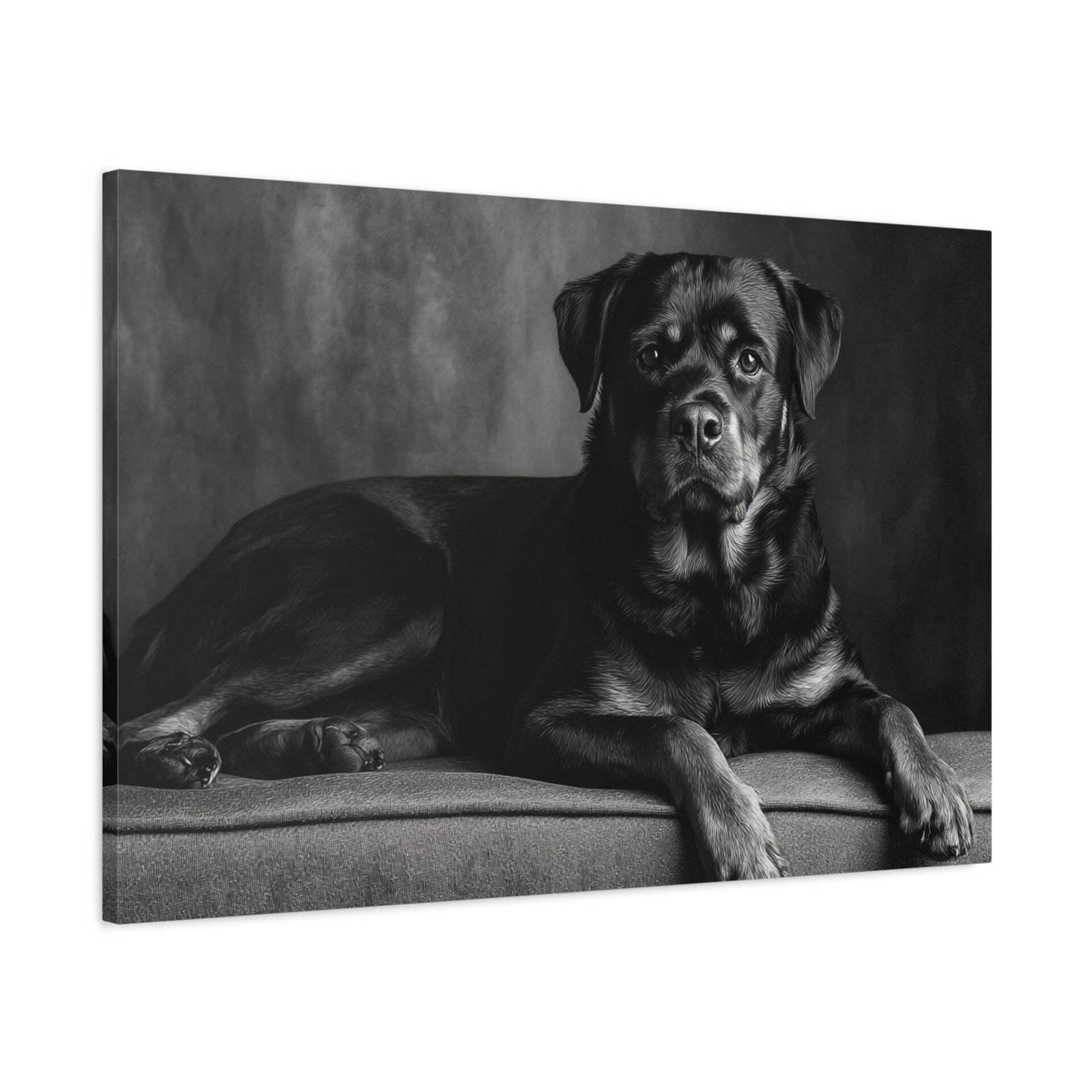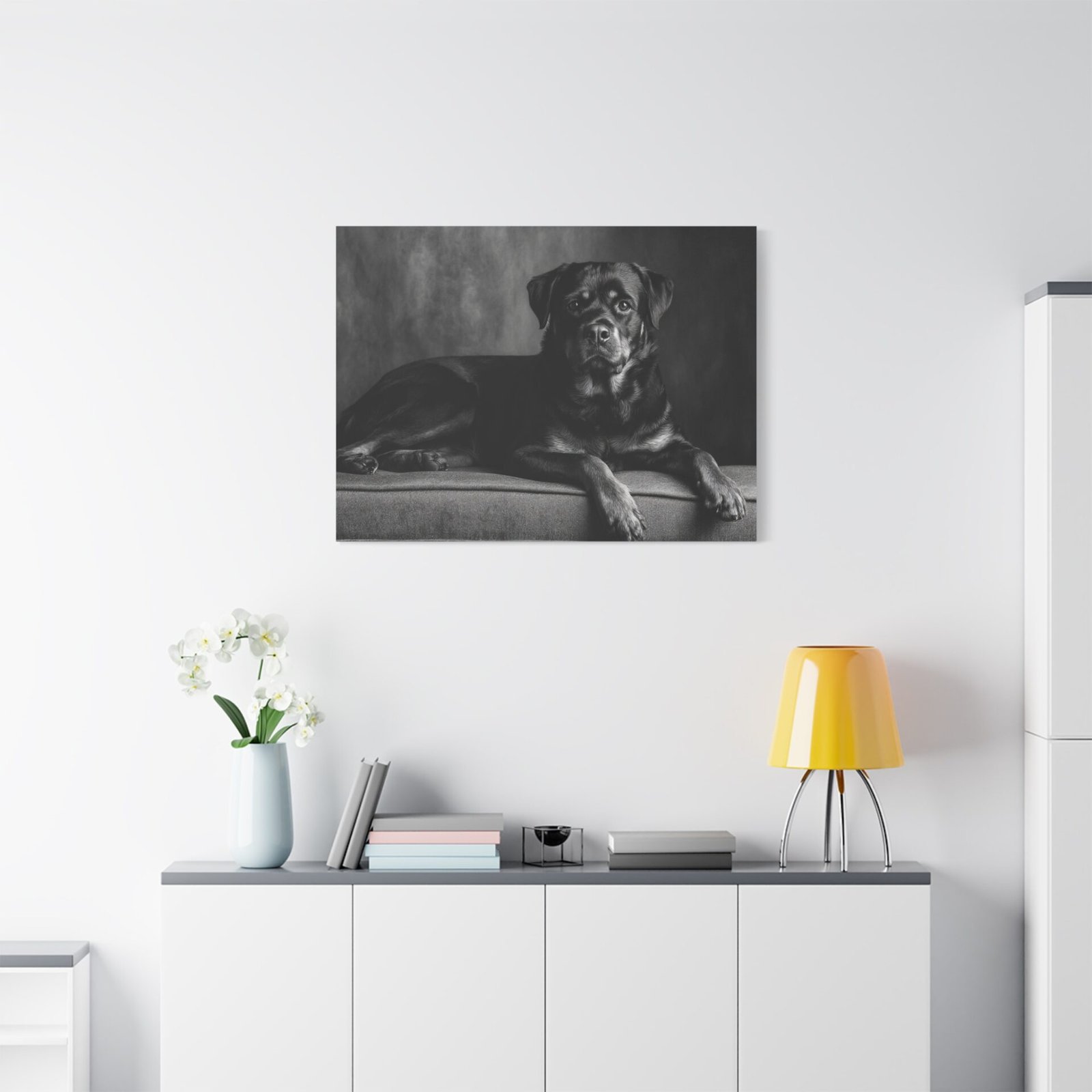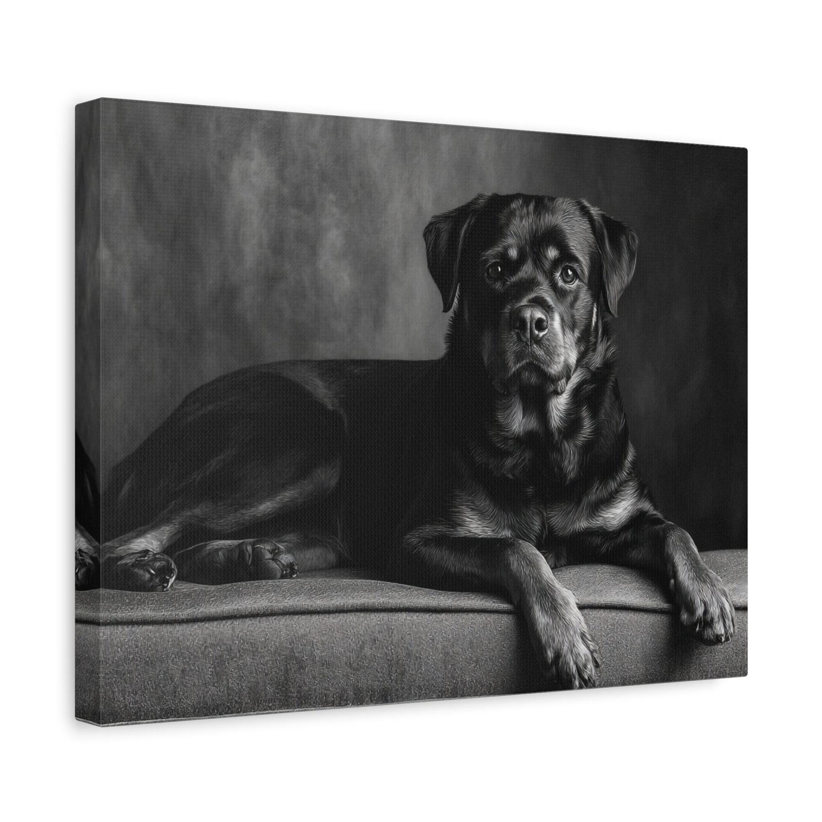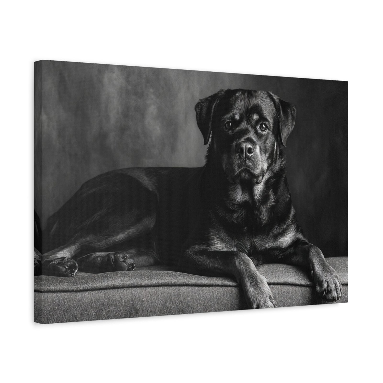Offrez-vous un morceau de fine art avec ce tableau noir et blanc représentant un Rottweiler. Capturé dans une photographie de studio élégante, ce tableau met en valeur la puissance musculaire et l’expression confiante de cette race de chien. Les yeux alertes et intelligents du Rottweiler sont magnifiquement rendus, ajoutant une touche de sophistication à votre décoration. Sa pose assise digne est parfaitement encadrée dans une composition intemporelle, idéale pour être mise en valeur au-dessus de la cheminée. Ce tableau apportera une esthétique de luxe à votre décoration intérieure.