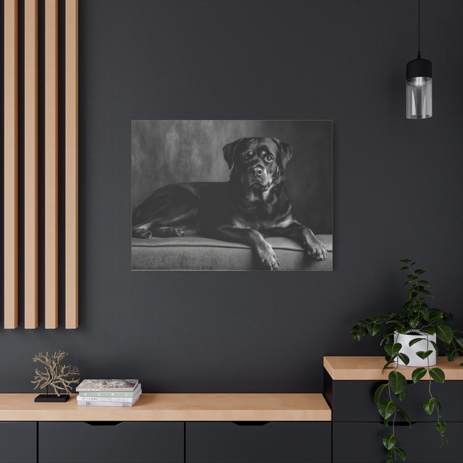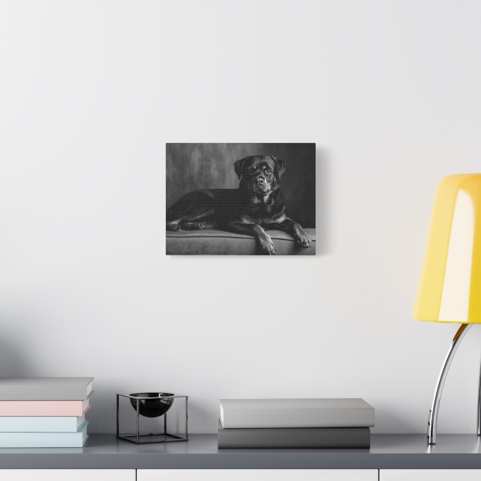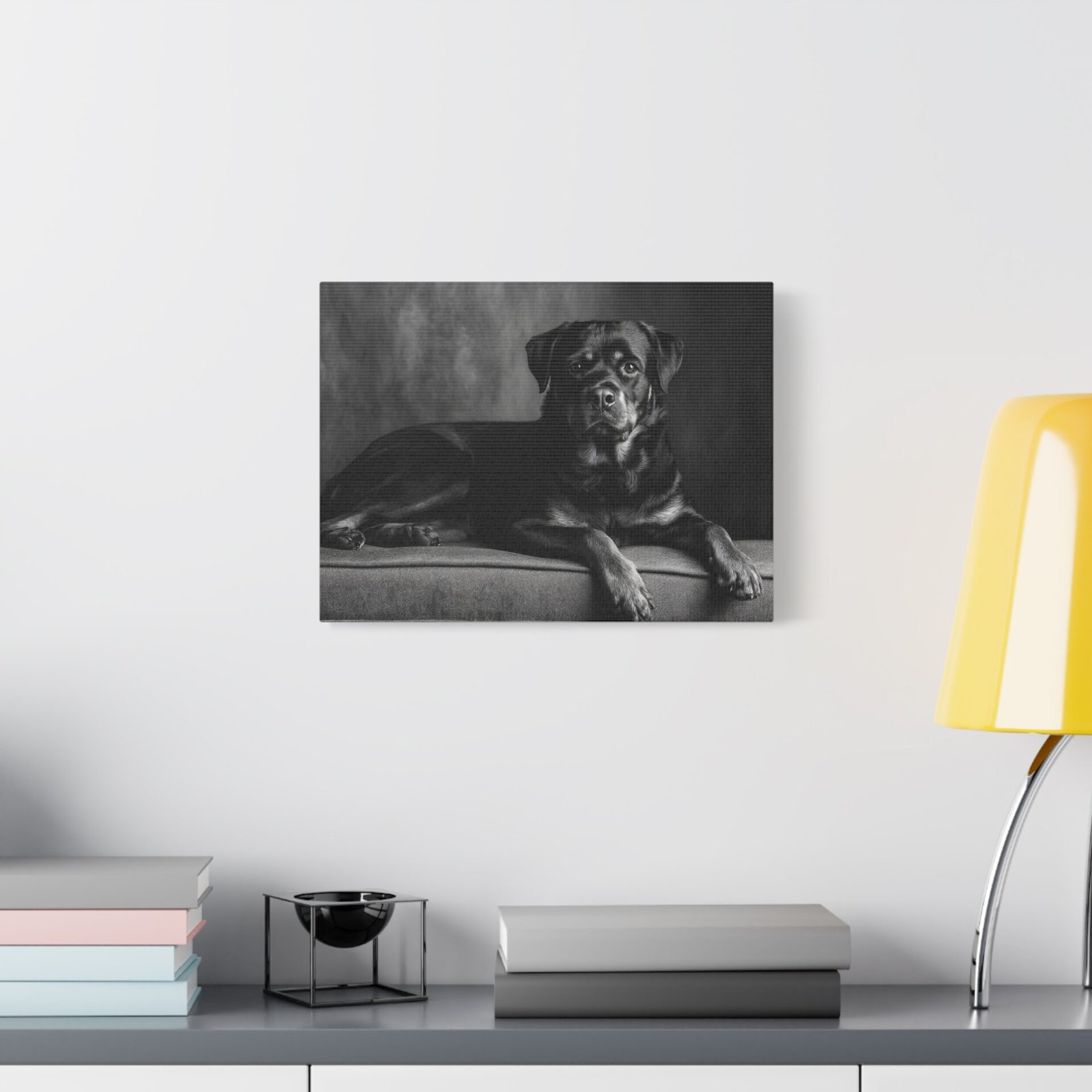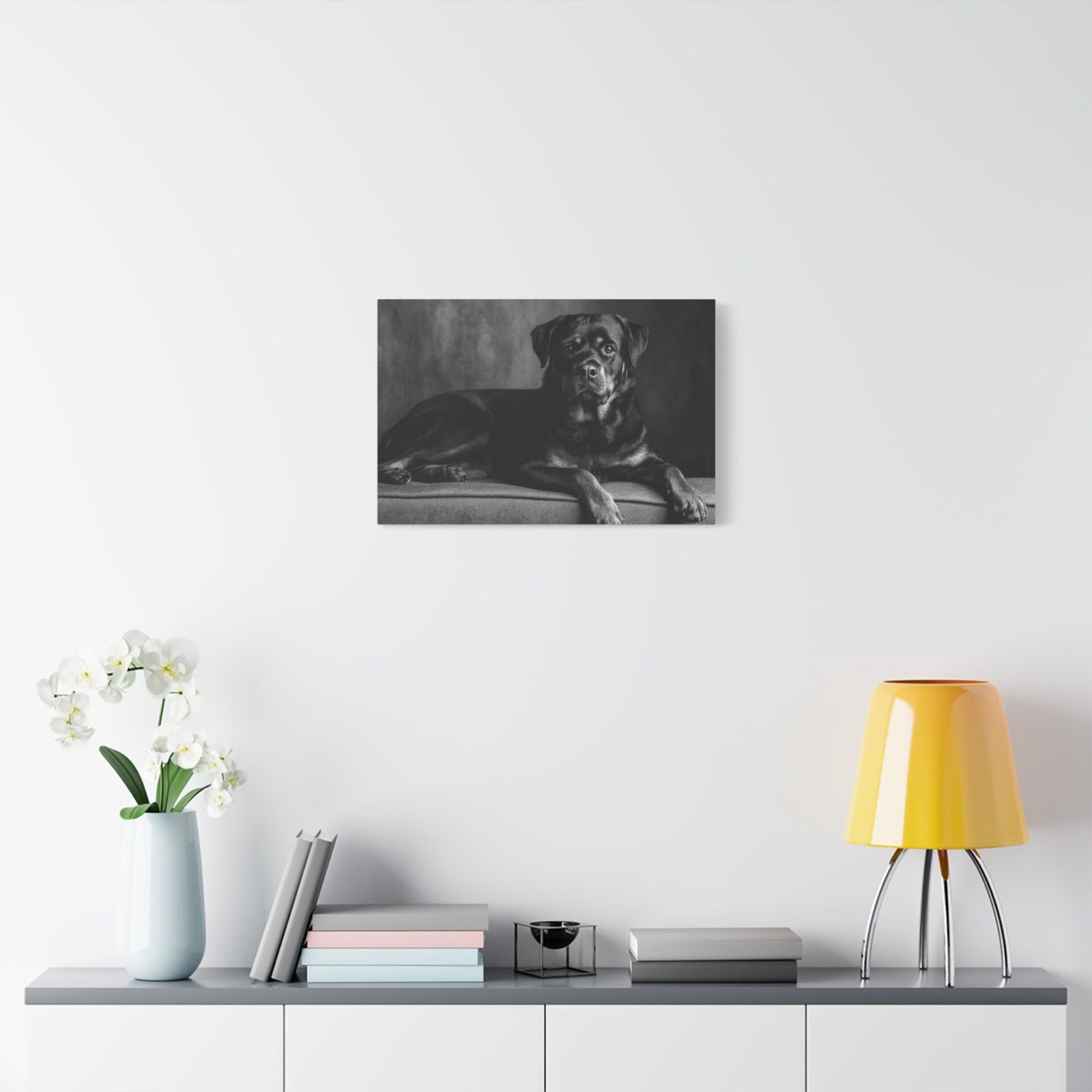 Offrez-vous un morceau de fine art avec ce tableau noir et blanc représentant un Rottweiler. Capturé dans une photographie de studio élégante, ce tableau met en valeur la puissance musculaire et l’expression confiante de cette race de chien. Les yeux alertes et intelligents du Rottweiler sont magnifiquement rendus, ajoutant une touche de sophistication à votre décoration. Sa pose assise digne est parfaitement encadrée dans une composition intemporelle, idéale pour être mise en valeur au-dessus de la cheminée. Ce tableau apportera une esthétique de luxe à votre décoration intérieure.