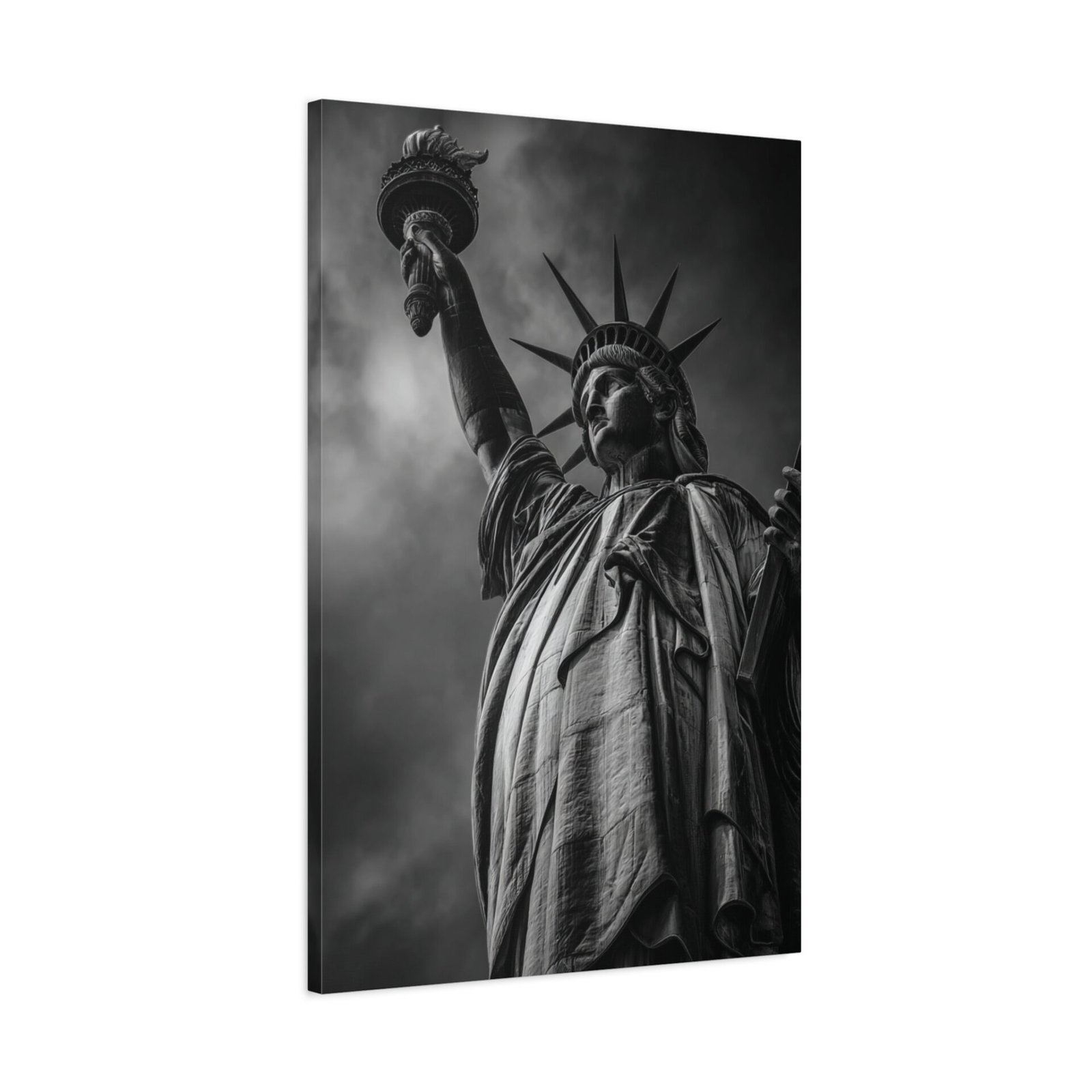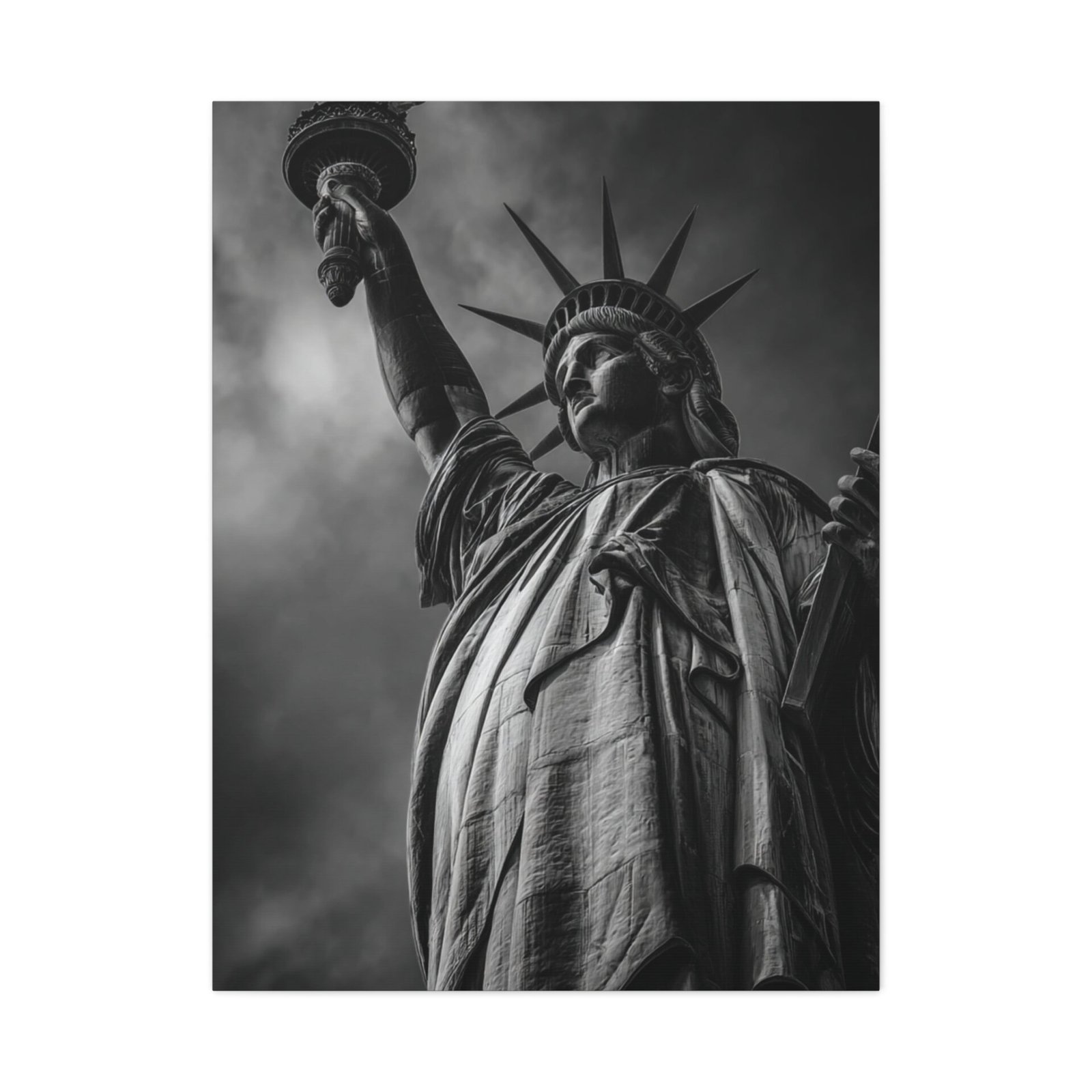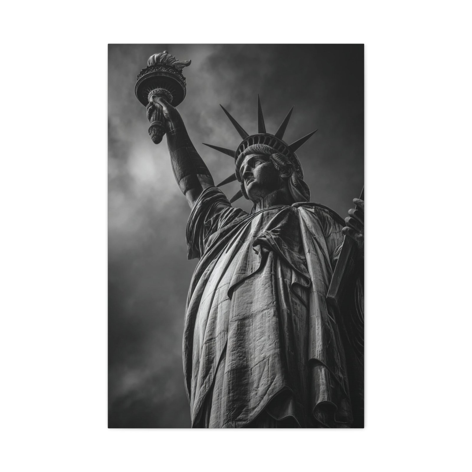 Sublimez votre intérieur avec ce Tableau Noir & Blanc : Statue de la Liberté. Cette photographie en noir et blanc représente de manière majestueuse la Statue de la Liberté se dressant fièrement sur Liberty Island. Le cliché, pris sous un angle ascendant puissant, met en valeur les détails intriqués des robes drapées et de la couronne. Le flambeau, tenu haut dans le ciel orageux, crée un contraste saisissant. Cette pièce est un véritable chef-d’œuvre monochrome, mettant en lumière les textures sculpturales de ce symbole patriotique. Le port de New York en arrière-plan ajoute une touche de cinématographie à la composition. Ce tableau sera parfait pour apporter une touche d’art et d’histoire à votre décoration.