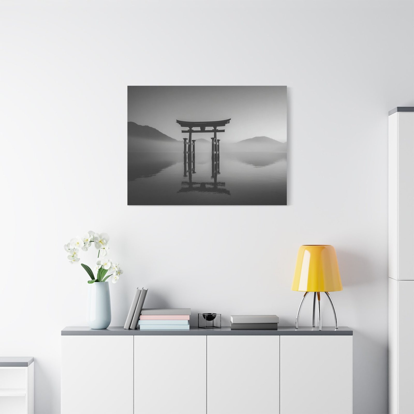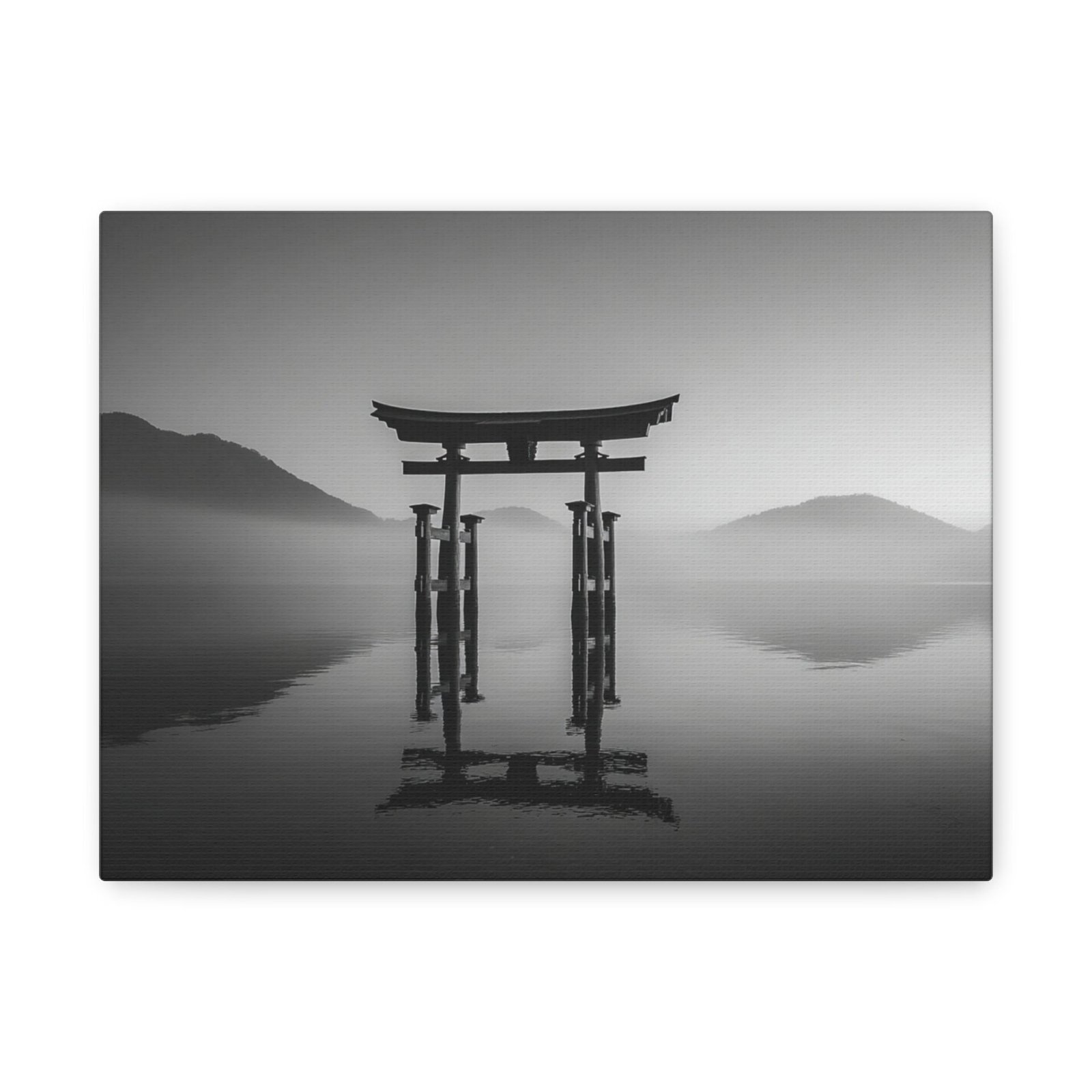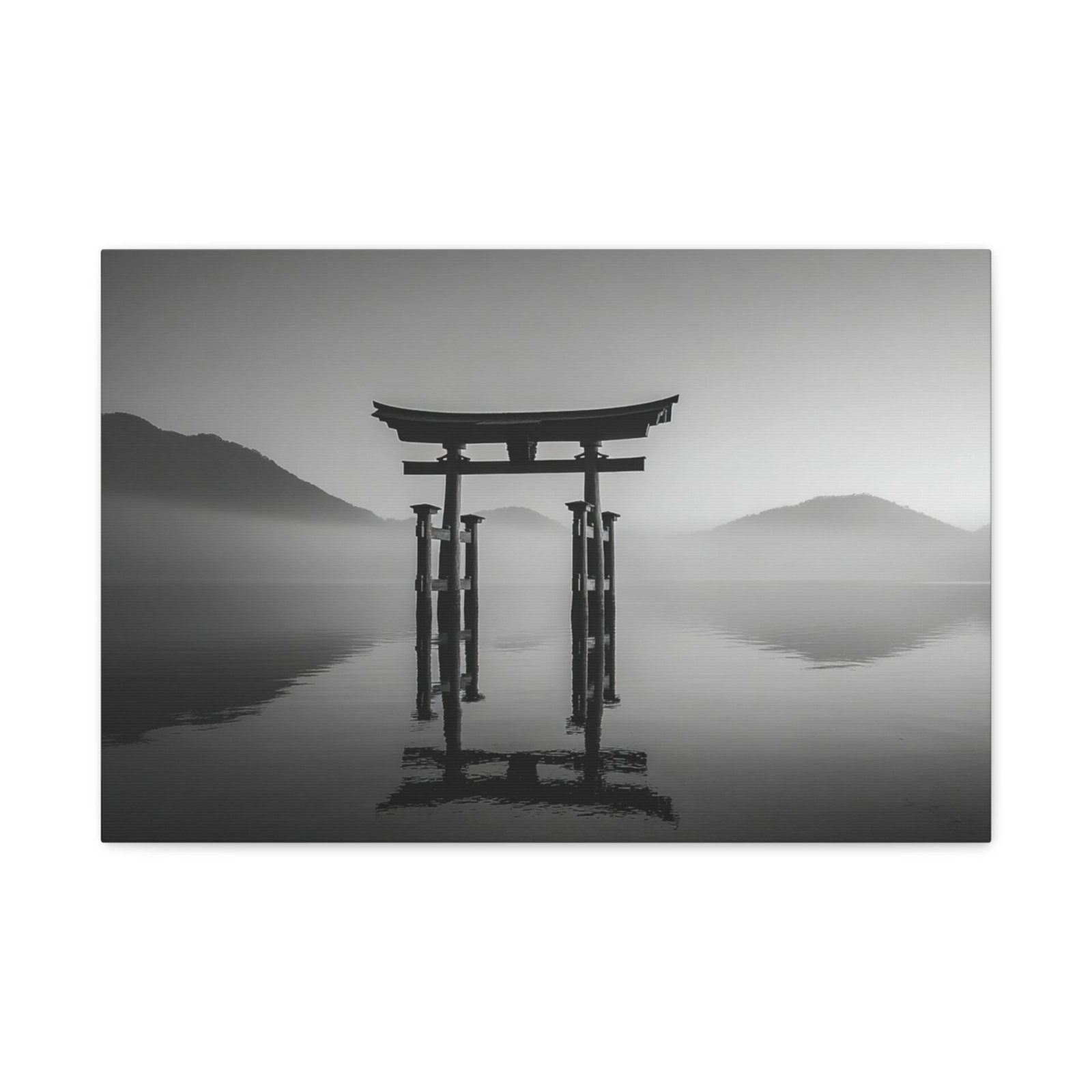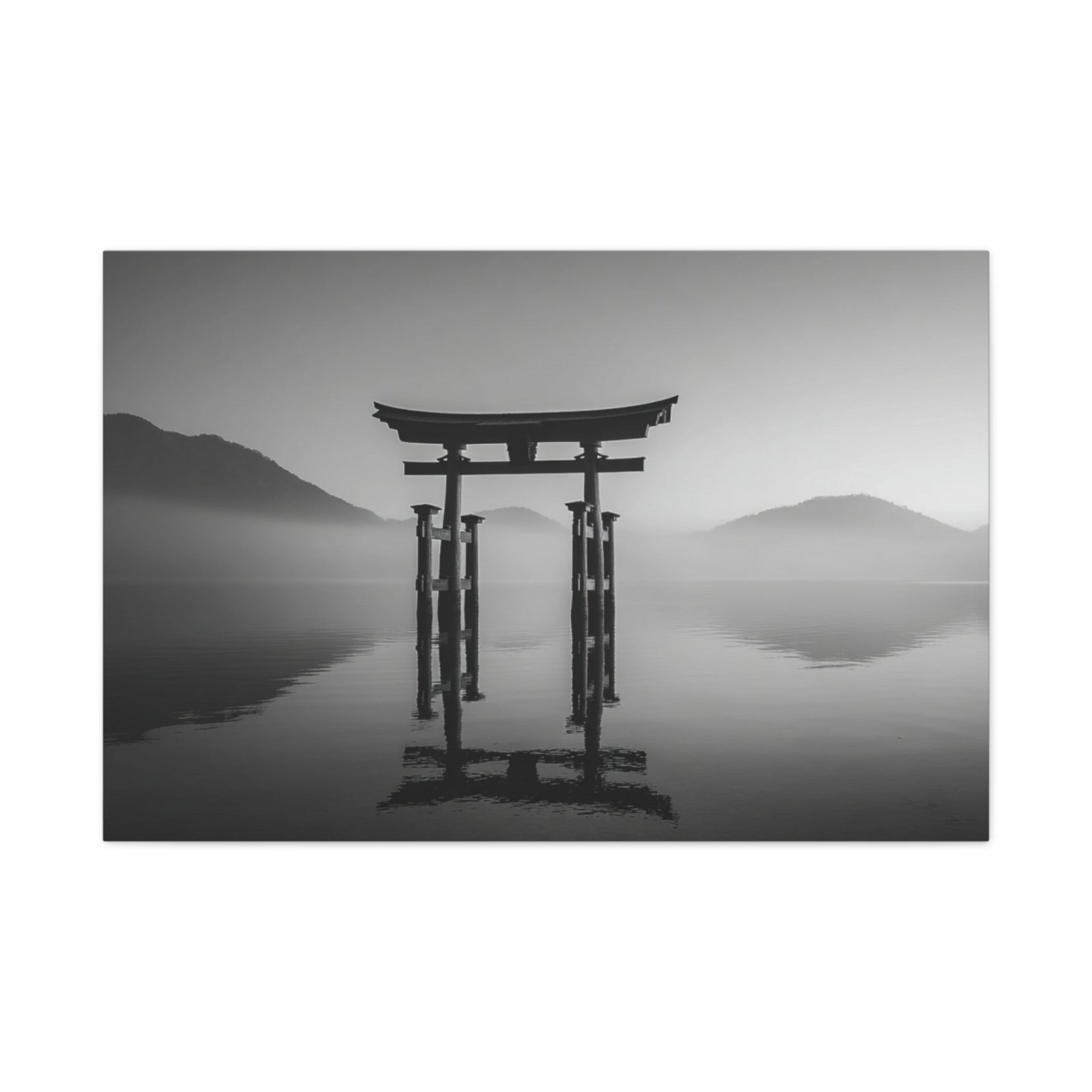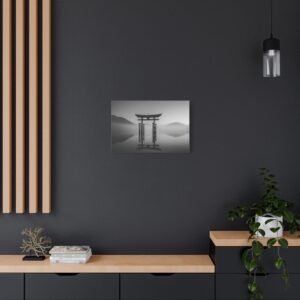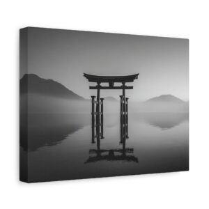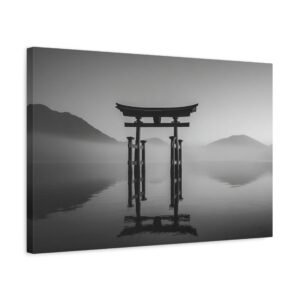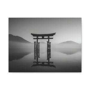 Admirez la majesté du Tableau Noir & Blanc Torii Japonais. Ce tableau représente un torii traditionnel japonais se dressant fièrement sur une eau calme. La composition monochromatique met en valeur les lignes verticales fortes du torii, créant un contraste dramatique entre la structure en bois sombre et le ciel lumineux. L’arrière-plan brumeux des montagnes ajoute une touche de mystère à ce paysage classique japonais en tons de gris. Avec son esthétique zen minimaliste, ce tableau apportera une ambiance sereine et apaisante à votre intérieur.