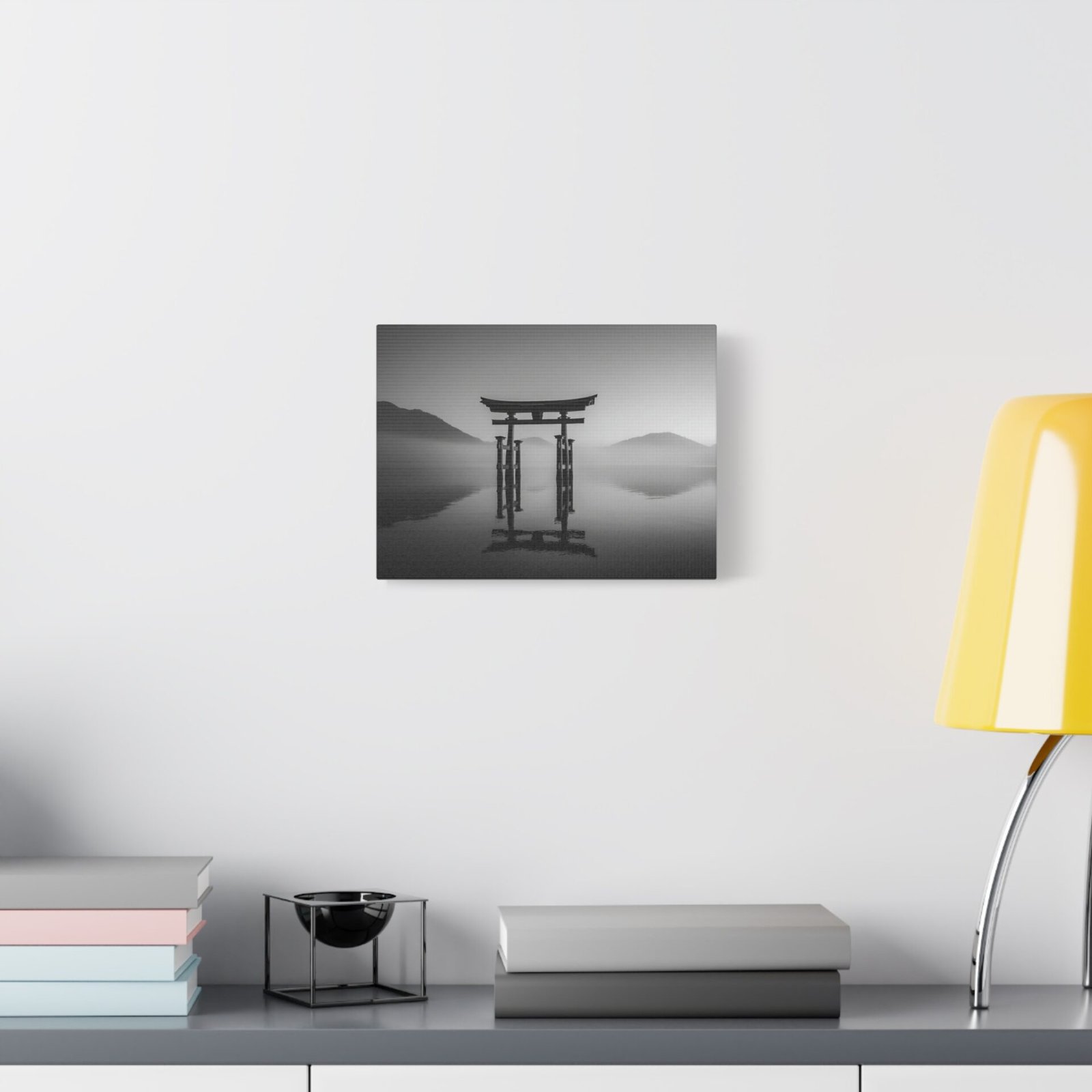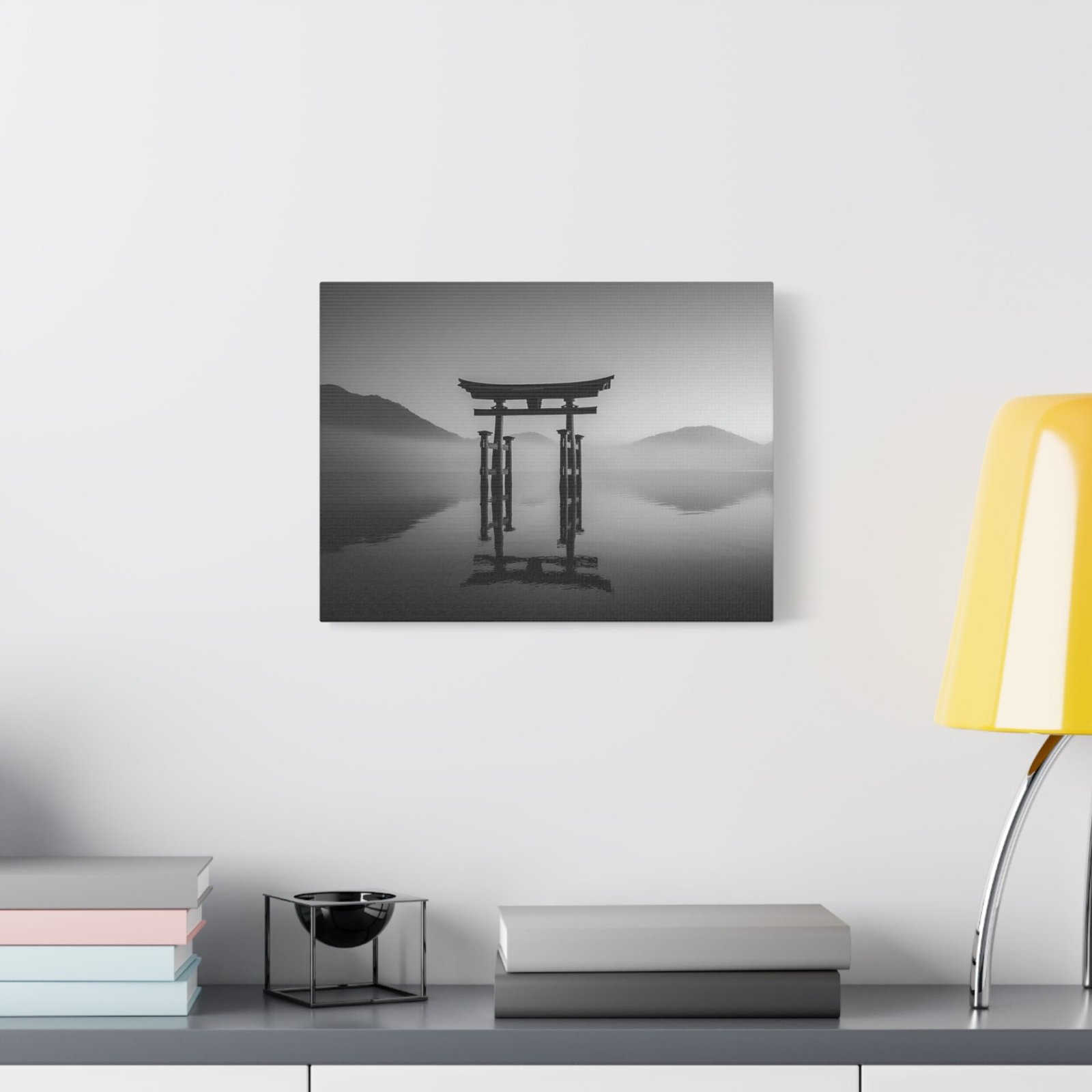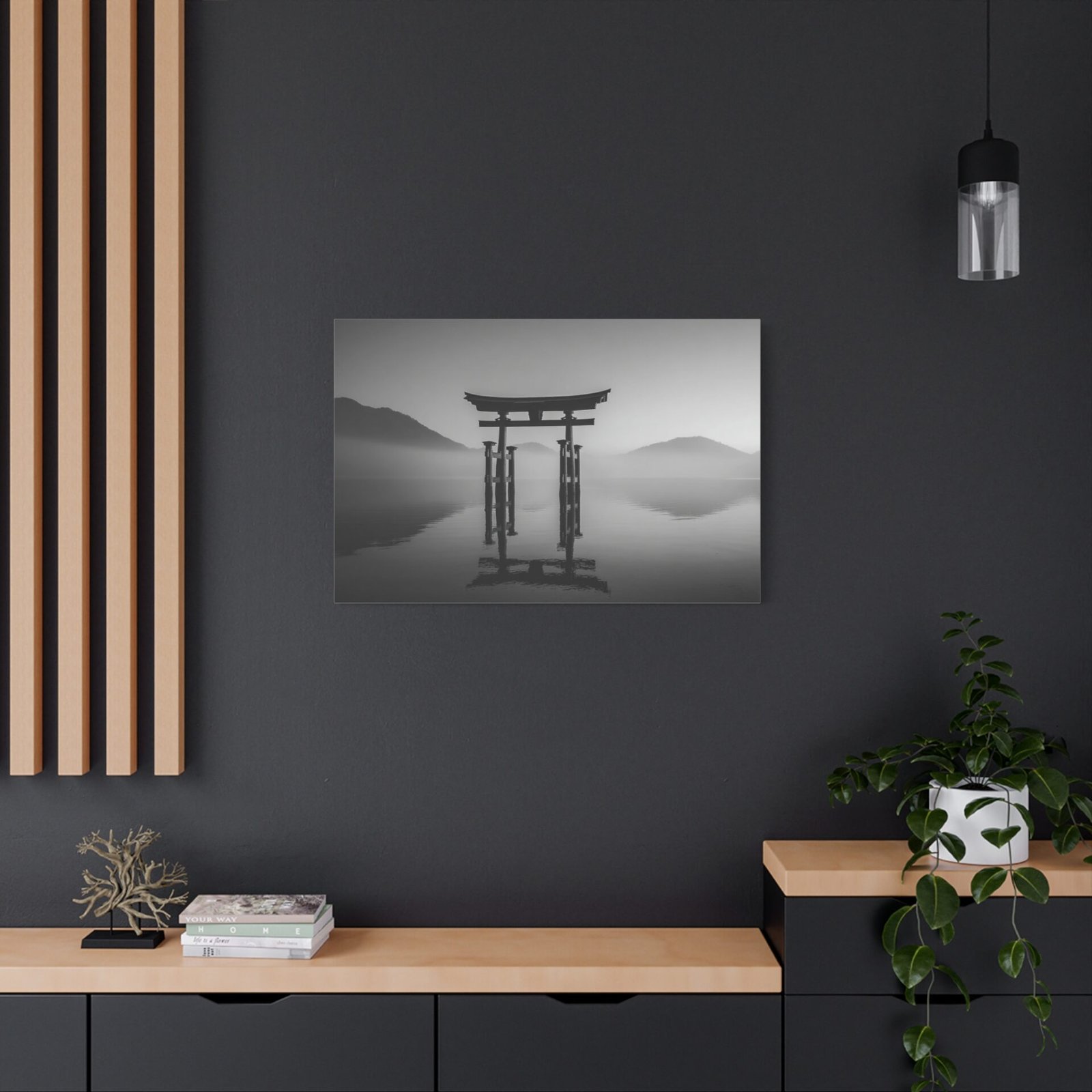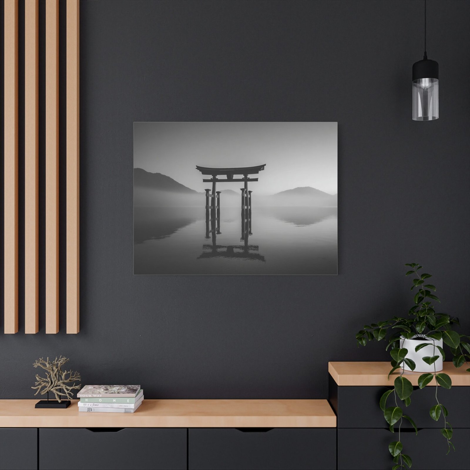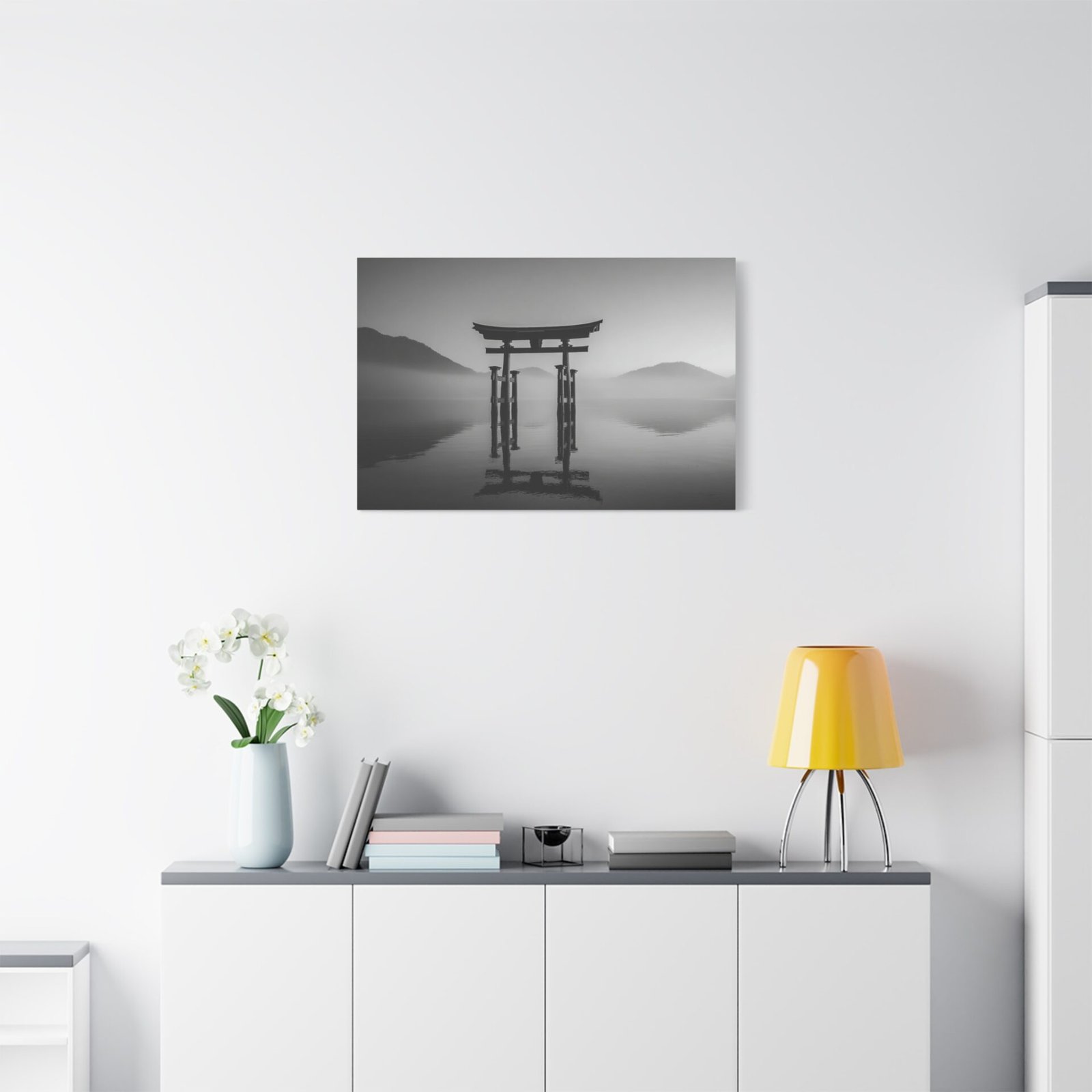 Admirez la majesté du Tableau Noir & Blanc Torii Japonais. Ce tableau représente un torii traditionnel japonais se dressant fièrement sur une eau calme. La composition monochromatique met en valeur les lignes verticales fortes du torii, créant un contraste dramatique entre la structure en bois sombre et le ciel lumineux. L’arrière-plan brumeux des montagnes ajoute une touche de mystère à ce paysage classique japonais en tons de gris. Avec son esthétique zen minimaliste, ce tableau apportera une ambiance sereine et apaisante à votre intérieur.