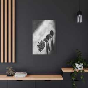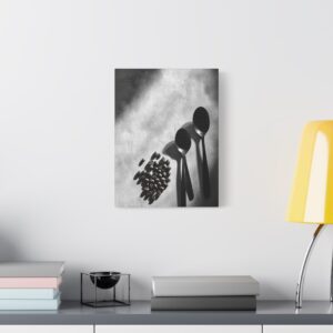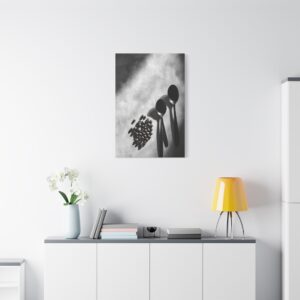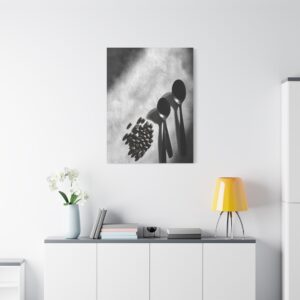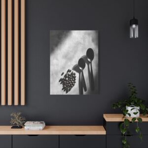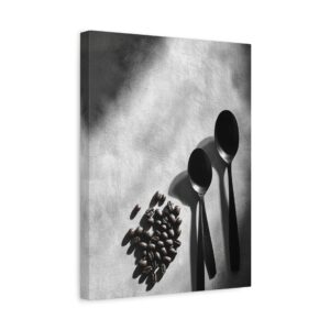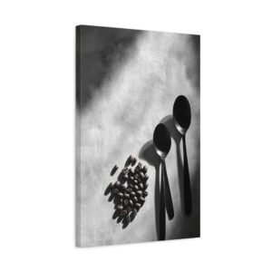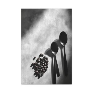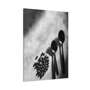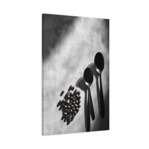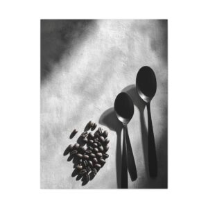 Sublimez votre espace culinaire avec cette composition monochrome raffinée mettant en scène un ballet de grains de café et d’ustensiles vintage. Les ombres dramatiques et les textures saisissantes créent une atmosphère sophistiquée, parfaite pour une décoration de cuisine contemporaine.