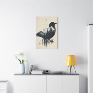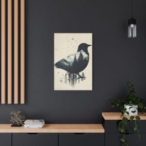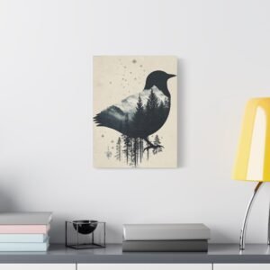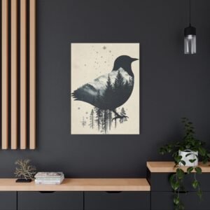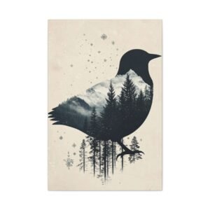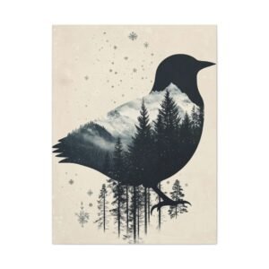 Laissez-vous transporter par la magie de cette illustration nordique contemporaine où la silhouette d’un oiseau devient le cadre d’un paysage enchanteur. Les pins majestueux et les bouleaux élancés se dévoilent avec grâce dans cette composition unique, créant une narration visuelle captivante.