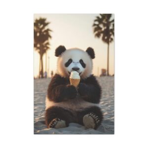 Laissez-vous séduire par cette œuvre photographique unique qui capture un moment surréaliste et enchanteur. Ce cliché hyperréaliste met en scène un panda géant dégustant une glace triple boule sur la mythique plage de Venice Beach, créant un contraste saisissant entre nature et urbanité.