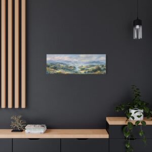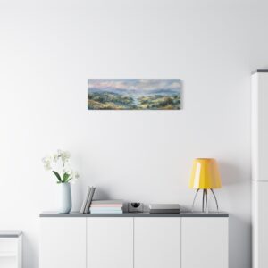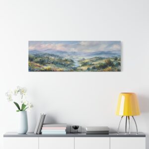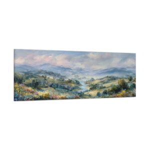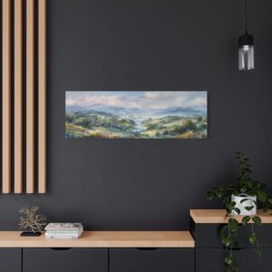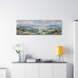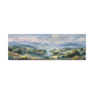 Sublimez votre intérieur avec ce Tableau Panoramique Aquarelle. Ce chef-d’œuvre présente un paysage panoramique à couper le souffle, peint à l’aquarelle. Des collines ondulantes couvertes de fleurs sauvages, une rivière sinueuse traversant la vallée, des montagnes lointaines enveloppées dans la brume matinale et un ciel expansif avec des nuages doux peints dans des lavis délicats de bleu et de rose. La technique traditionnelle de l’aquarelle avec un mélange humide sur humide crée une atmosphère lumineuse et rêveuse avec des transitions de couleur douces du premier plan chaud aux tons d’arrière-plan frais.