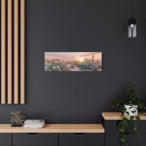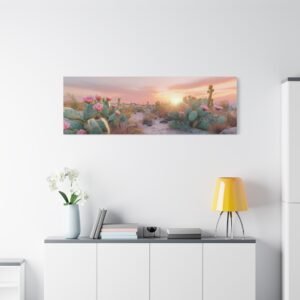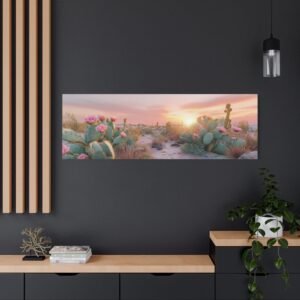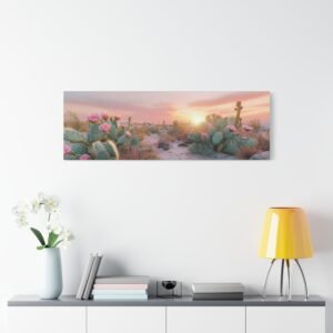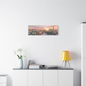 Parfait pour un salon moderne ou une chambre bohème, ce tableau s’harmonise magnifiquement avec des tons terreux et rosés. Pour un style desert modern, associez-le à des textiles naturels, des accessoires en terre cuite et quelques plantes succulentes réelles. L’effet panoramique apporte une profondeur exceptionnelle qui élargira visuellement votre pièce.
