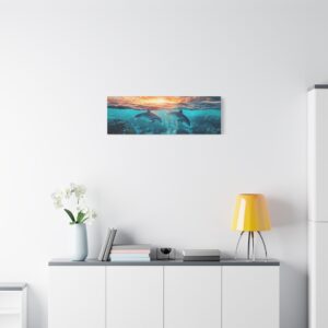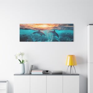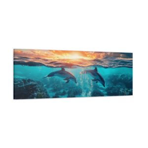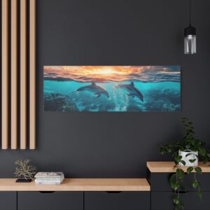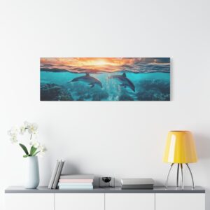 La composition dévoile un monde sous-marin fascinant où les récifs coralliens colorés se déploient sous la surface, tandis que les dauphins gracieux s’élancent vers le ciel dans une chorégraphie naturelle parfaite. La luminosité du soleil couchant baigne la scène d’une aura magique.