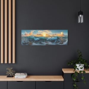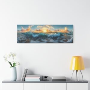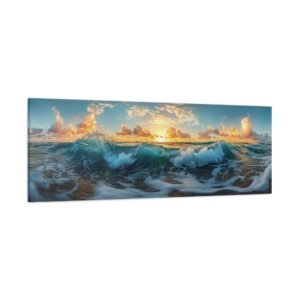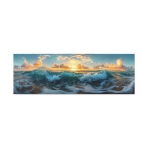 Laissez-vous transporter par la magie du littoral avec cette œuvre panoramique saisissante. Capturant l’instant précieux du golden hour, ce tableau sublime immortalise la rencontre harmonieuse entre ciel, mer et terre. Les teintes chaudes du soleil couchant se reflètent majestueusement sur les eaux calmes, créant une atmosphère apaisante et contemplative.