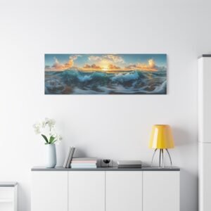 Cette toile panoramique s’intégrera parfaitement au-dessus d’un canapé ou dans une salle à manger contemporaine, apportant instantanément une touche de sérénité à votre intérieur. Son format allongé accentue la profondeur de la perspective et invite au voyage. Les nuances orangées et dorées insufflent une chaleur naturelle à votre espace de vie.