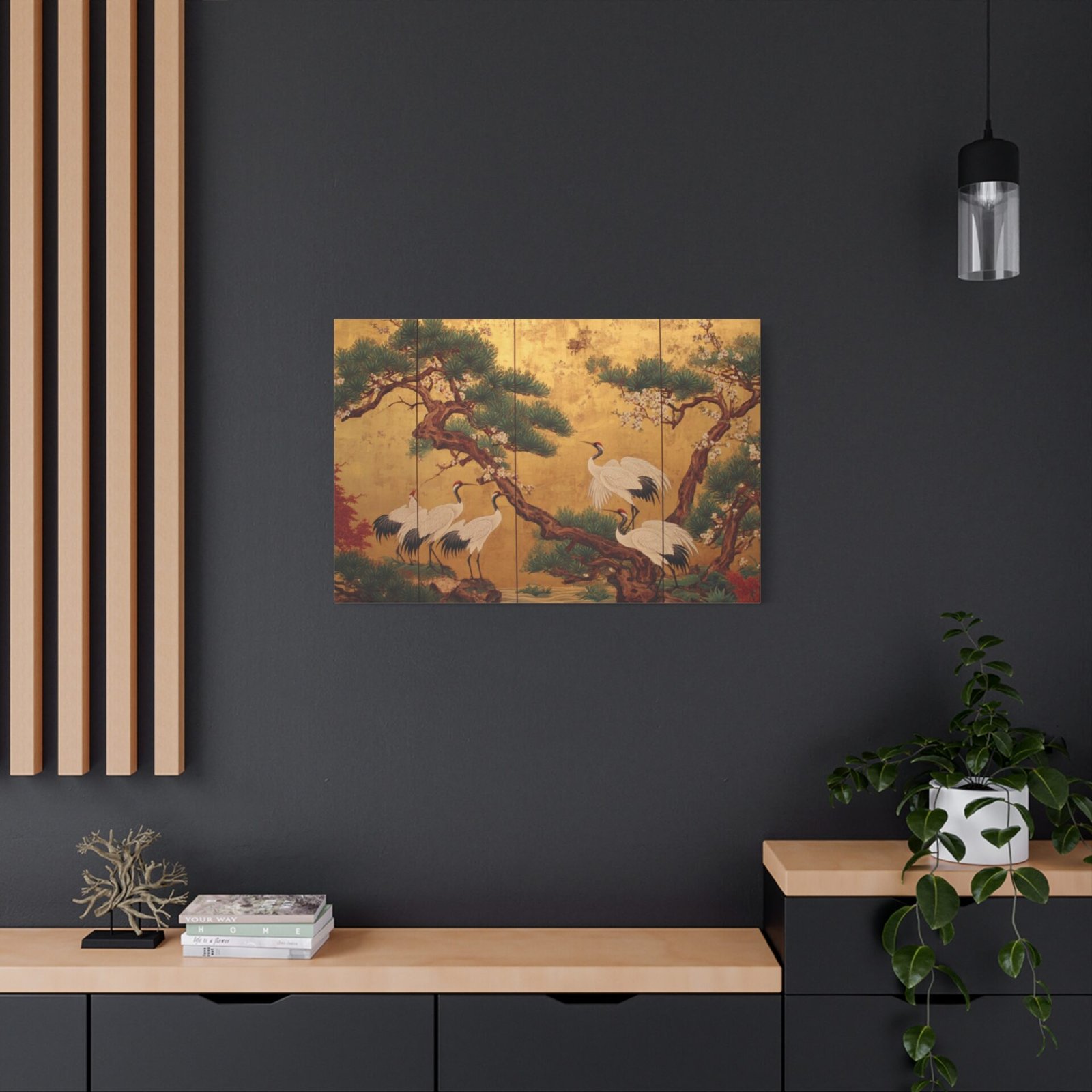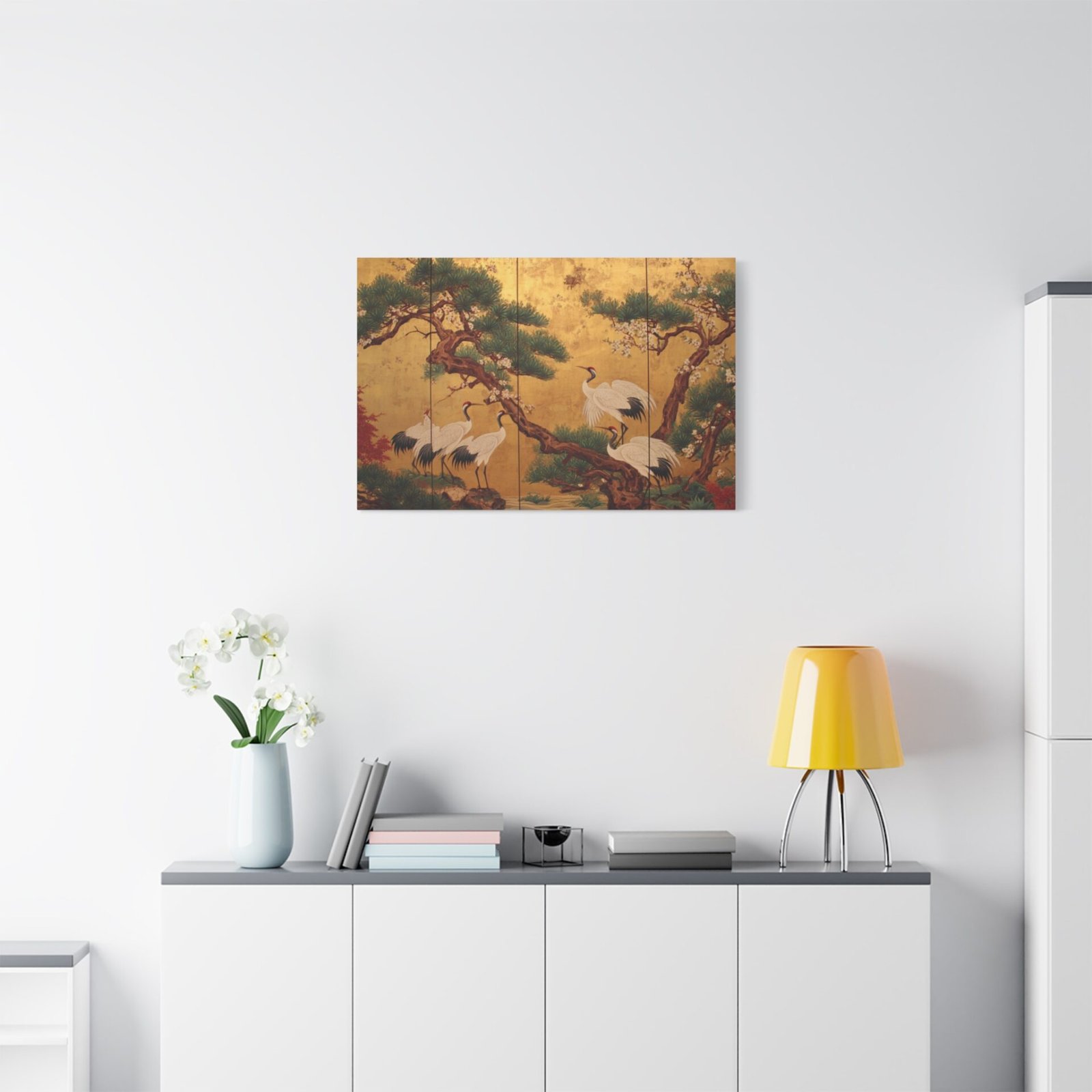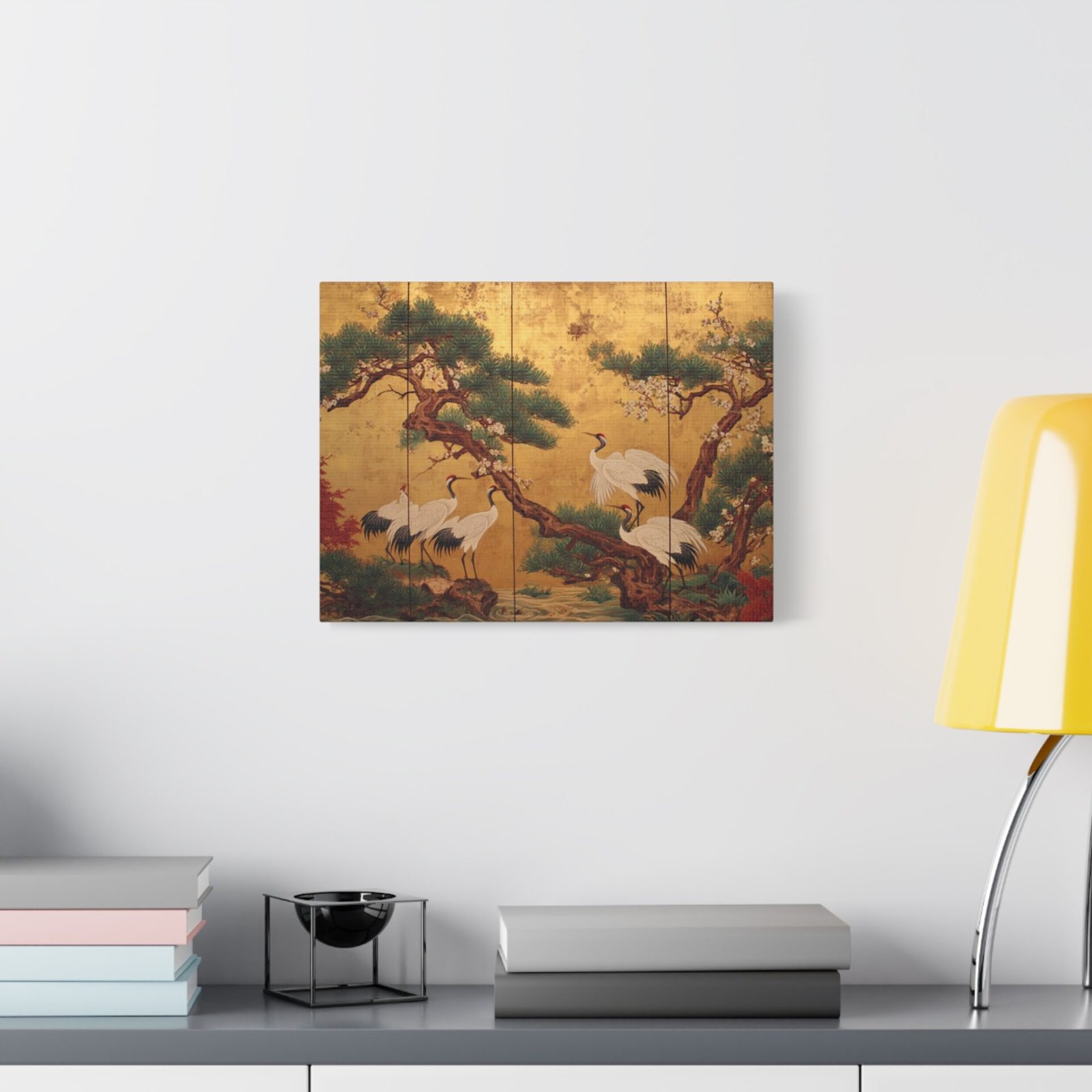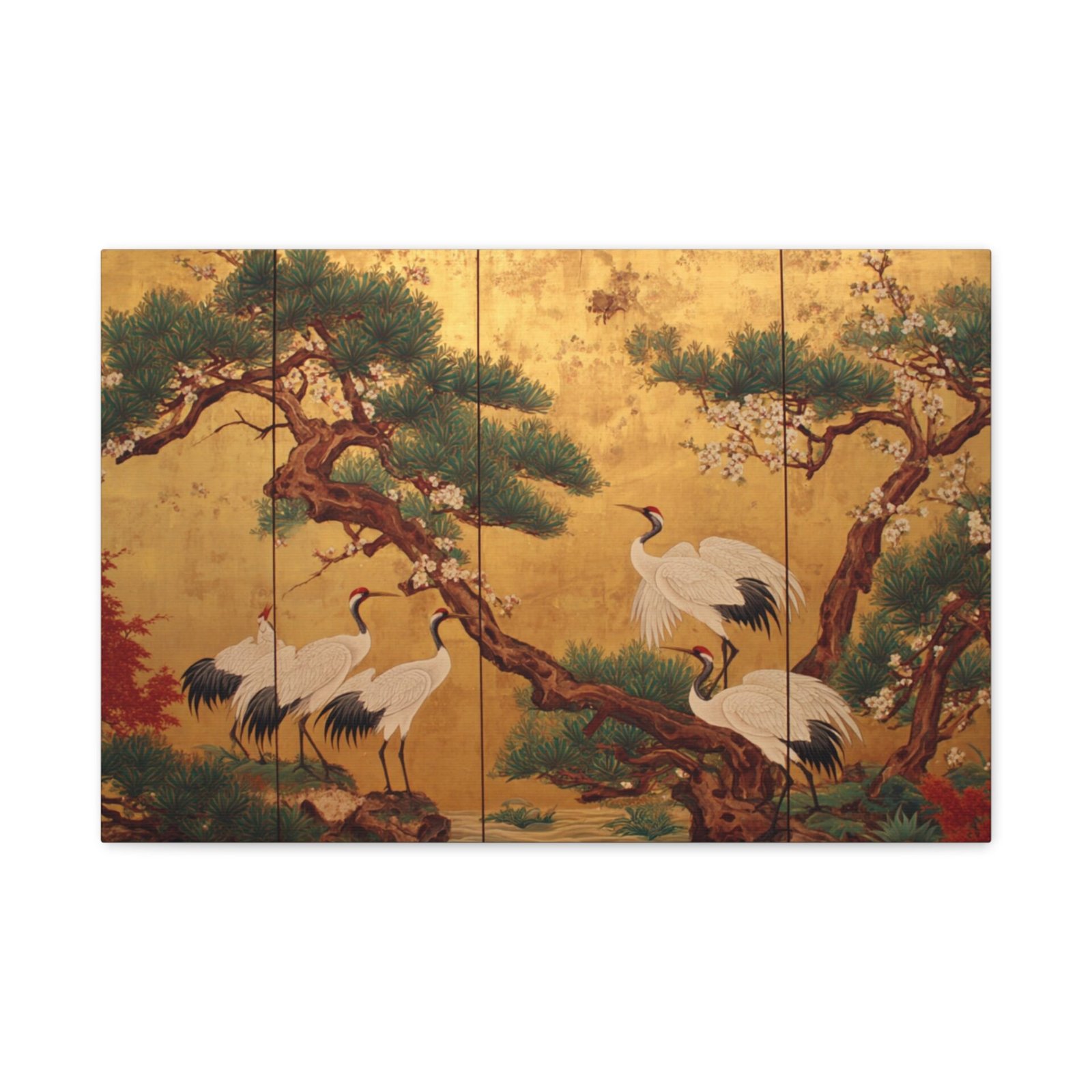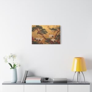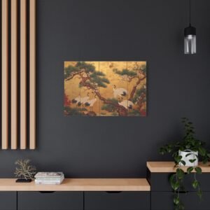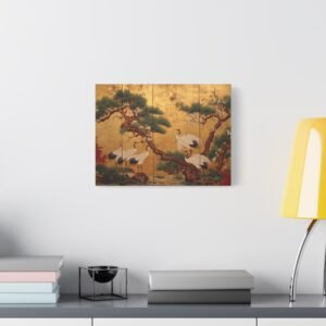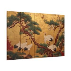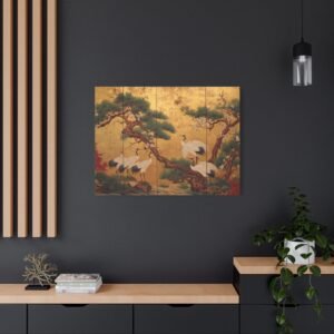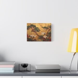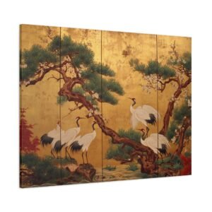 Imprégnez votre intérieur de la beauté intemporelle des saisons japonaises avec ce tableau paravent byōbu. Chaque panneau de ce chef-d’œuvre dépeint une saison distincte, du printemps fleuri de cerisiers au paysage d’hiver couvert de neige. Les grues élégantes volant à travers les panneaux ajoutent une touche de dynamisme à la composition statique. Le tableau est peint dans le style yamato-e classique, avec des détails en feuille d’or et de riches pigments minéraux. Les motifs de nuages intricats et le fleuve qui relie toutes les saisons ajoutent à la complexité de l’œuvre.