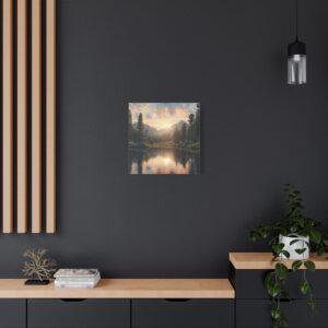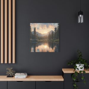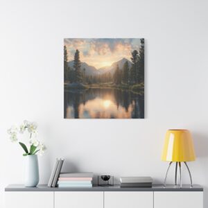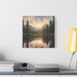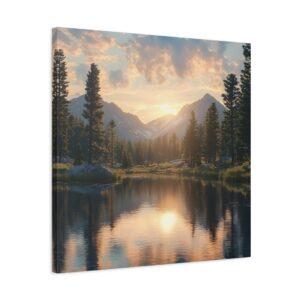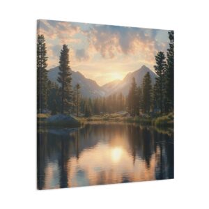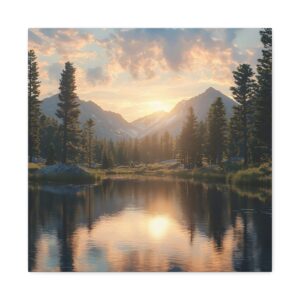 Immergez-vous dans la splendeur d’un paysage montagneux enchanteur capturé à l’heure dorée. Ce tableau saisit magistralement la magie d’un lac paisible reflétant un ciel crépusculaire, bordé de majestueux pins qui se dressent au premier plan.