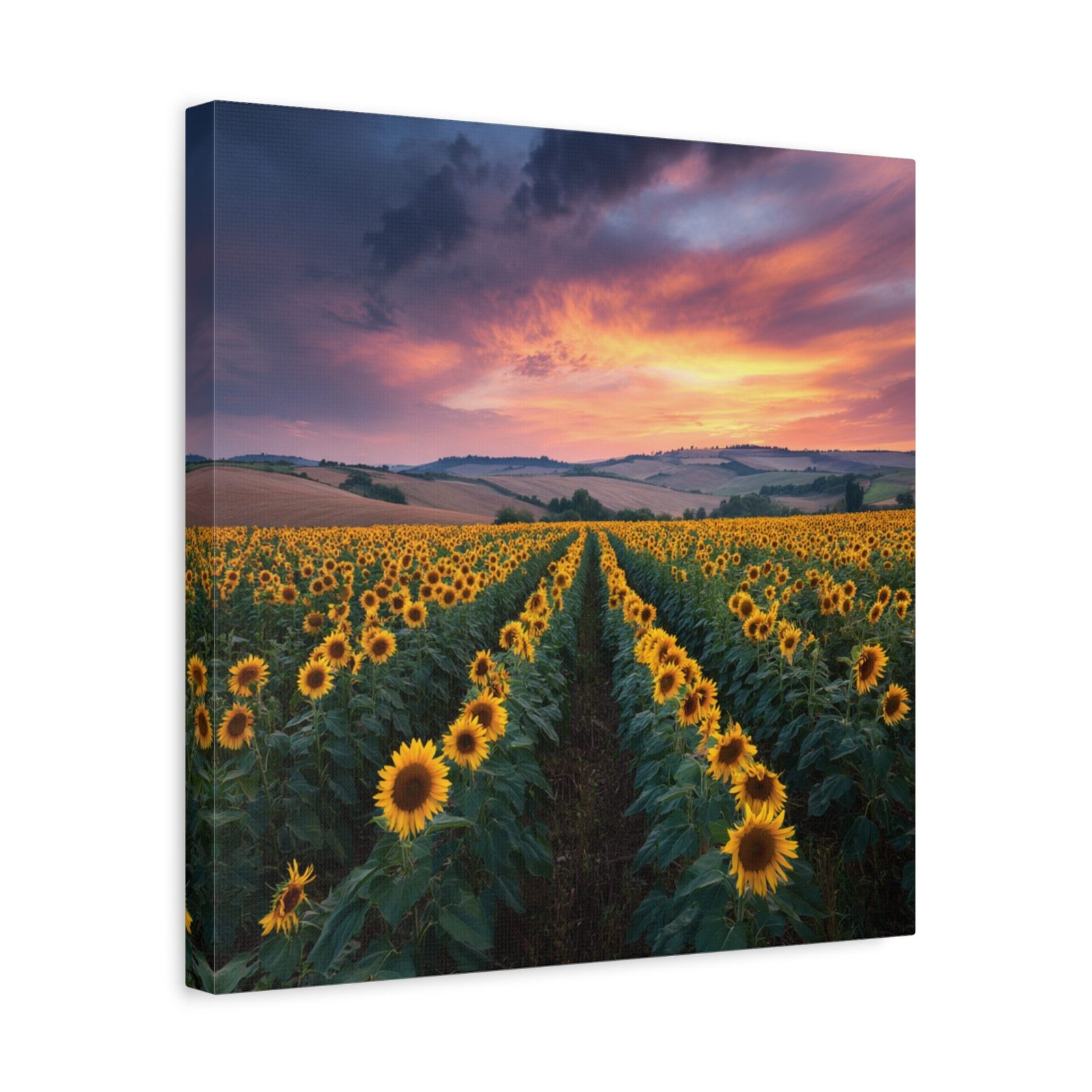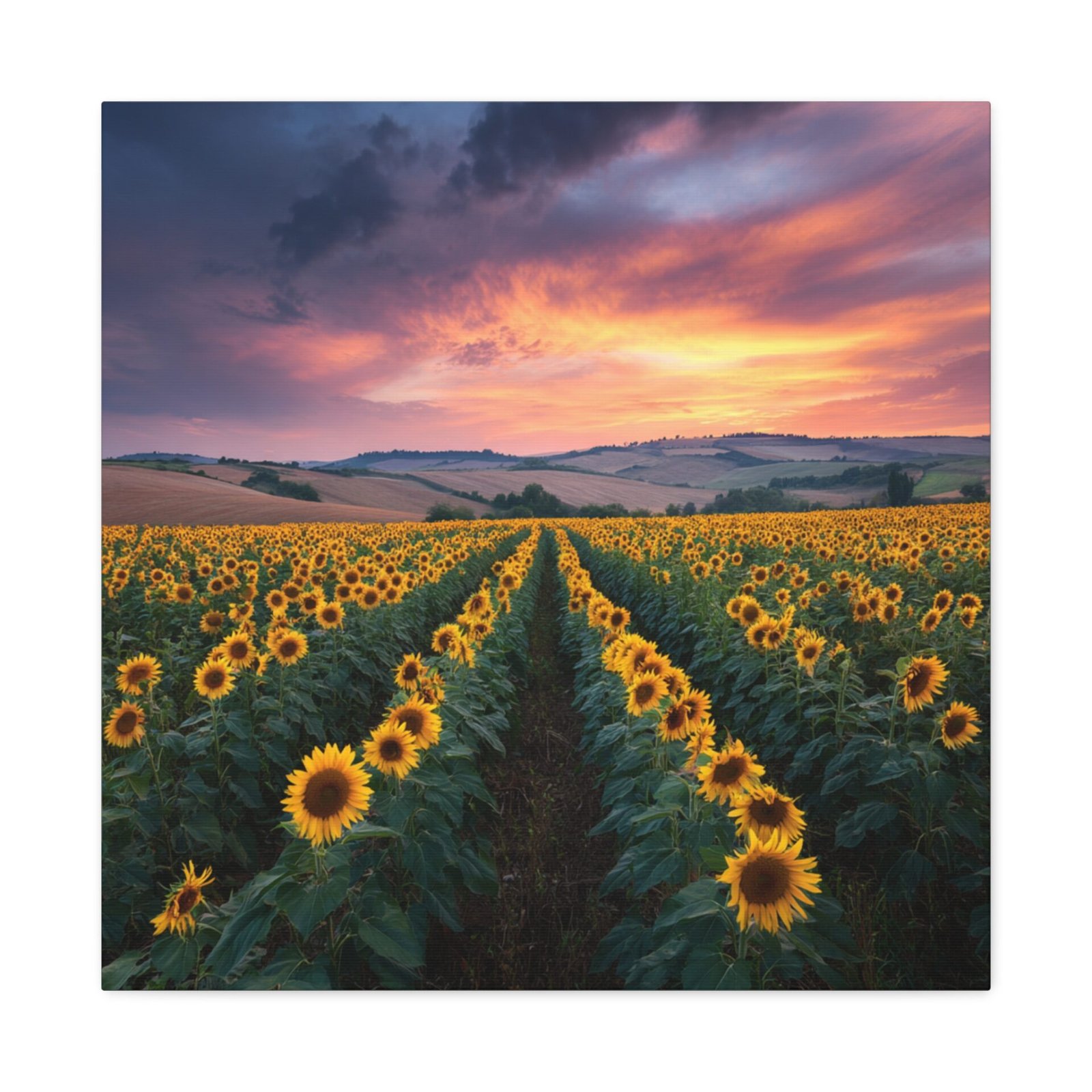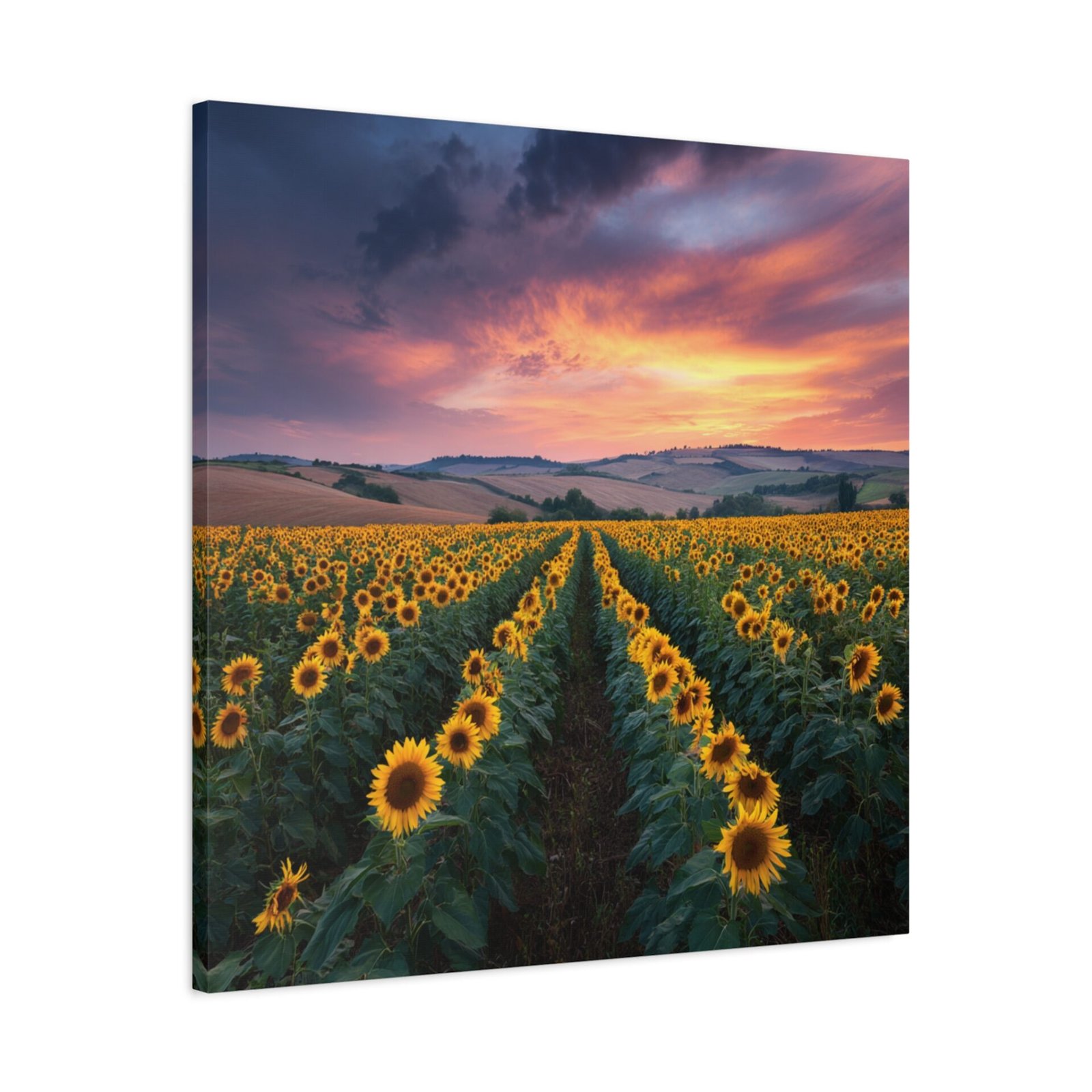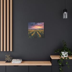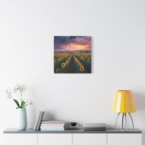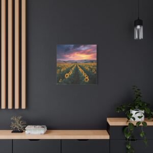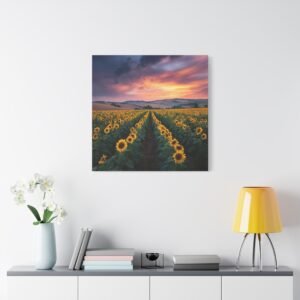 Offrez-vous une évasion visuelle avec ce tableau Paysage Tournesol. Capturée en haute résolution lors de l’heure dorée, cette photographie vous plonge au cœur d’un paysage à couper le souffle. Les rangées infinies de tournesols matures s’étendent vers les collines lointaines, sous un ciel dramatique aux nuages orange et rose. La lumière naturelle crée une profondeur et une texture saisissantes, chaque détail étant capturé avec une clarté photographique parfaite. Les fleurs jaunes vives contrastent avec le riche feuillage vert, offrant une scène pastorale de campagne idyllique.