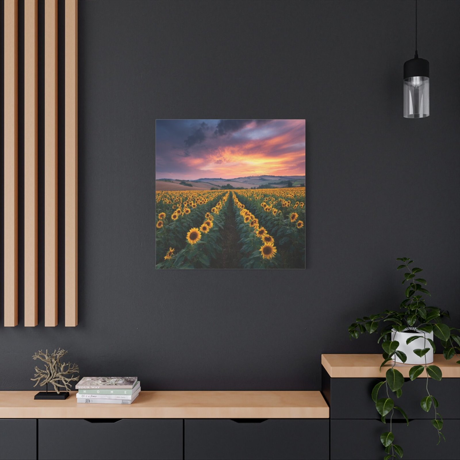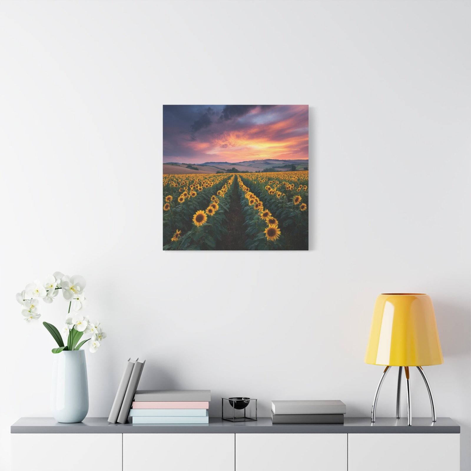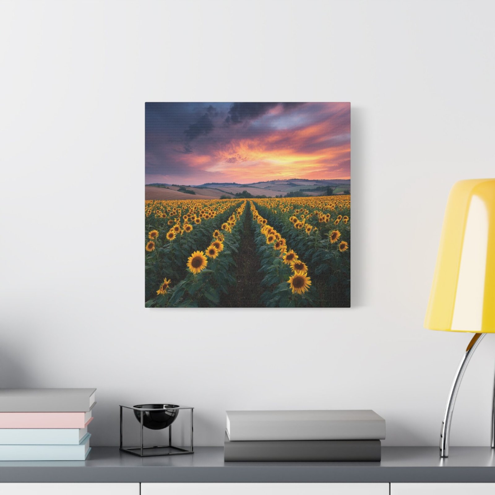 Offrez-vous une évasion visuelle avec ce tableau Paysage Tournesol. Capturée en haute résolution lors de l’heure dorée, cette photographie vous plonge au cœur d’un paysage à couper le souffle. Les rangées infinies de tournesols matures s’étendent vers les collines lointaines, sous un ciel dramatique aux nuages orange et rose. La lumière naturelle crée une profondeur et une texture saisissantes, chaque détail étant capturé avec une clarté photographique parfaite. Les fleurs jaunes vives contrastent avec le riche feuillage vert, offrant une scène pastorale de campagne idyllique.