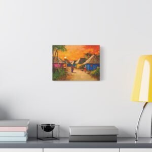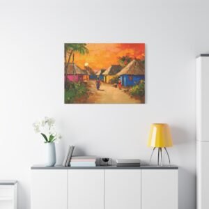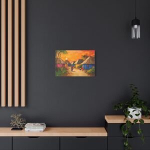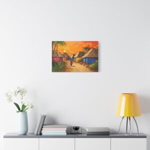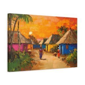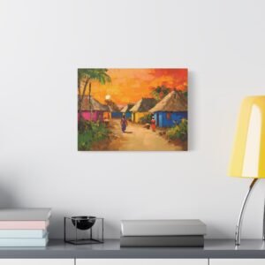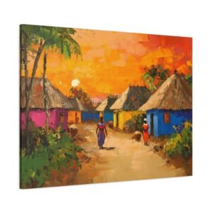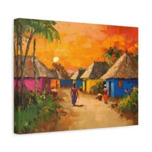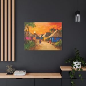 Son format vertical 2:3 en fait une pièce maîtresse idéale pour sublimer un mur de salon ou une entrée spacieuse. L’énergie qui émane des huttes colorées et de la végétation luxuriante insuffle une ambiance chaleureuse à votre intérieur. Les tons terreux lumineux s’accordent parfaitement avec des meubles en rotin ou des textiles aux motifs géométriques.
