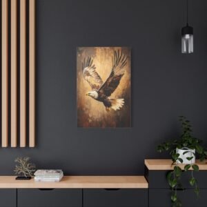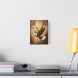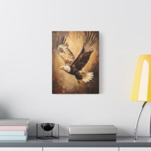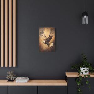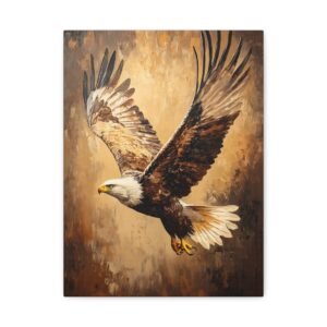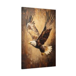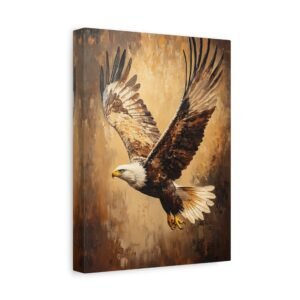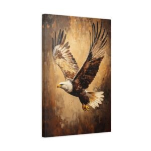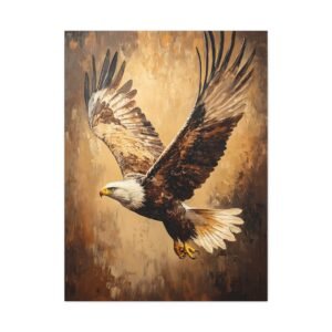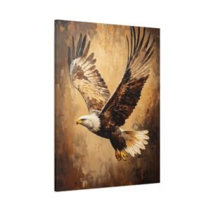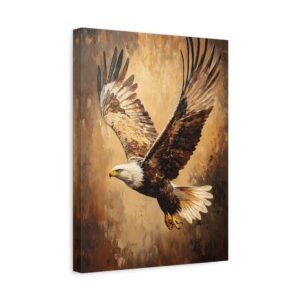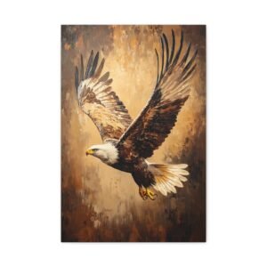 Admirez la force brute et l’élégance de ce tableau d’aigle saisissant. Les coups de pinceau expressifs en technique impasto capturent magistralement le mouvement des ailes déployées, tandis que la lumière dorée sublime chaque plume de ce rapace majestueux. Les tons terreux riches créent une profondeur visuelle stupéfiante.