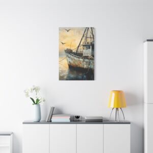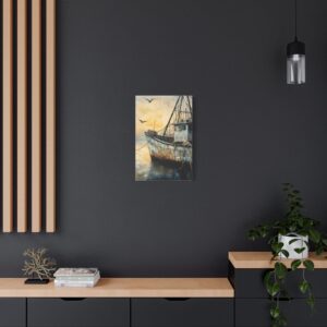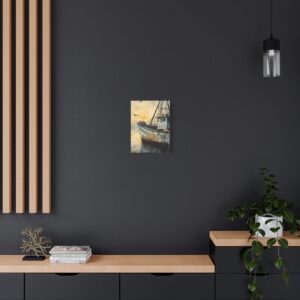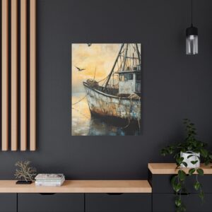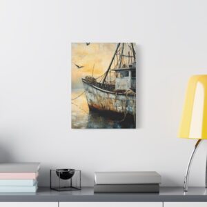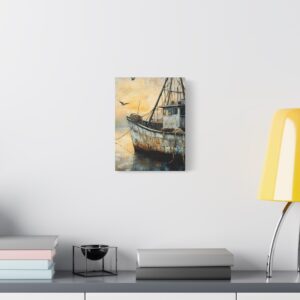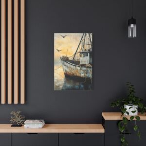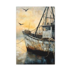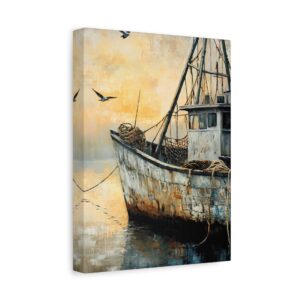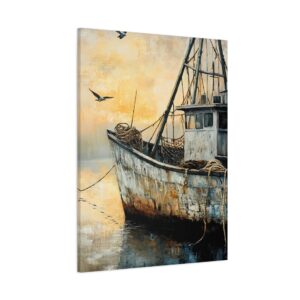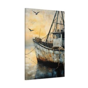 Plongez dans l’ambiance authentique des ports de pêche avec cette peinture évocatrice capturant un bateau de pêche traditionnel dans la lumière dorée de l’aube. La coque patinée et les filets de pêche minutieusement détaillés témoignent d’une vie maritime riche en histoire.