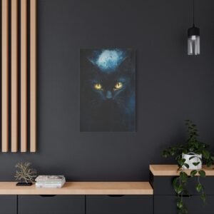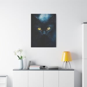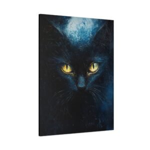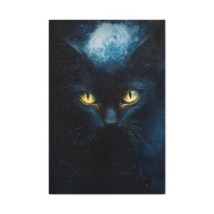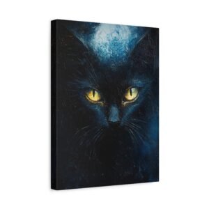 Laissez-vous envoûter par cette œuvre mystérieuse mettant en scène un majestueux chat noir aux yeux d’or étincelants. Cette création impressionniste contemporaine capture l’essence même de la nuit, où les bleus profonds dansent avec les noirs intenses dans une atmosphère captivante.