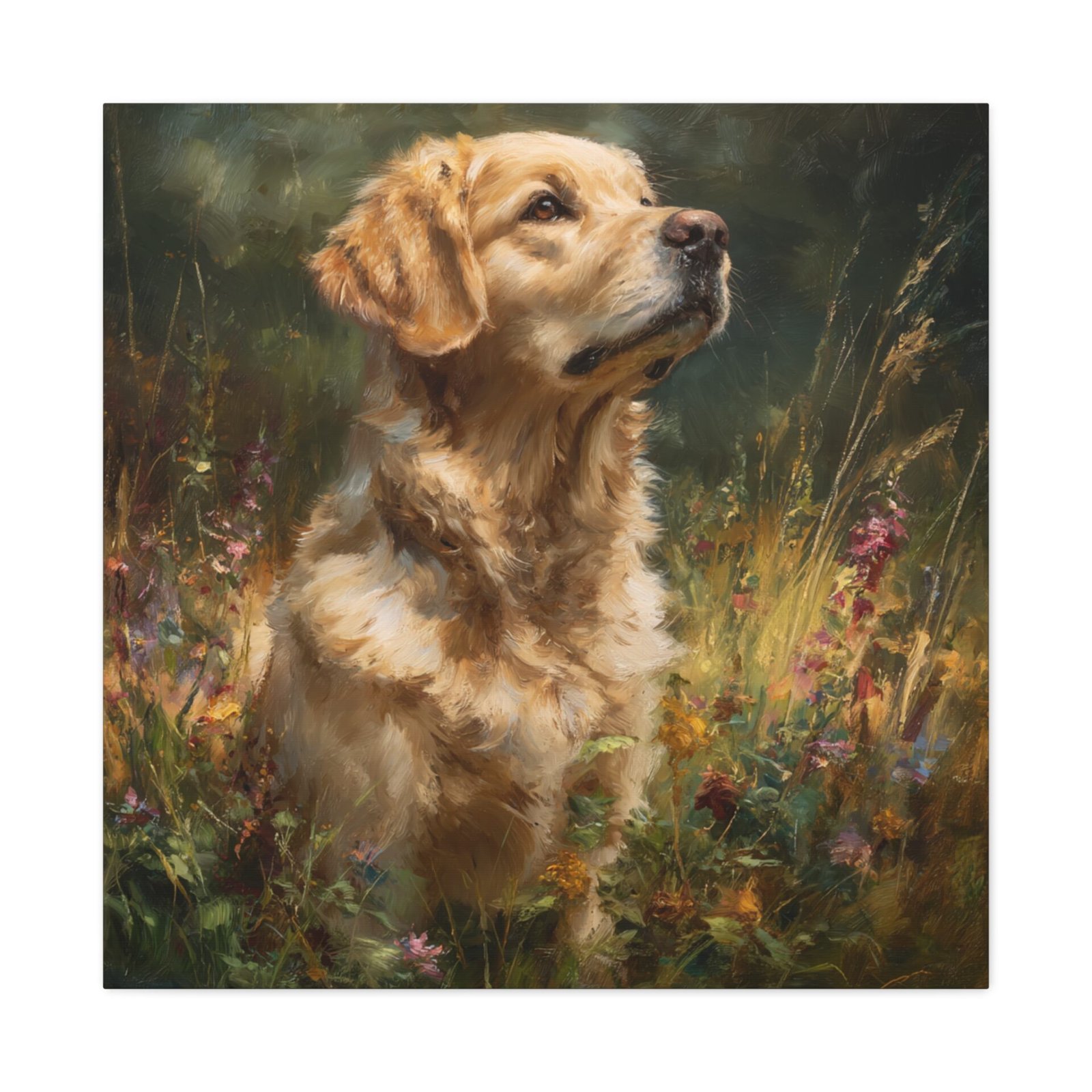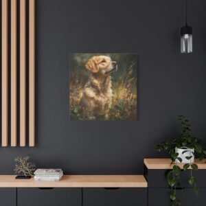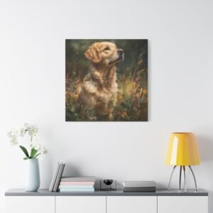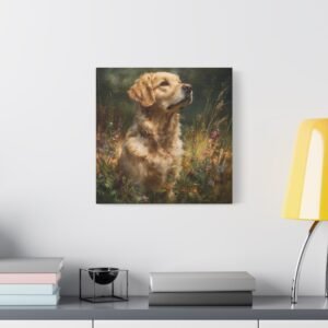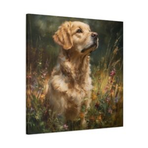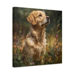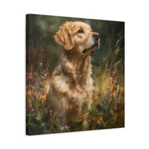 Sublimez votre intérieur avec ce magnifique Tableau Peinture Golden Retriever. L’œuvre dépeint un Golden Retriever majestueux, assis dans une prairie baignée de soleil. Son pelage doré capture la lumière, tandis que ses yeux bruns expriment une douceur inégalée. Il est entouré de fleurs sauvages colorées et d’herbes hautes qui dansent au gré du vent. Le fond flou et lumineux, parsemé de taches de soleil filtrant à travers les arbres, ajoute une touche de poésie à l’ensemble. La palette de couleurs chaudes, mêlant ors, ambrés et verts, donne vie à cette peinture de style classique, aux détails minutieux et à la texture réaliste.
