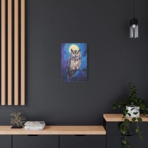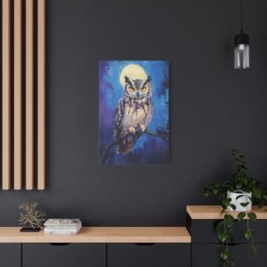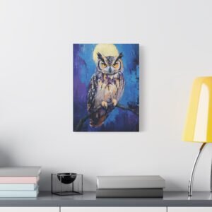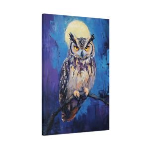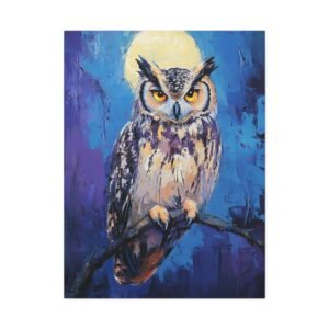 Plongez dans l’atmosphère mystérieuse de la nuit avec ce tableau envoûtant d’un hibou majestueux. Les teintes profondes de bleus et de violets, rehaussées par l’éclat doré des yeux du rapace, créent une ambiance onirique qui transformera instantanément votre espace.